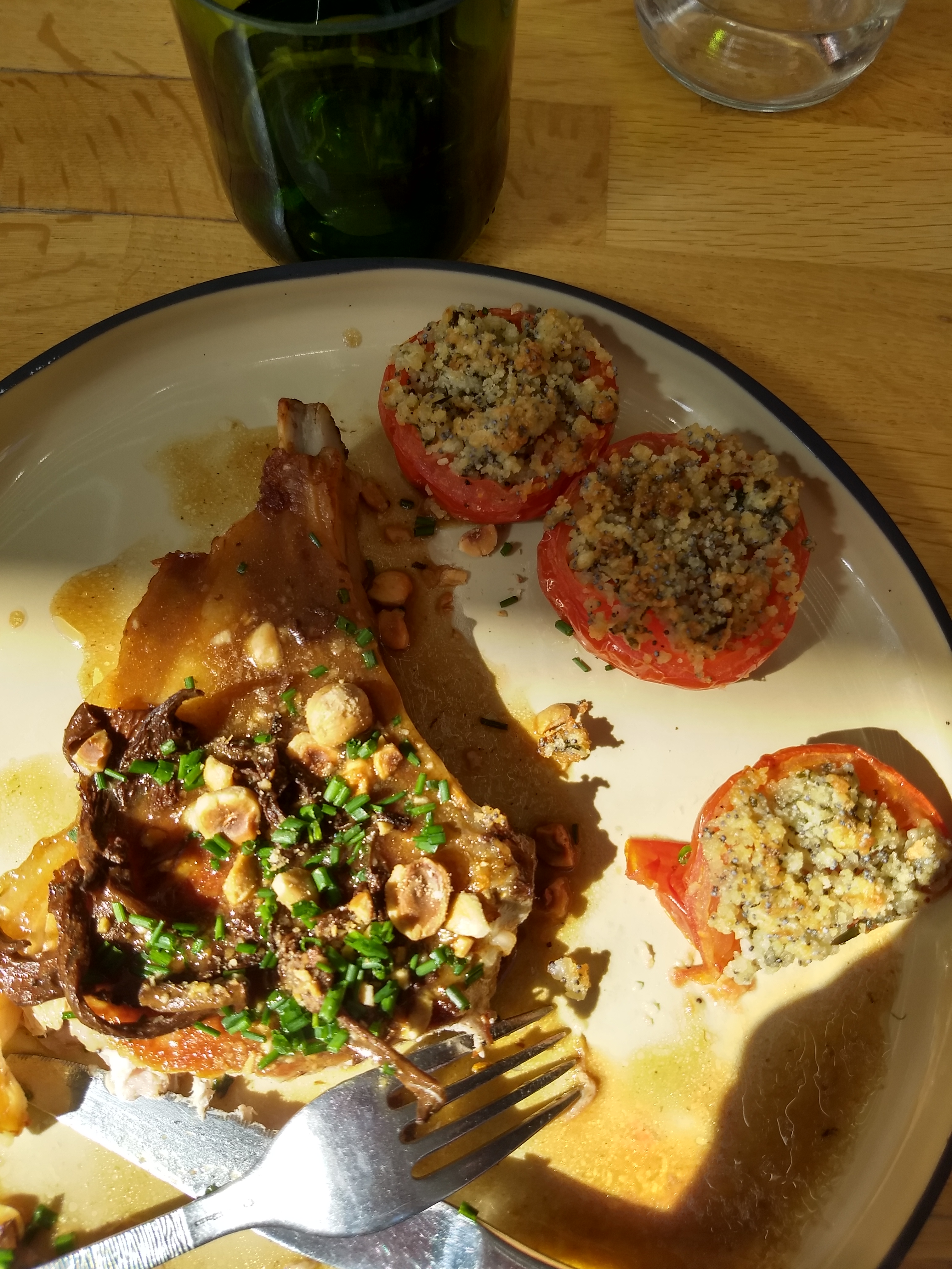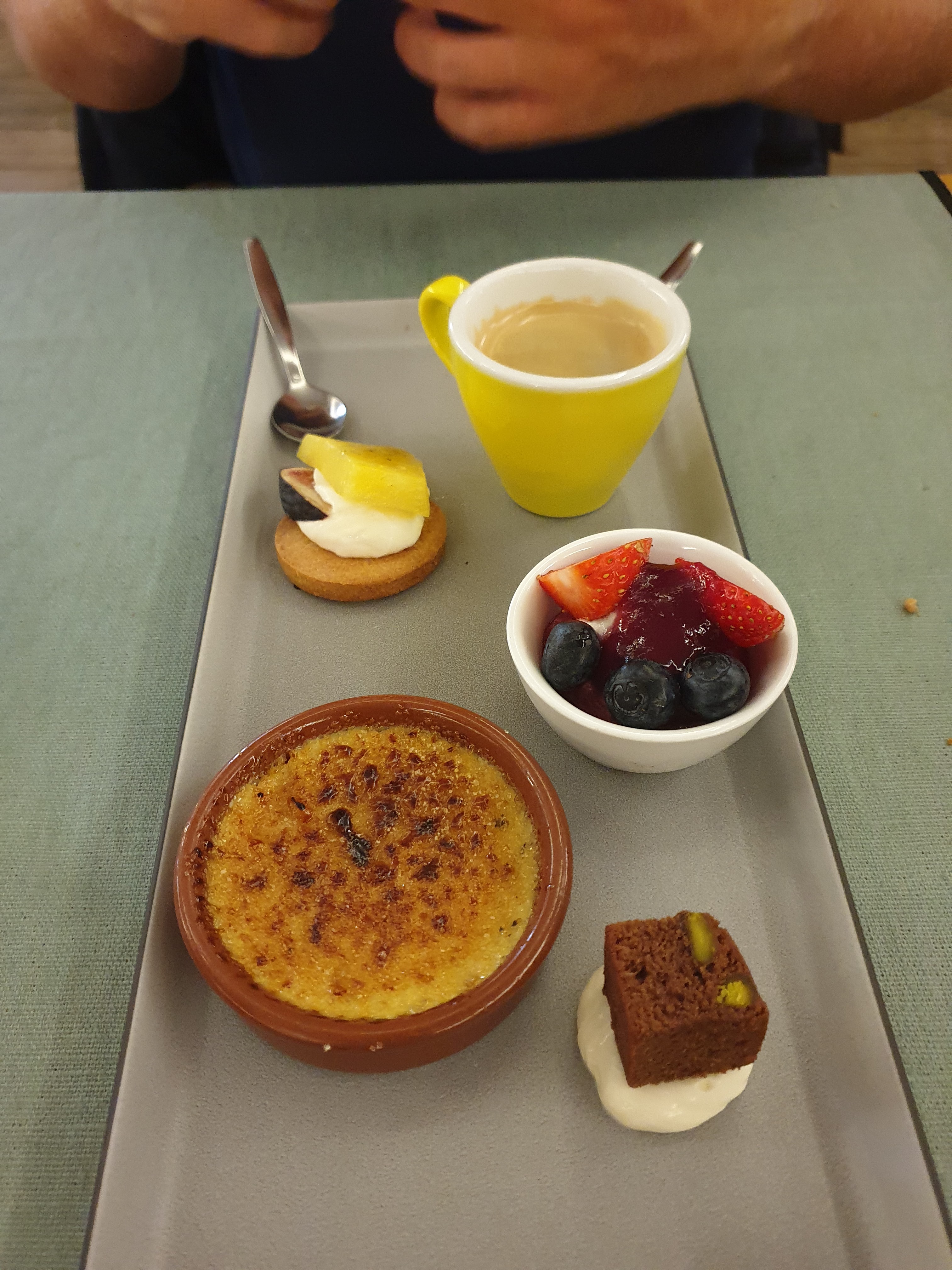 Déjeuner ce jour avec 2 amies. Menu Quasi de veau à la Fève de Tonka/tomates en crumble et crème brûlée aux algues après un petit Spritz. Je me suis régalée 😋