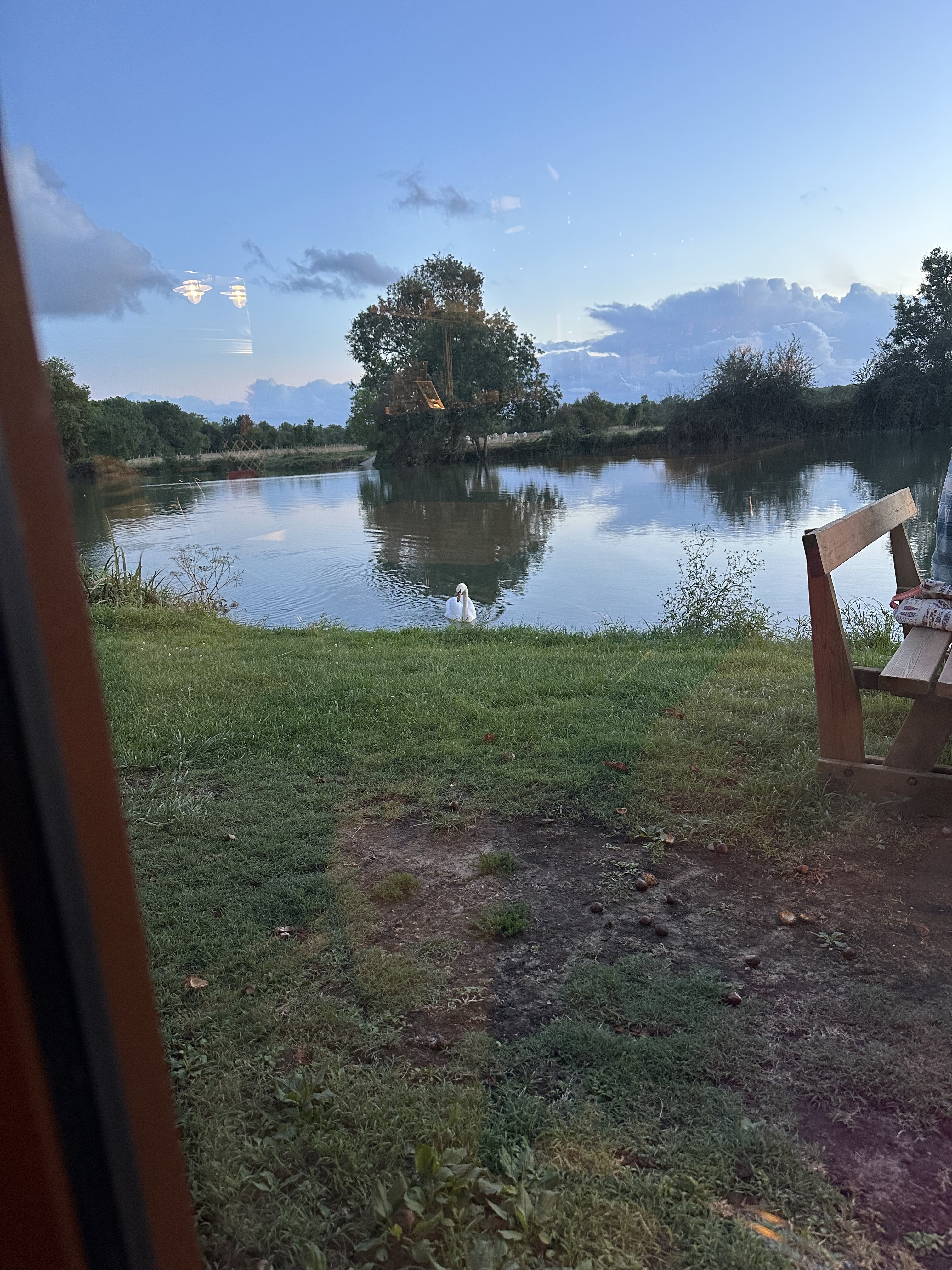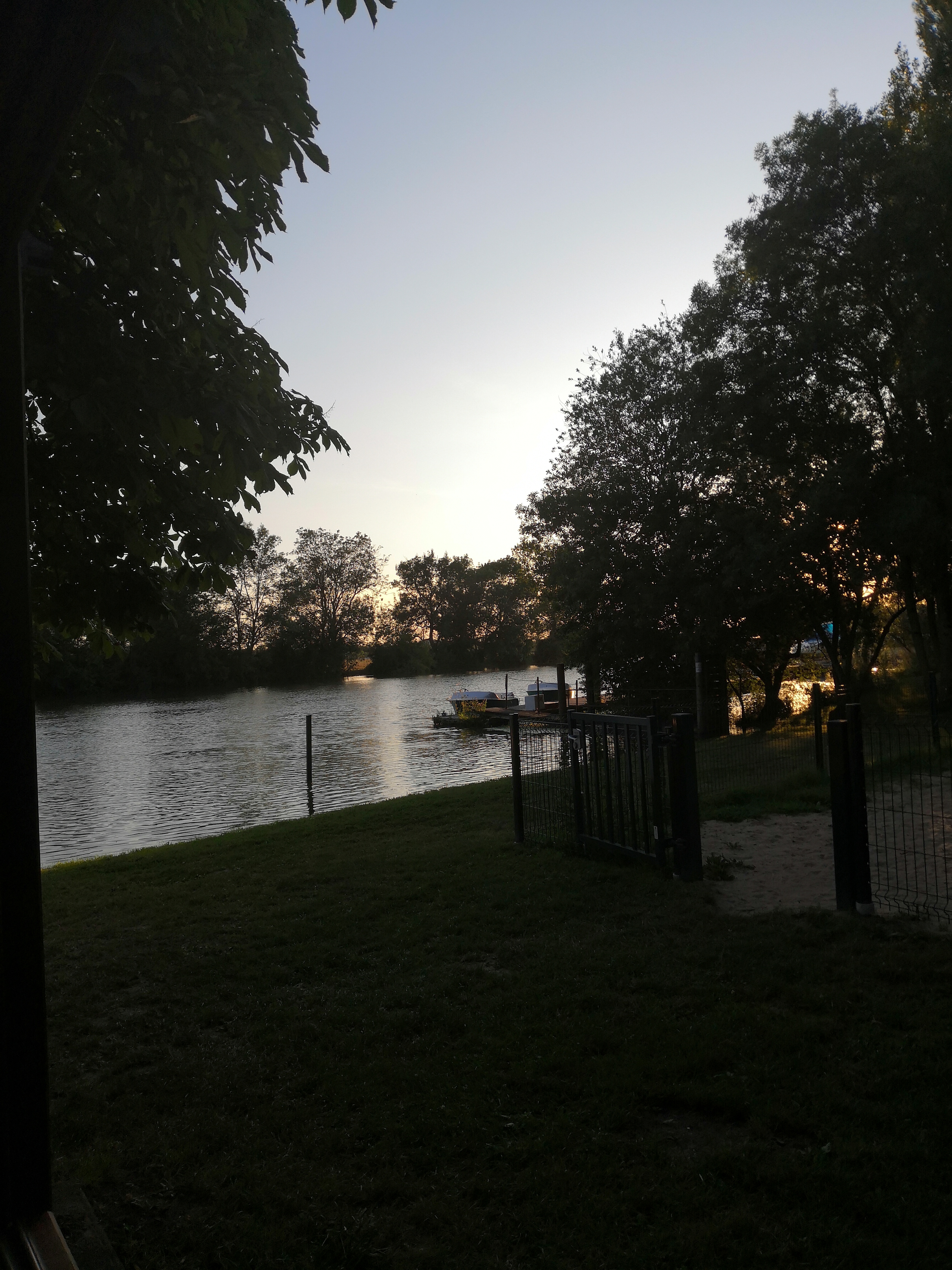 Endroit tranquille au bord de la rivière. J'ai bu une bière et regardé passer des canoës, des planches à pagaie, des bateaux et quelques cygnes. Il y avait des caravanes là-bas, mais je ne pourrais pas vous donner les détails. La bière était fraîche et la nourriture est servie aux horaires français habituels.