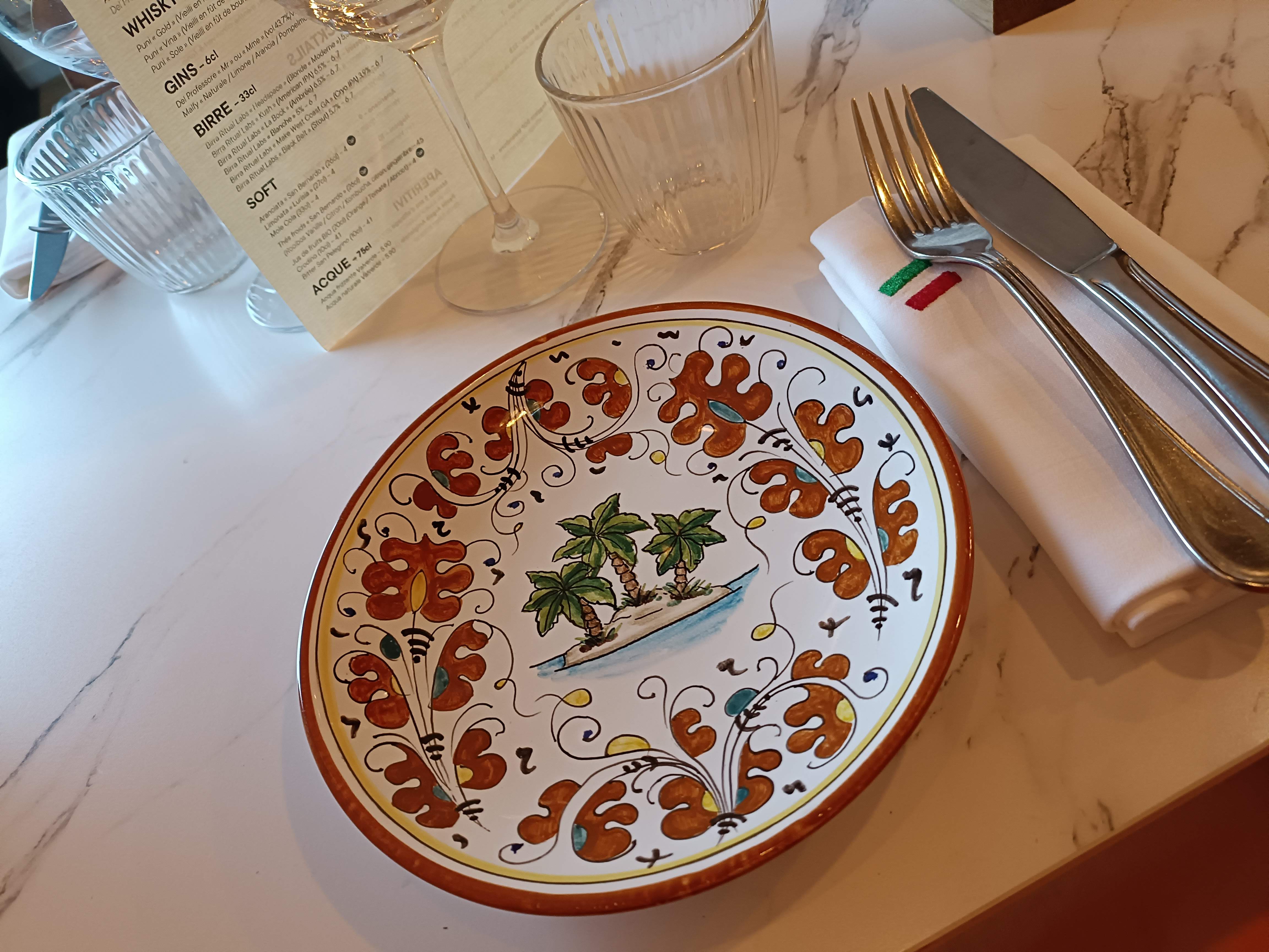 Restaurant avec une belle ambiance. Les tables sont espacées, c’est agréable. La carte des plats est en italien avec traduction en français. On se croirait en Italie. Très bon moment passé là bas avec de très bon plats.