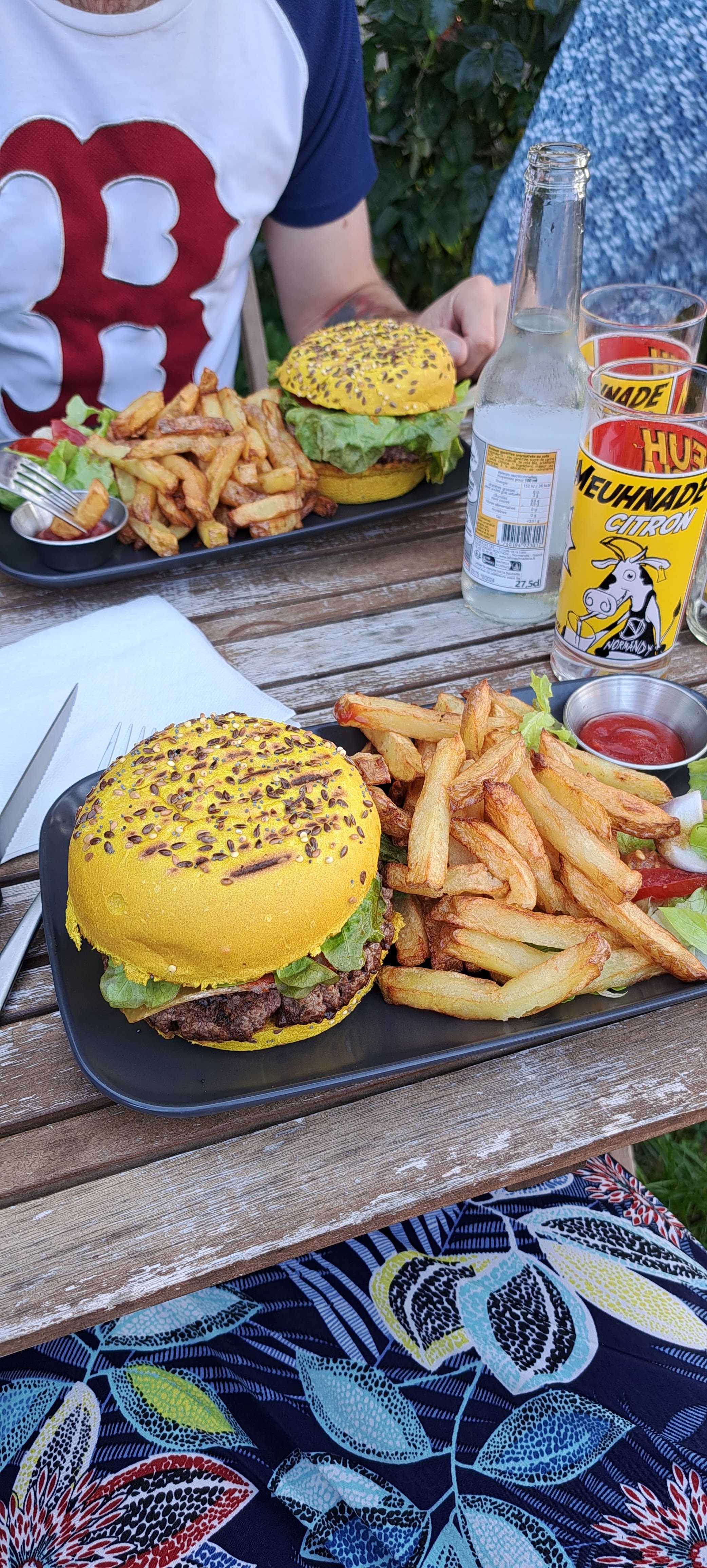 Nous avons tous pris le burger. Très bon. Le goût du fromage est relevé, c est la spécificité de ce burger.et c est comme ça qu on l aime. Excellentes frites. Un petit cidre comme il faut. Une table au soleil couchant. Les gens du coin.... ils se connaissent ,discutent d une table à l autre, et cela crée une bonne ambiance. Les chiens se laissent caresser gentiment, et le noir va jouer avec mes enfants, qui lui lancent un jouet.. On fait du tir à l'arc... On profite... bonheur.