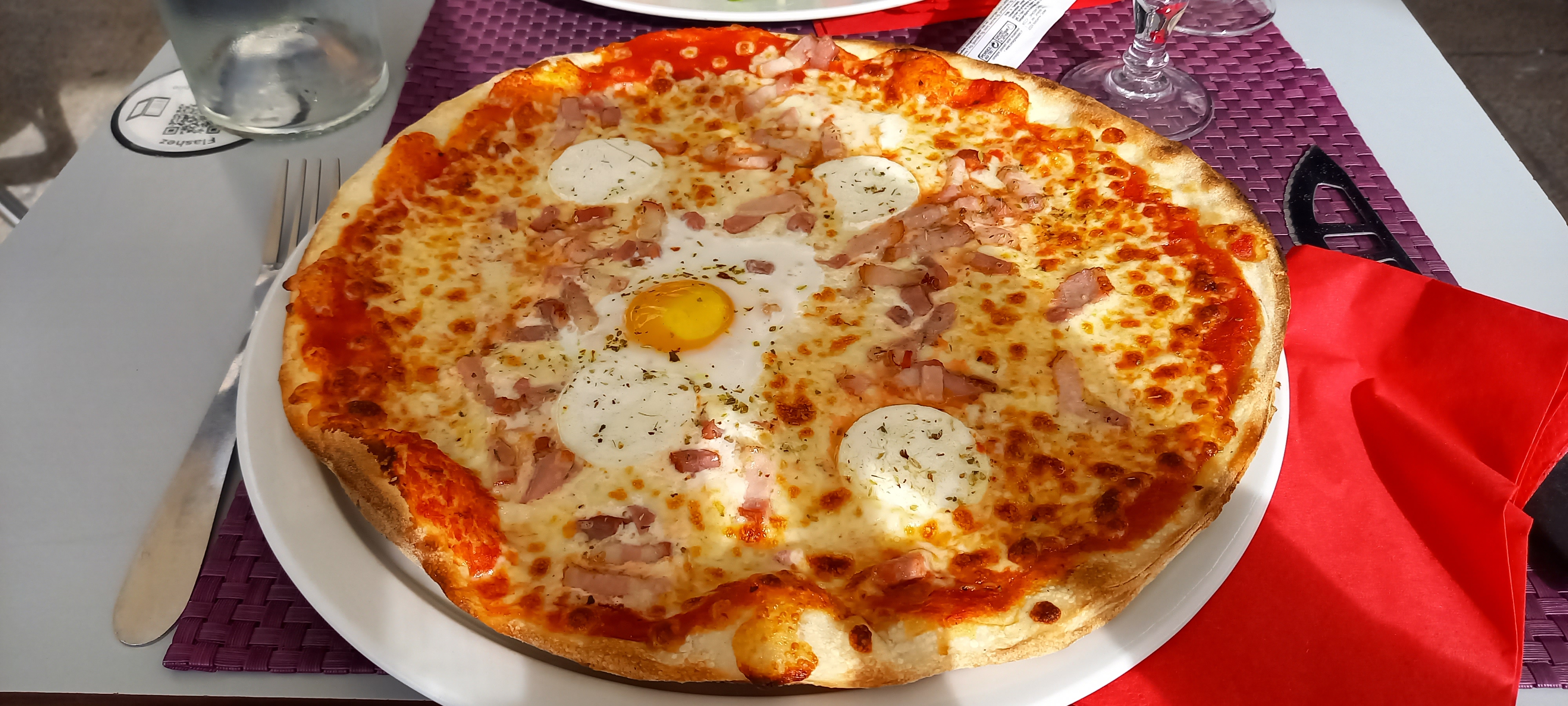 Bon point en arrivant, bouteille d’eau fraiche du robinet et deux verres déposés sur la table. Bon accueil, service un peu lent. Mais, je n’ai pas trouvé le jambon et les olives prévus dans la garniture de ma pizza italienne.