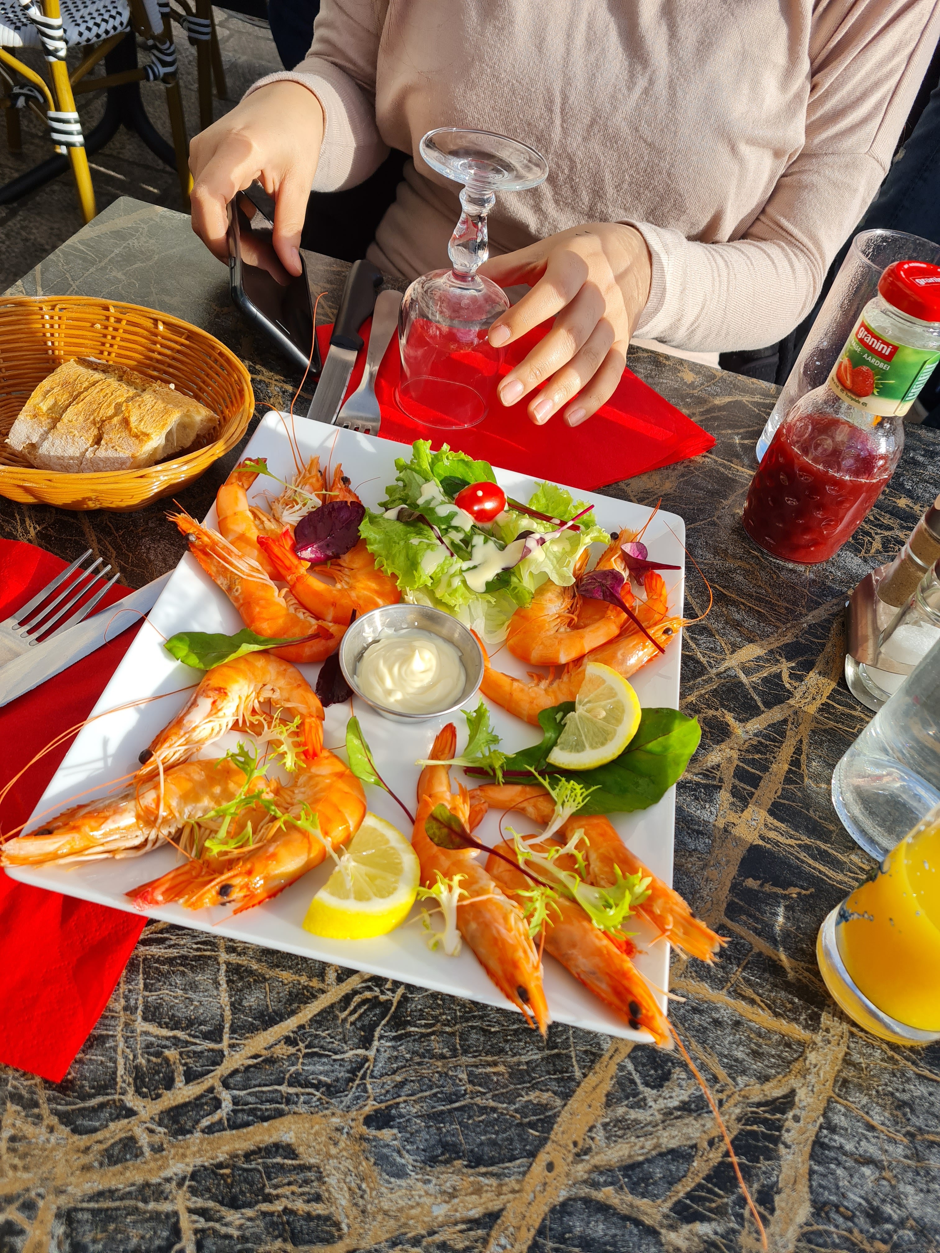 Un vrai attrape touriste ! Très peu de saumon (une seule petite tranche posée sur les pâtes )avec les tagliatelles, 15 euros pour 9 crevettes non décortiquées avec petit pot de mayonnaise. Les moules trempent dans l’eau…