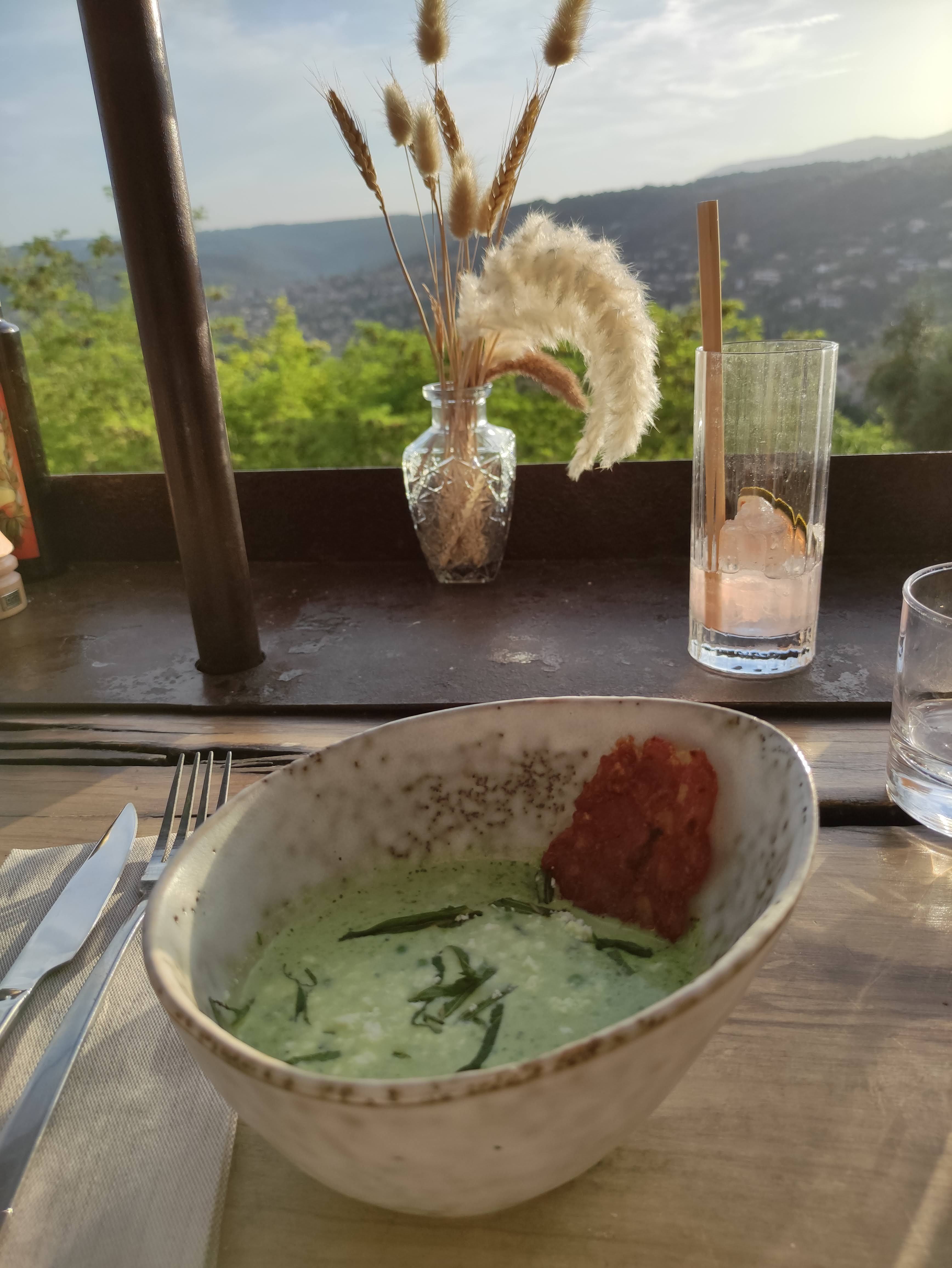 La vue est superbe, l'accueil soigné. Le cocktail est bon, à 14 euros heureusement ! Le trio de houmous est constitué de trois micro bols , un de tzatziki, un de caviar d'aubergine et un de houmous. Les gressins sont maison et très bons. Dispendieux et classy . Ne cherchez pas l'authenticité.