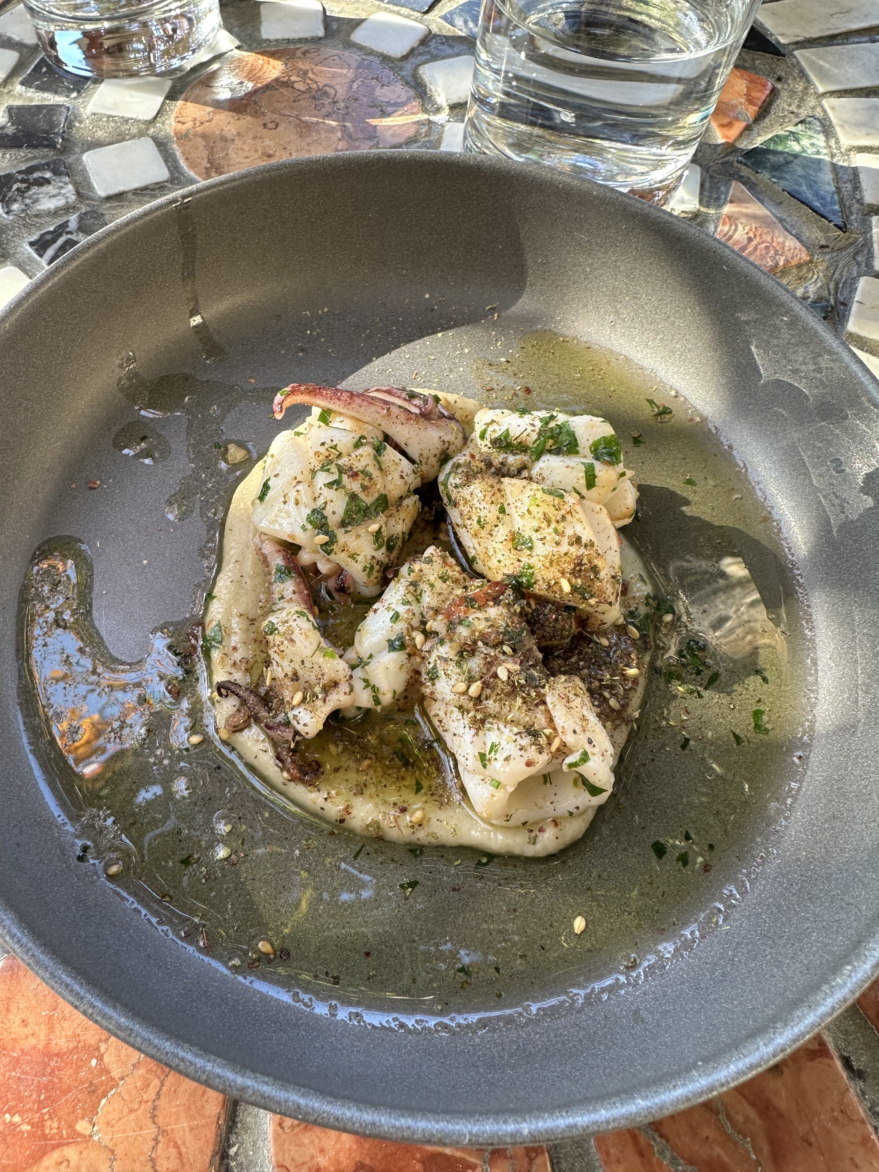 Tout d’abord nous avons était séduit par le cadre et l’ambiance qui règne dans ce restaurant. Nous avons était déçu lorsque le serveur nous a annoncé qu’il n’y avait pas de mezze deux entrées à la carte car tout avait était vendu …. Du coup notre choix s’oriente sur des plats chauds poulpe et seviche. Le serveur annonce que le poulpe n’est pas un plat copieux donc je choisi les raviolis qui étaient bon mais pas non plus un plat généreux et chargé dans l’assiette. Le seviche de ma femme lui convenait . Les desserts étaient bon même si la tarte du jour était petite également pour 10 euros. Bref si vous cherchez des plats généreux ce n’est pas la bonne adresse…. Pour des prix quand même élevés.