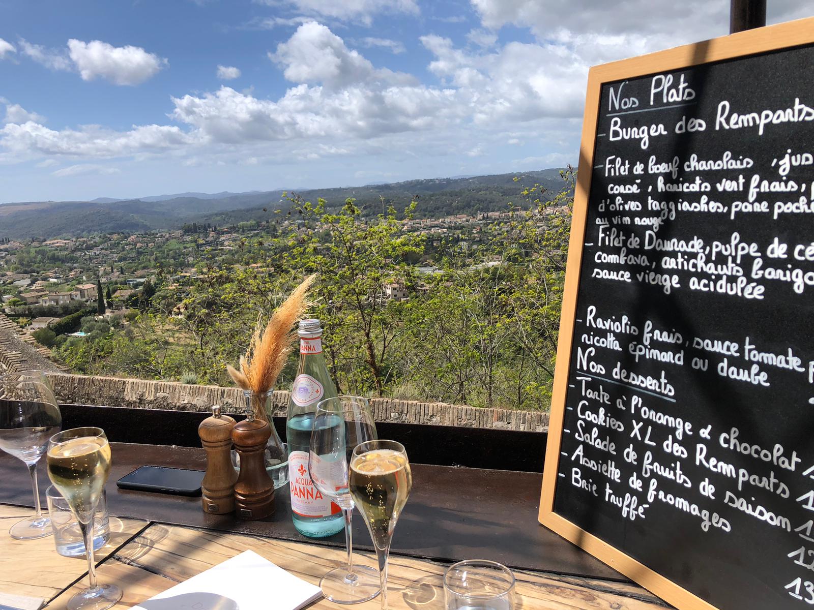 Ce n'est pas une tâche aisée de résumé en quelques mots une si belle expérience, je ferais au mieux : Situé sur les remparts du charmant village de Saint- Paul de Vence, le cadre est idyllique, la vue est superbe et la terrasse ombragée est très bien décorée. Le service est rapide et efficace, les serveurs sont avenants et très sympathiques. La carte des plats proposes des mets divers et variés, très bon et très bien introduit par les serveurs. Enfin, la spécialité de ce restaurant se cache dans les multiples cocktails orignaux proposés à un prix très raisonnable. Les boissons sont incroyablement riche en saveur. Pour conclure, si vous comptez visiter Saint Paul de Vence et ses environs, faites une escale aux Remparts, vous ne serez pas déçu.