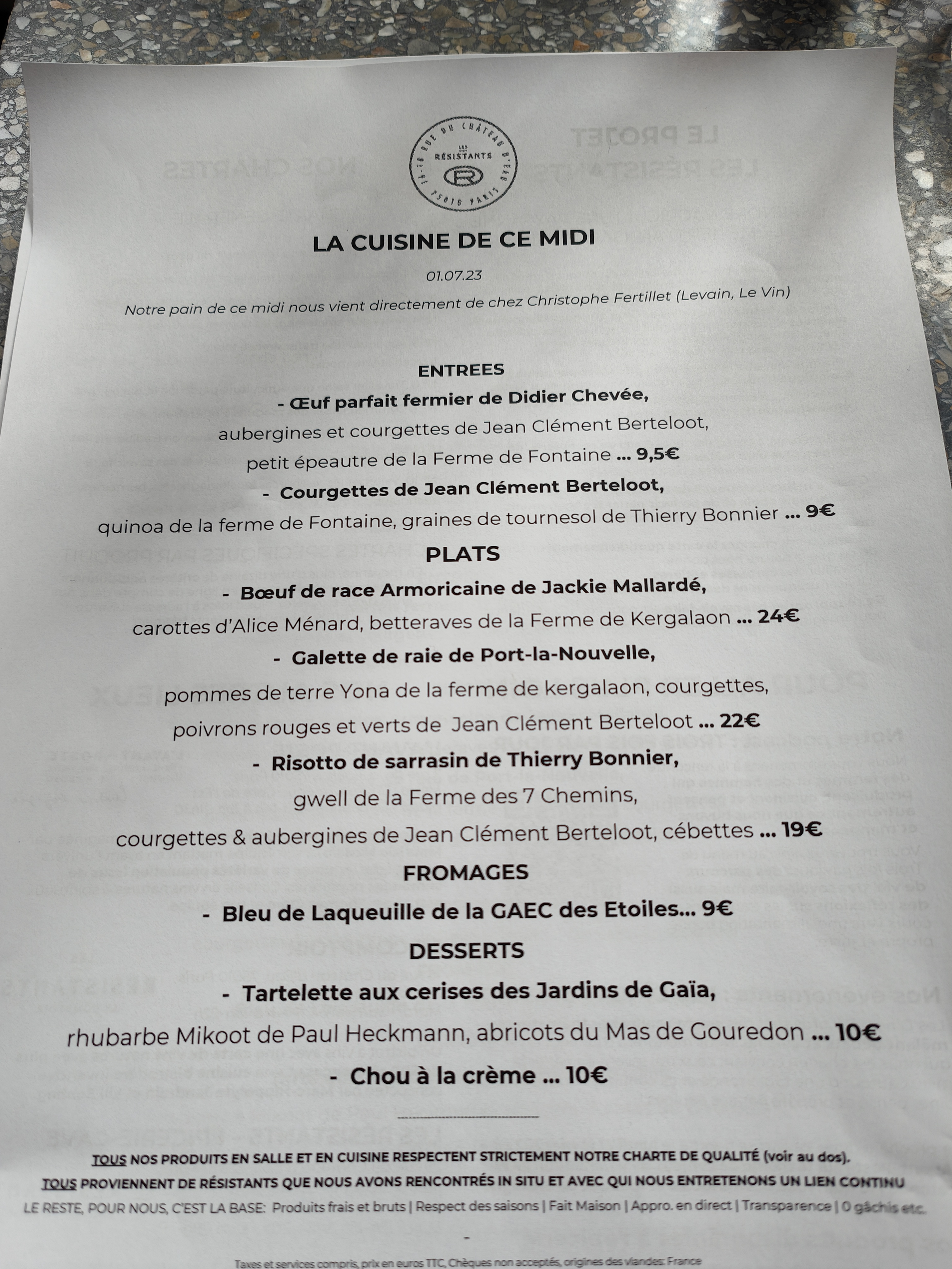 Première fois aux résistants : un succès ! Nous attendons de revenir une seconde fois pour confirmer notre avis. En attendant, j'ai personnellement eu un coup de cœur sur le service chaleureux et efficace, les plats ont été servis très vite et étaient très bons, les produits très bons et bien cuisinés. Si la promesse du lien avec le paysan/producteur est bel est bien là, alors le rapport qualité prix est très très bon. J'attends notre deuxième visite, voir si nous pouvons être surpris davantage, on a je crois manqué légèrement de surprise en bouche lors de ce dîner.