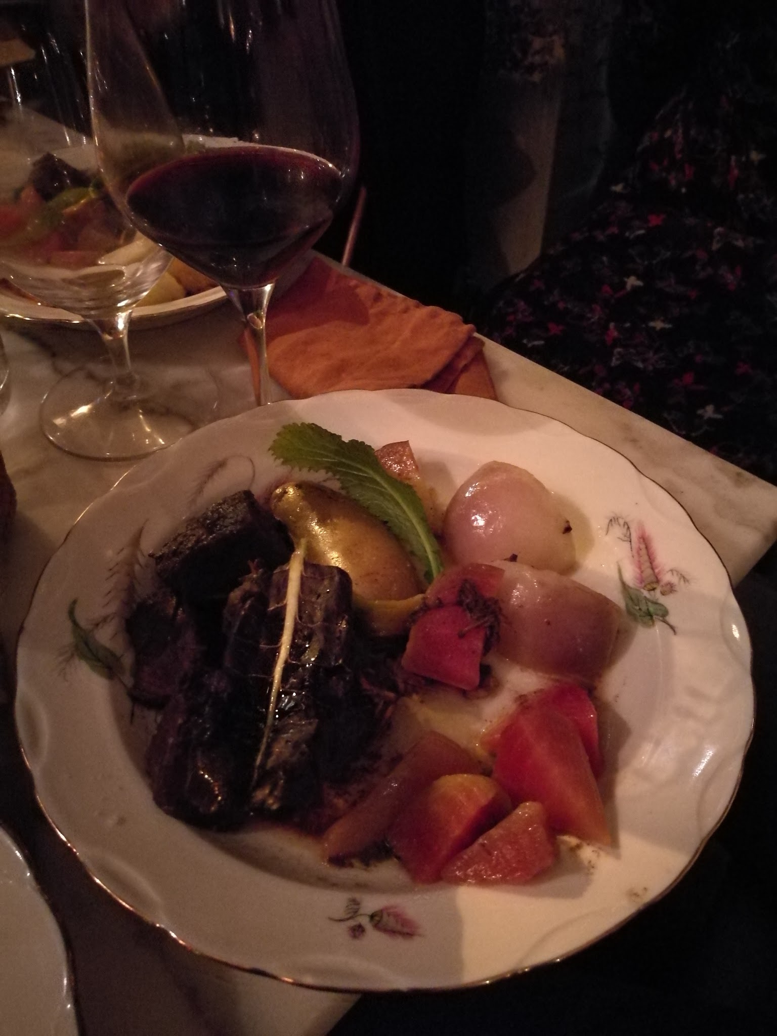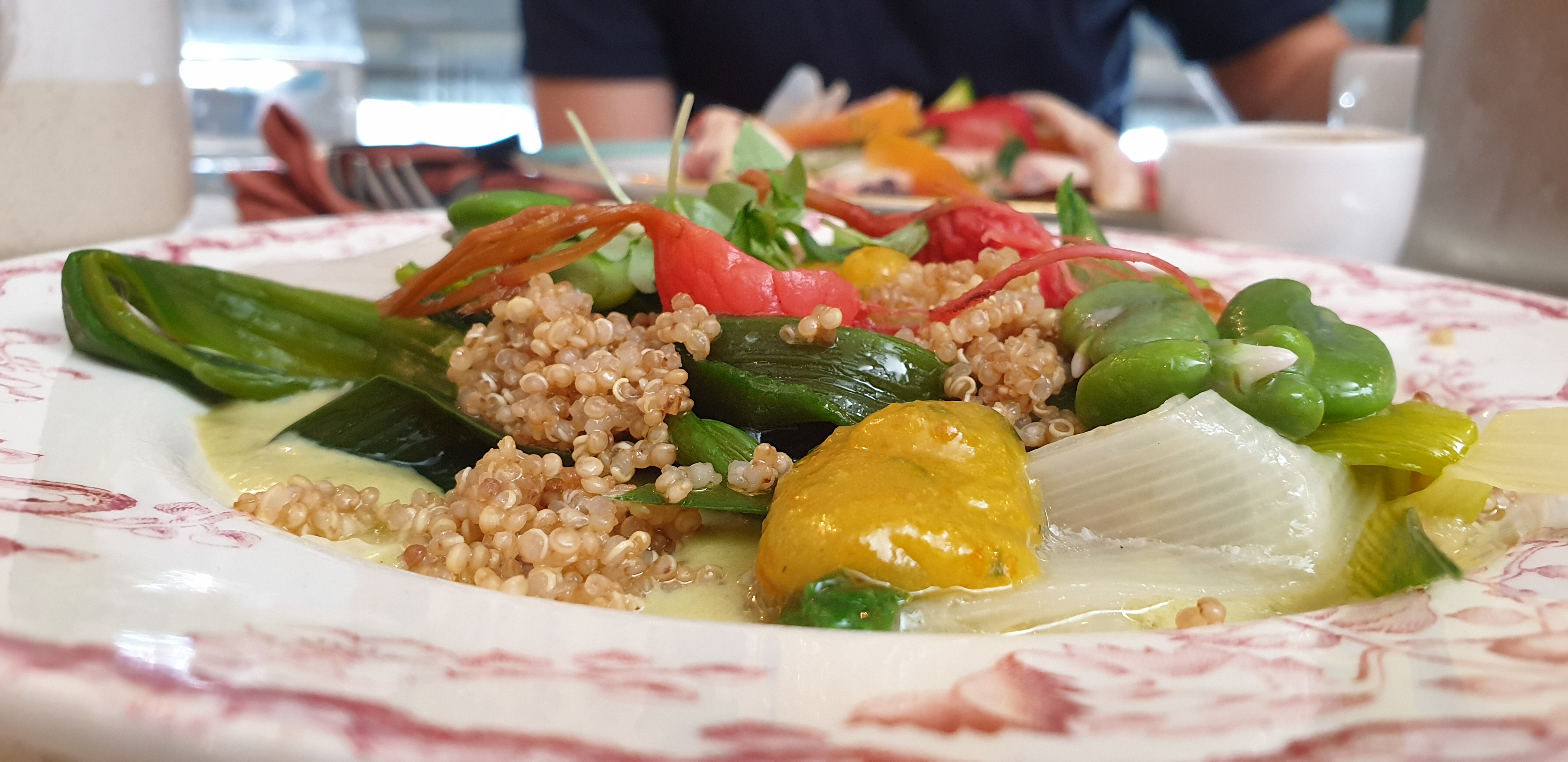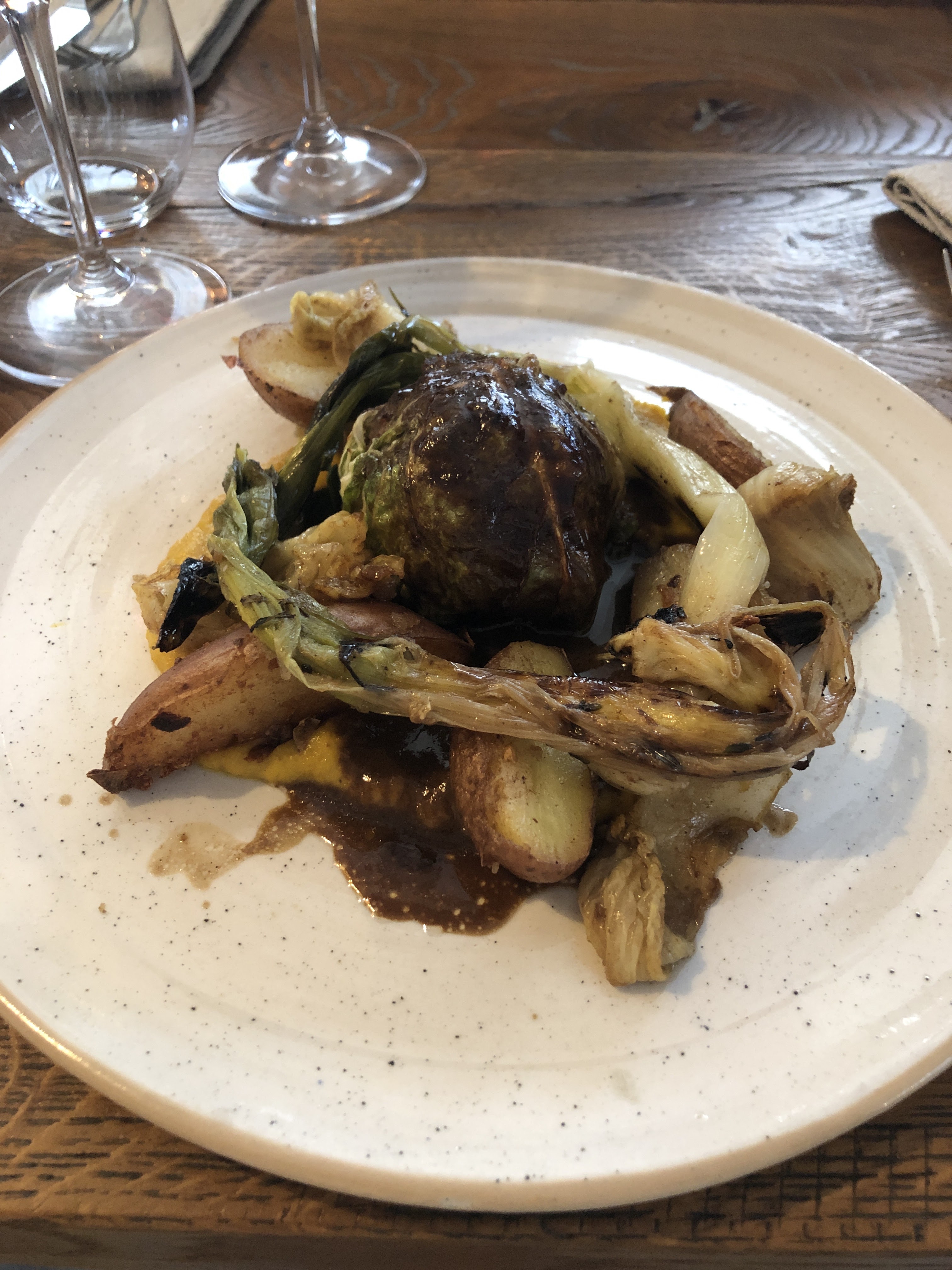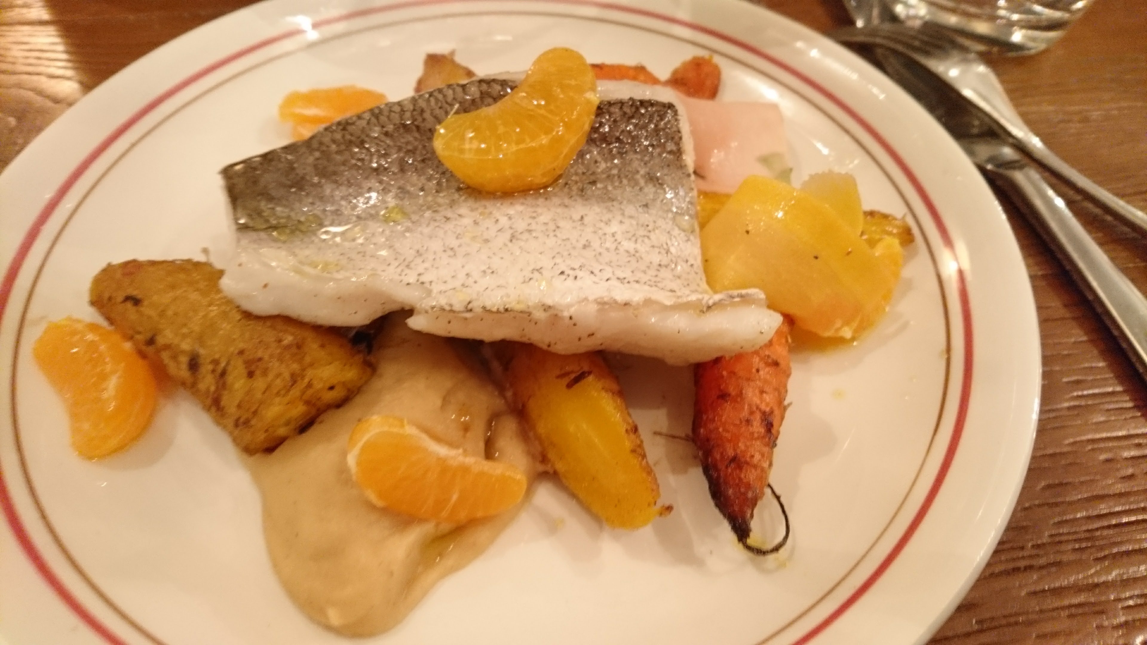 Nous avons passé un bon moment en mangeant d'excellents plats beaux et riches en légumes. Les quantités sont suffisantes. Petit bémol que j'ai oublié de signaler au serveur : il reste parfois de petits grains de sable dans les légumes. La personne qui m'accompagnait n'a pas eu ce problème. La carte des vins est pléthorique, nous avons pris deux verres un peu au hasard et ils étaient fabuleux.