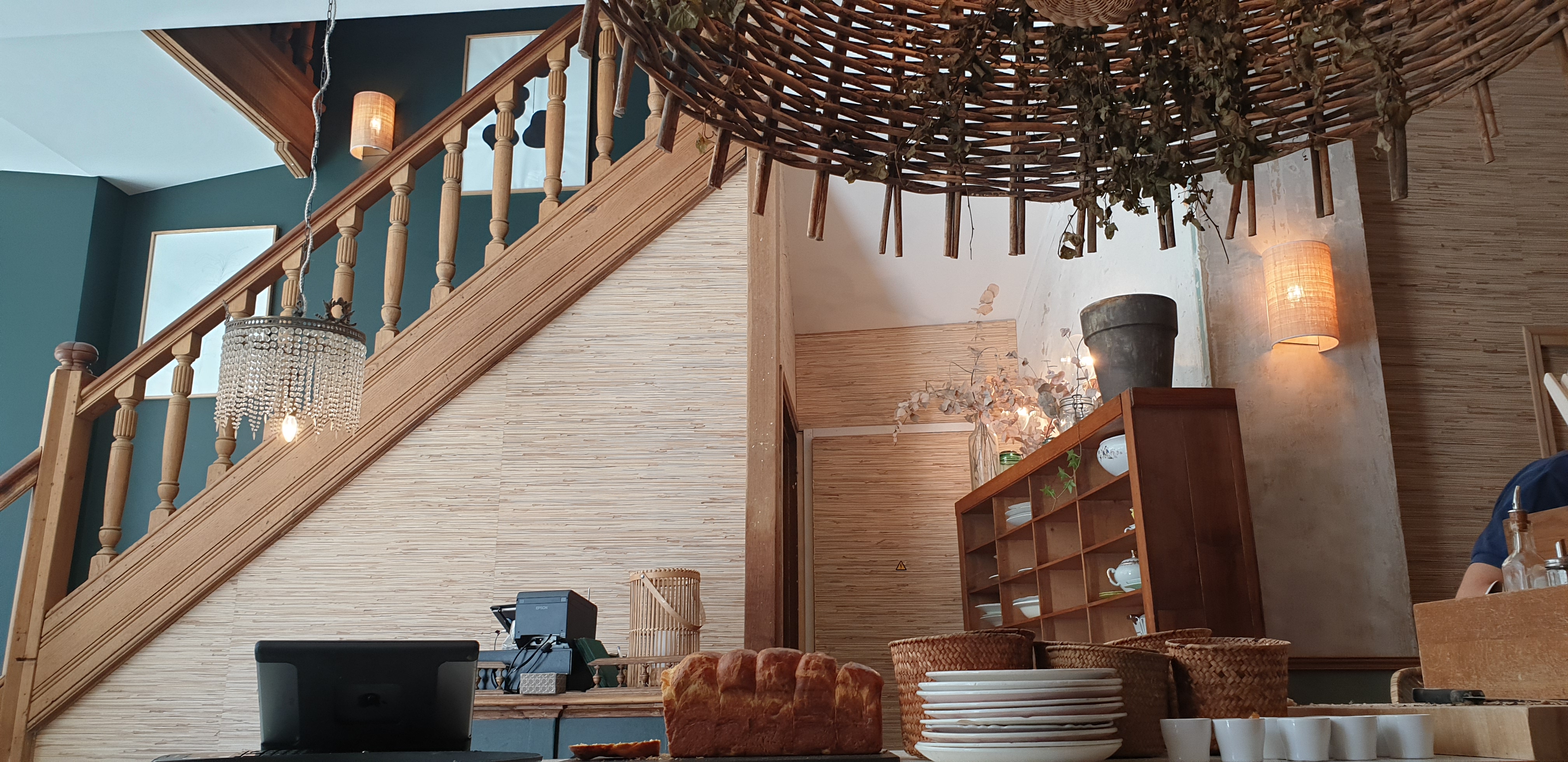 ❝ Restaurant rustique chic avec fauteuils en osier, proposant un menu de saison biologique et axé sur le développement durable. ❞