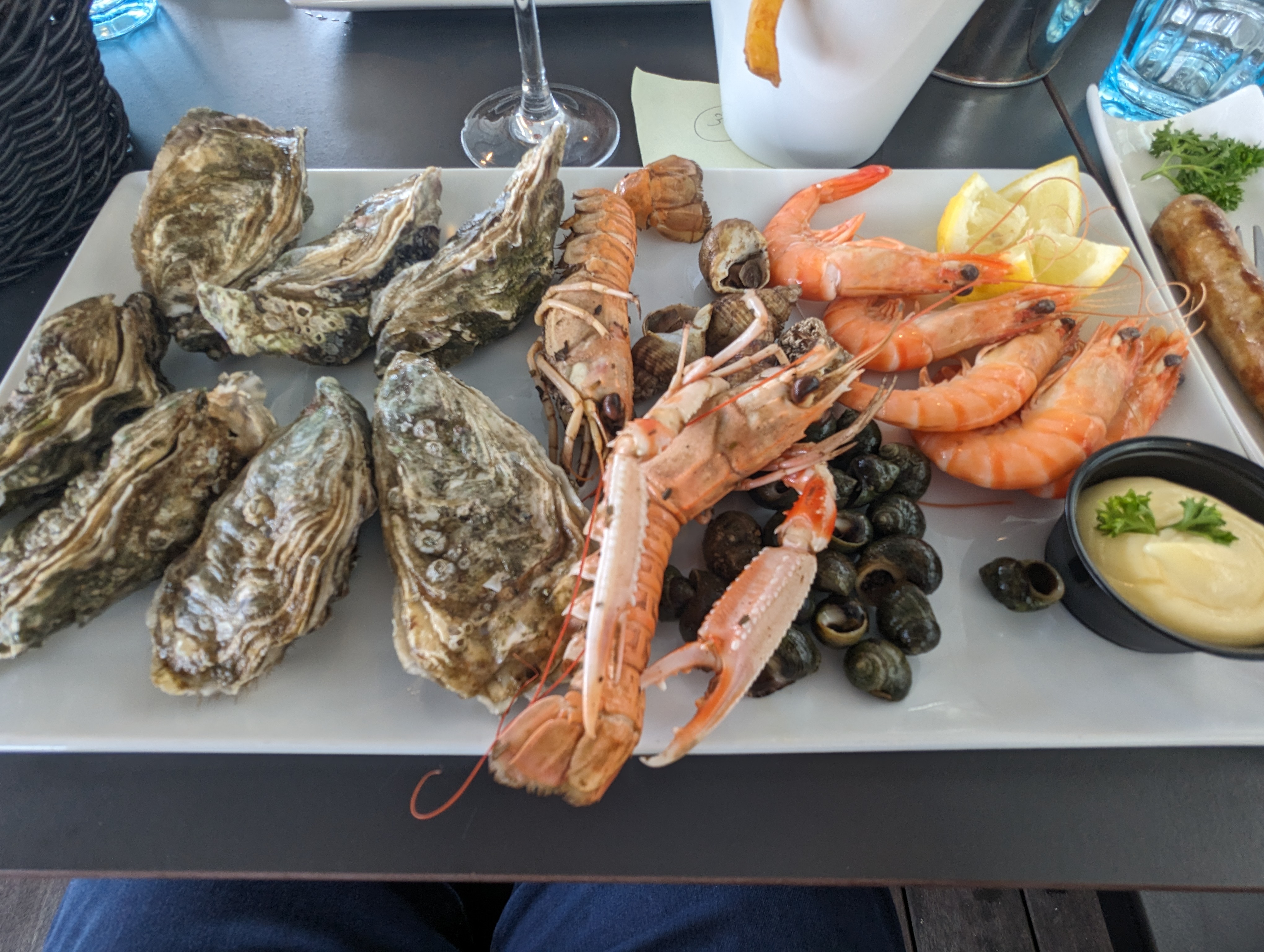 Très bonne localisation surtout si l'on a une table sur la terrasse qui donne sur le port (tout le monde n'est pas aussi bien placé .. il faut réserver à l'avance car salle comble). Les fruits de mer ne sont pas transcendants .. les huîtres sont cependant bonnes. Il n'y a pas de sauce vinaigre échalote pour les amateurs, mais 1/2 citron pas forcément juteux : il faut s'attendre possiblement à les manger crues. L'assiette reste de petite quantité, rehaussé par une saucisse (sèche..) qui permet de tenir un peu plus au corps avec du pain (peu frais). Dans ces conditions, nous n'avons pas poussé au dessert. Ces restau touristiques permettent de manger dans un cadre ; cela a un prix, et se répercute sur la qualité des produits. C'est un choix