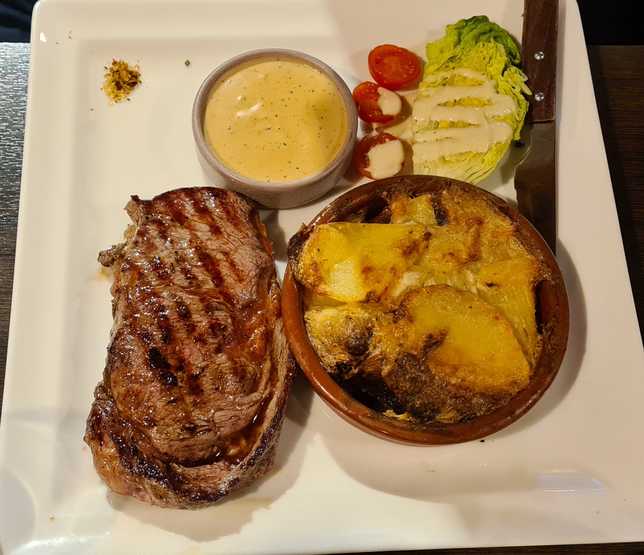 Prenez le saumon rn entrée, il est délicieux. Très bon rapport qualité-prix. Il est vrai qu'il y a peu de garniture mais ayant pris le menu entrée-plat-dessert, ca nous a suffit. Côte de boeuf classique. Super cadre avec une ambiance romantique et reposant. Dommage que cet endroit soit aussi loin de RER...