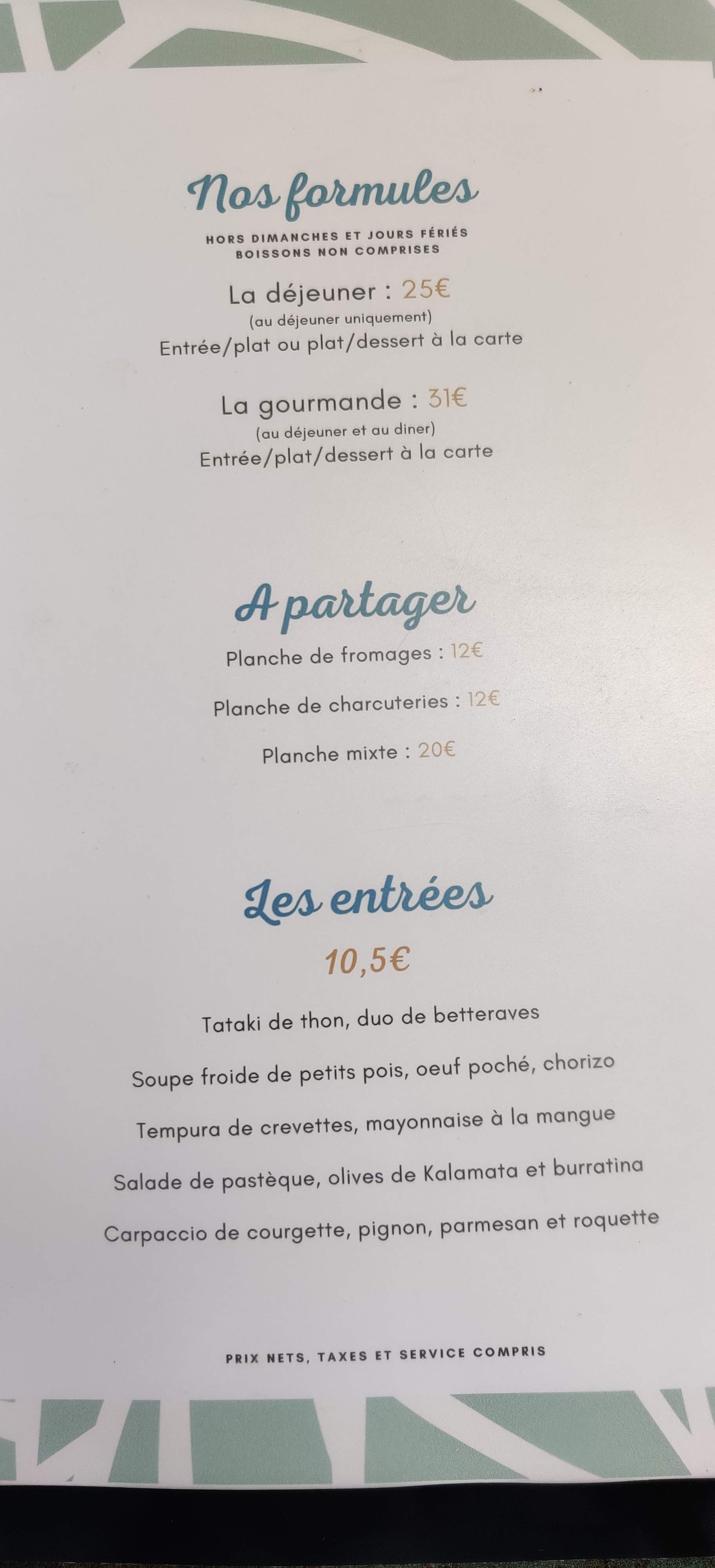 impression d'une belle Arnaque, menu unique à 50€ quand il est d'une trentaine d'euros en temps normal, information non communiquée lors de la réservation faite il y a plus de 3 semaines, découverte du menu quelques jours avant. Plats corrects qui ne justifient pas les prix (entrées et desserts avec globalement peu de saveurs: , croustillant au marceliin compact sans intérêt, salade aux poulpes tendres mais assaisonnement fade, succès au chocolat correct, tartelette aux fraises avec une pâte pas assez cuite....), pas de plat pour les végétariens, pains à priori surgelés car arrivent brûlants et avec parcimonie. Expérience mitigée pour le prix payé...