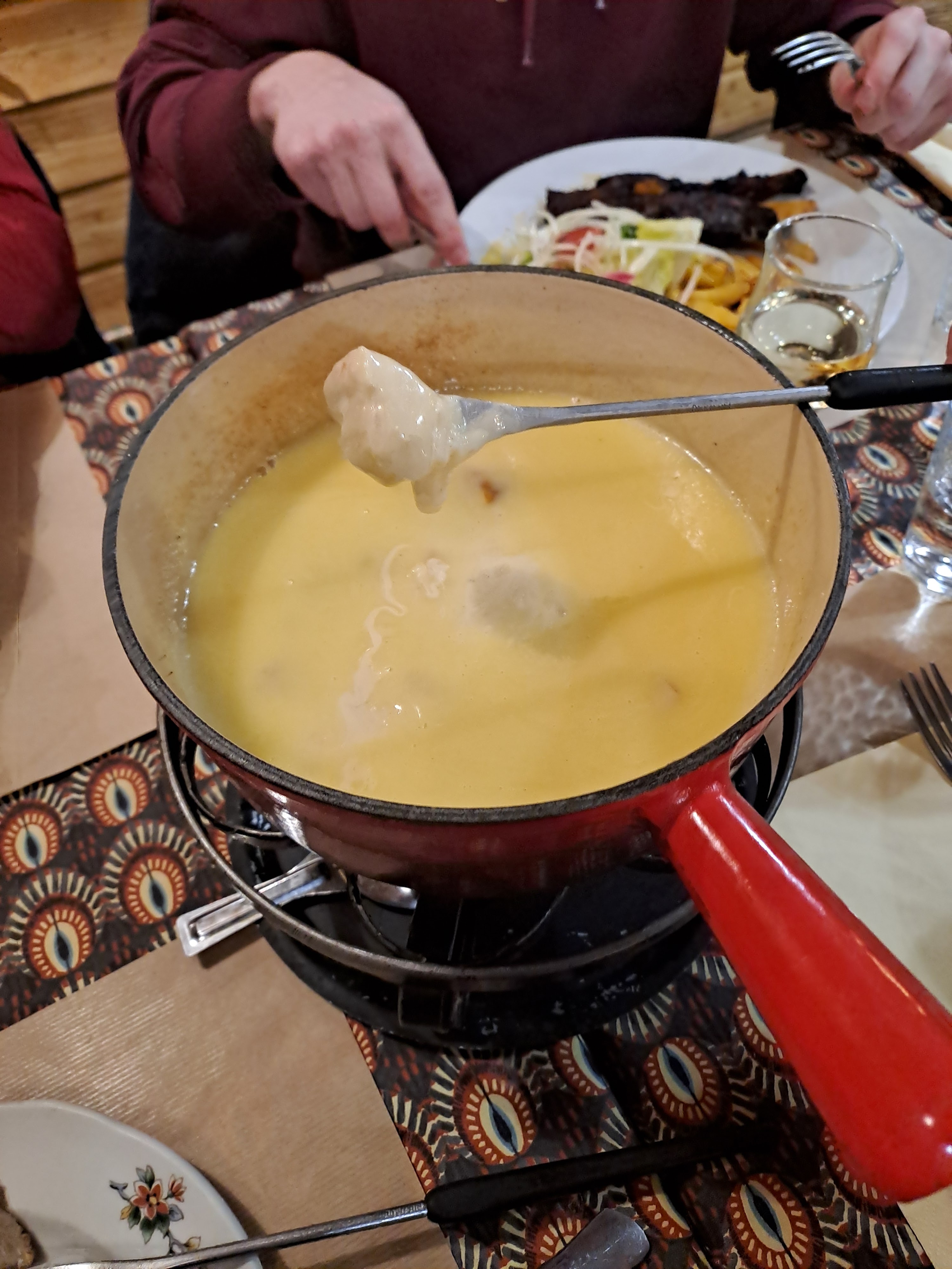 Repas avec collègues de travail pour fêter la demission d'un des nôtres. Fondue pour tout le monde. Fondue aux cèpes...un peu caoutchouteuse (trop d'emmental ? ) mais pas mal au goût. Dessert glacé...et un bon genepy à la fin. 39 euros par personne. Prix un poil trop élevé selon moi. Sinon bonne ambiance et bon service.