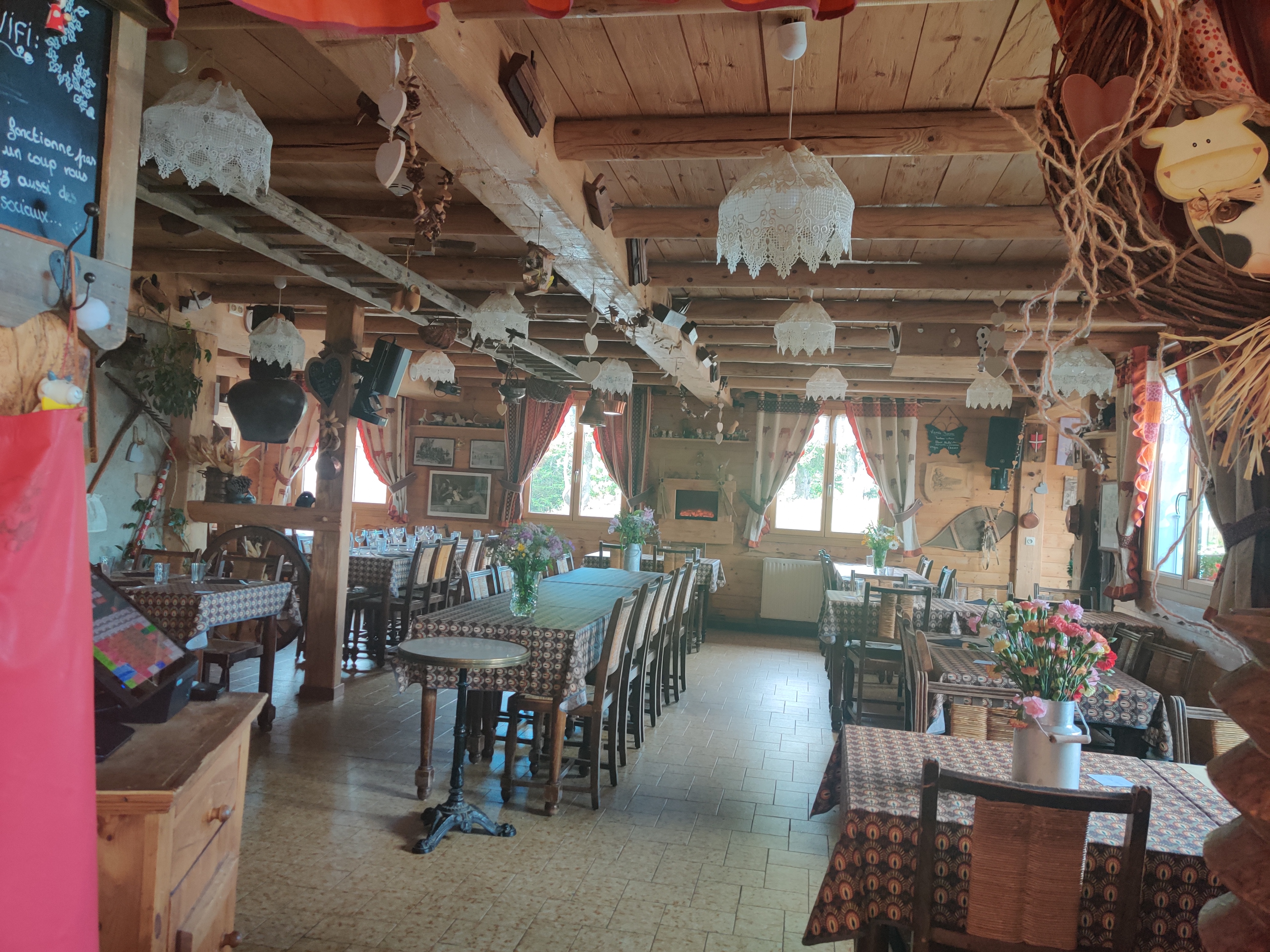 Nous avons réservé à l'avance pour 24 personnes un dimanche midi. Nous avons pu manger dans une jolie salle bien décorée. Nous avions demandé de grands plats de tartiflette à partager: délicieux. On s'est sentis comme chez nous. Les enfants avaient de la place pour jouer. Pour ceux qui n'aimaient pas la tarte à la myrtille, on nous a apporté de jolies petites coupelles de glace avec petit biscuit. La dame qui nous a servis était très chaleureuse. Par contre le restaurant donne sur un grand parking peu dépaysant. Pour vraiment profiter du paysage il faut monter encore quelques mètres jusqu'à la table d'orientation, et là point de vue exceptionnel à 360°.