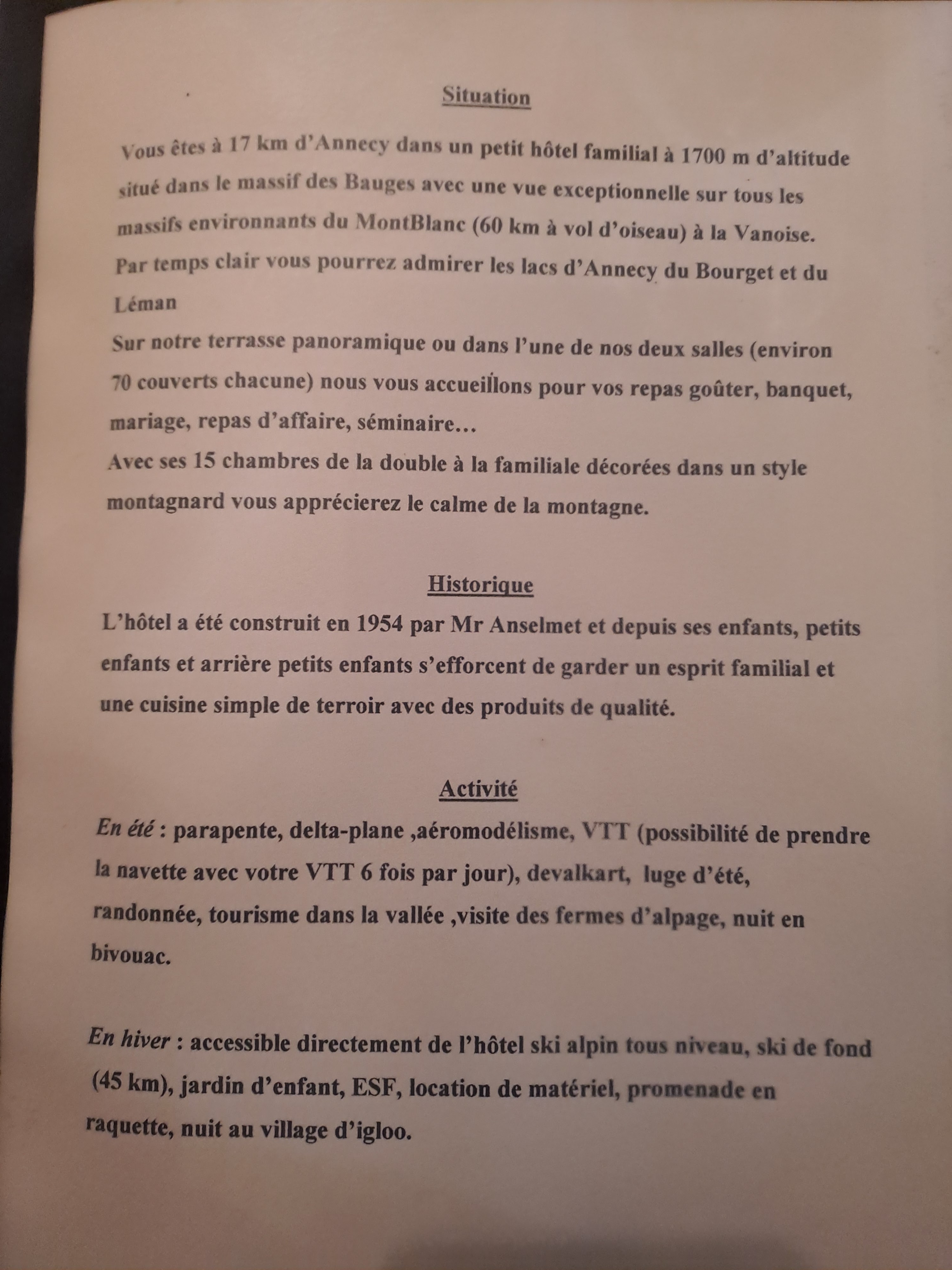 Partie hôtellerie non notée car pas testée. Pour le reste, c’est mon QG l’été aussi bien après une ascension du Semnoz en vélo, qu’en courant ou en rando. Terrasse extraordinaire car en plein soleil avec des transats top pour se relaxer. La vue Tournette et Mt Blanc est magnifique. Il arrive parfois que le service soit un peu long mais rien de dramatique non plus. Si vous venez en voiture, le parking situé juste en face de l’établissement est pratique. Le seul bémol ce sont les motards qui remettent les gaz juste devant les clients, ce qui gâche un peu l’expérience mais ce n’est pas la faute du lieu.