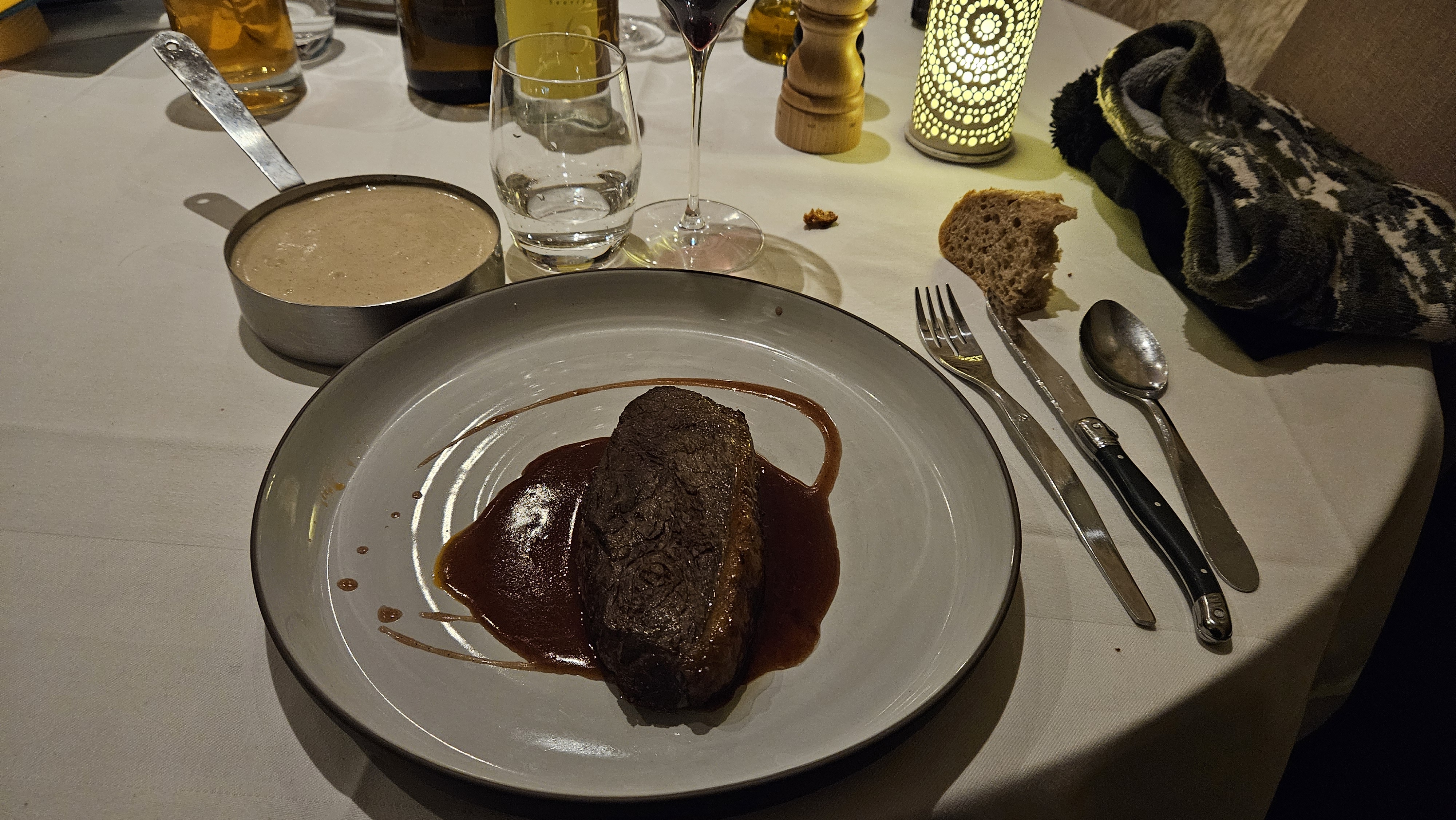 Repas à 5, tout le monde ravi ! Fondue aux Morilles excellente (possible pour une pers.), poisson et viande très bon, dessert extra. Service agréable et équipe très prévenante (bébé était avec nous)