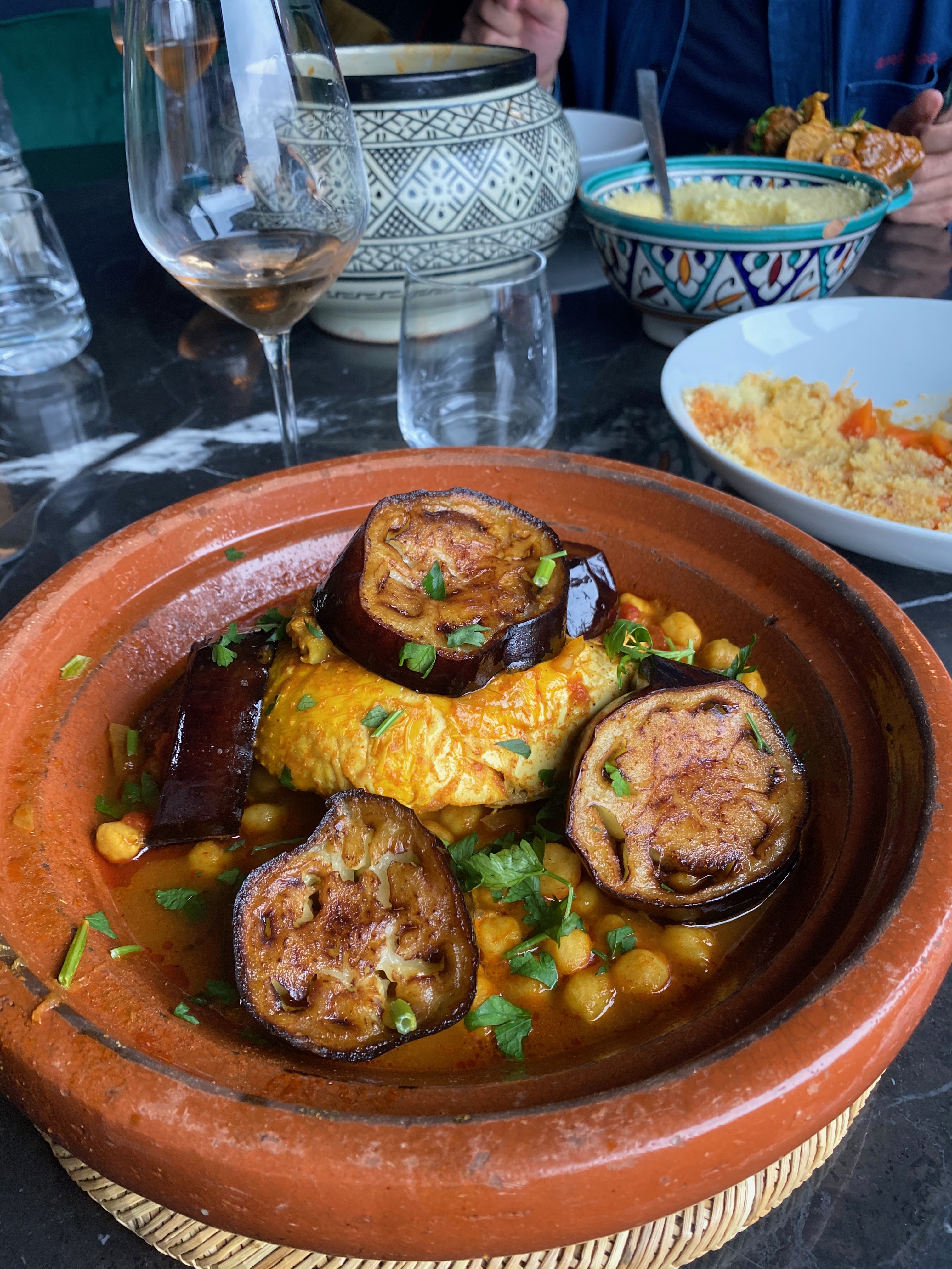 Bonnes tajines. MAIS prix du vin servi au verre absolument prohibitif compte tenu de la quantité qui ne représentait sûrement même pas 1/8 de litre et se perdait dans un verre immense. Nous nous sommes abstenus aussi de faire une remarque au sujet de l'une des serviettes qui avait bien conservé ses nombreuses taches au lavage. On n'y retournera pas.