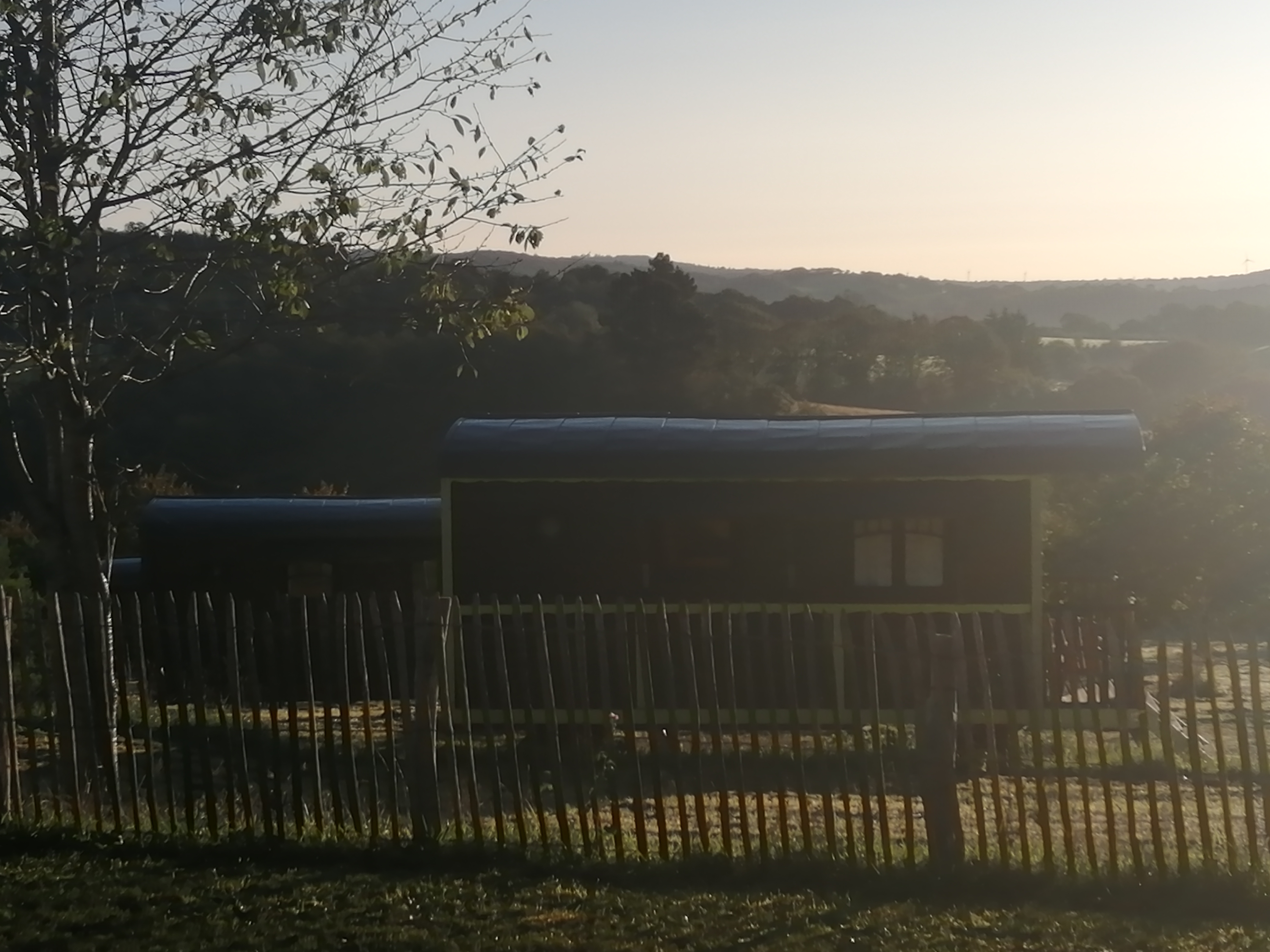 Nous sommes arrivés dans un cadre idyllique pour des vacances au vert. Les Roulottes sont situées sur un promontoire dont la vue aux alentours est splendide. De plus, un silence impressionnant règne sur le lieu. Réveillé par le chant des oiseaux. Les nuits dans la roulotte ont été super reposantes. Matelas confortable et salle douche avec évier. De plus, katell et Éric, nos hôtes nous ont très bien accueilli. Restaurant sur place avec de très bonnes cocottes. Très bon séjour. Trop court évidemment.