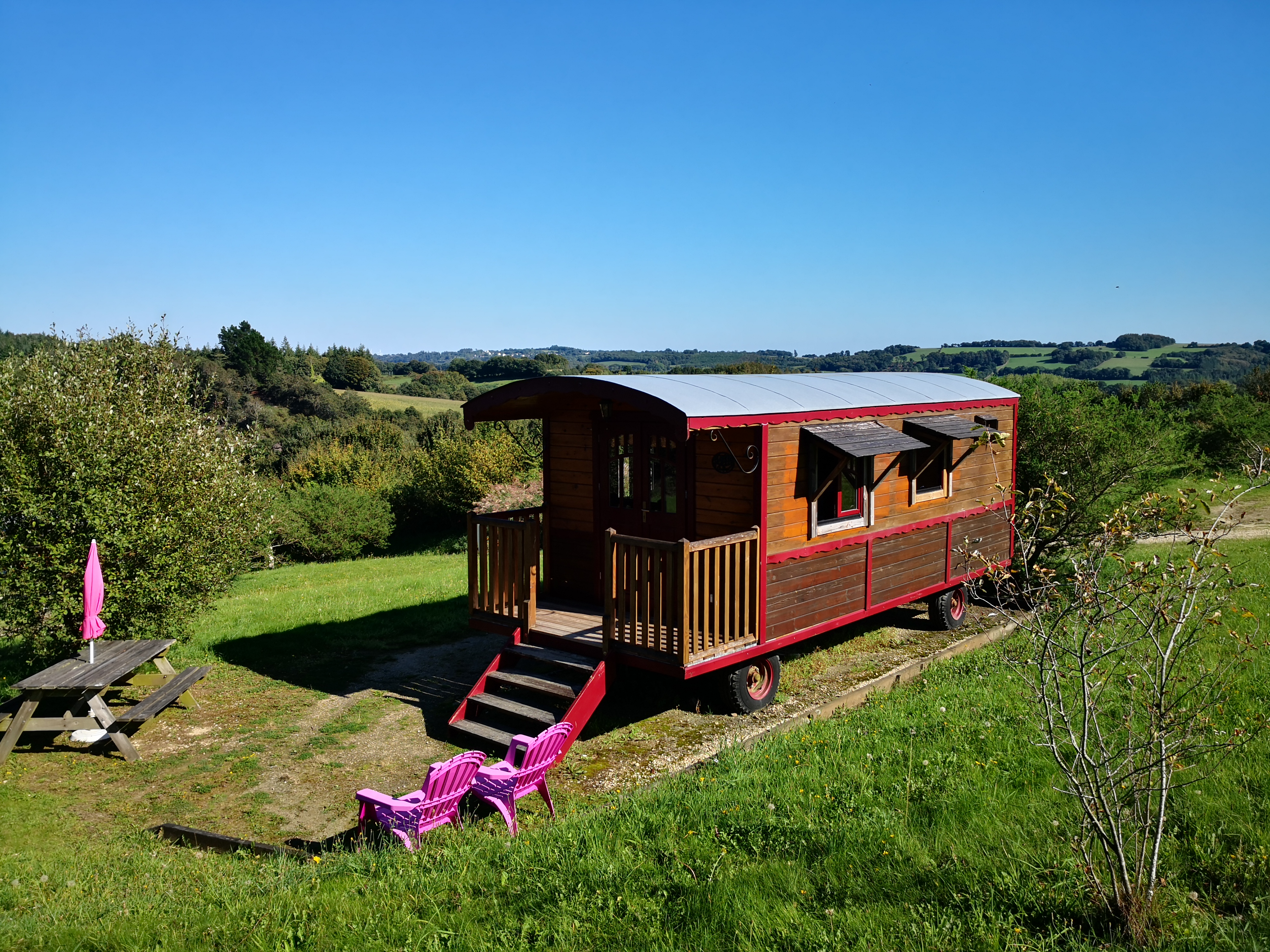 Bel endroit pour un hébergement atypique avec un accueil efficace au parler ferme. Les roulottes, plus proche d'un mobilhome sur chassis, sont bien amenagées, tres propres, mais dont l'usure commence à se sentir, elles mériteraient un rafraîchissement, deco et aménagement plus contemporain ( par ex chalet scandinave ). Le site est assez excentré de tout, au milieu du parc naturel avec pas mal de balades autour, la côte reste assez éloignée et les routes sinueuses.