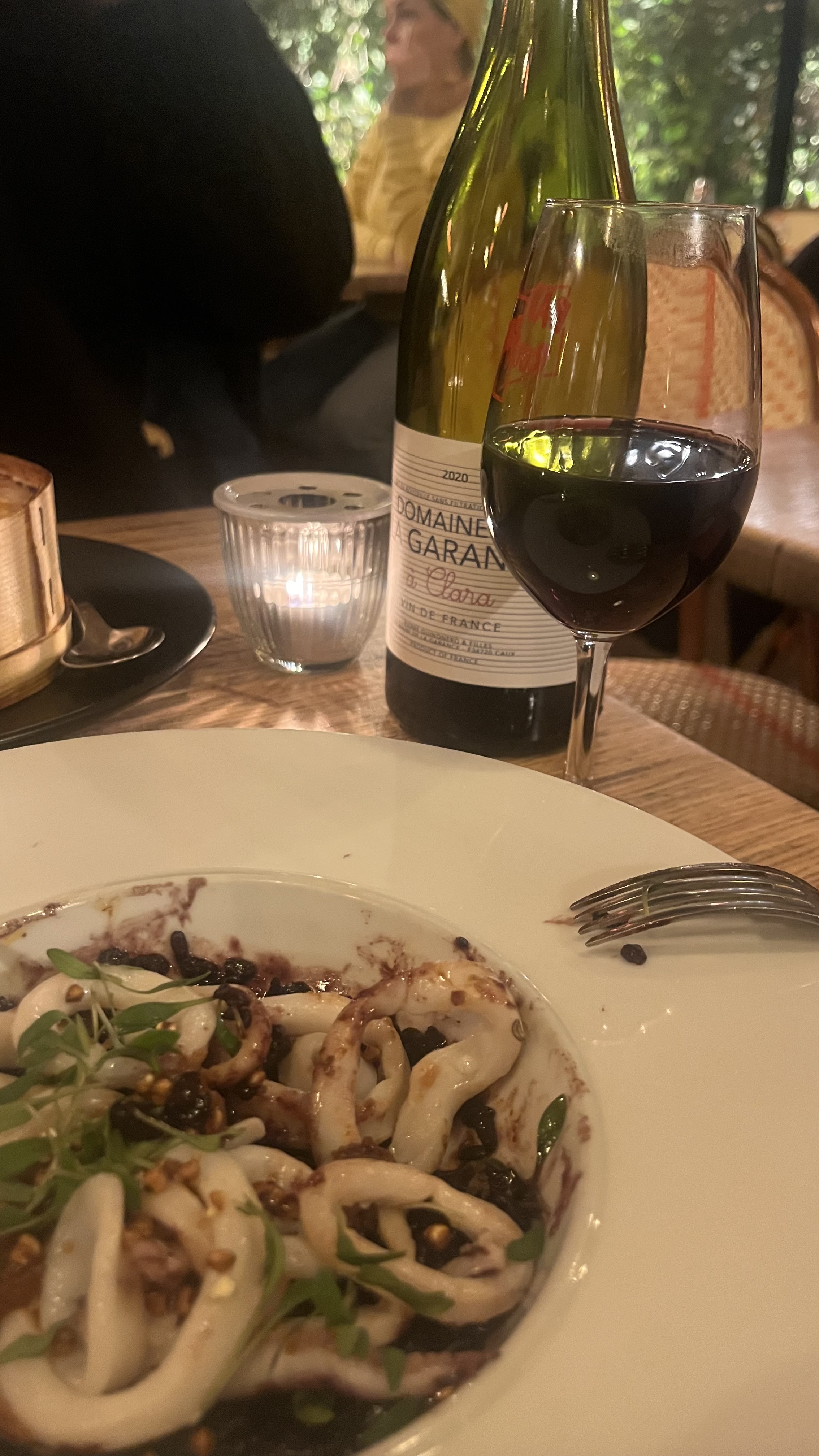 Super plan bistronomique! La cuisine est délicate, préparée avec de très bons produits. La carte a été revue, avec maintenant la possibilité d’un menu en trois temps pour 40€ le soir. Perso, je préfère la formule historique des plats à la carte que l’on se à partage. Les assiettes sont généreuses donc trois plats et un dessert, pour deux, vous font un très bon repas (et ça revient économiquement au même). Si vous aimez les vins du sud, vous avez probablement ici la meilleure carte qu’on puisse trouver au restaurant à Paris, avec des multiples qui restent très raisonnables (nous avons pris un Montcalmes 2017 à 74€). D’ailleurs pour les amateurs, je recommande vivement d’aller voir de l’autre côté du mur (le restaurant a une partie caviste en journée), pour voir la « collection »