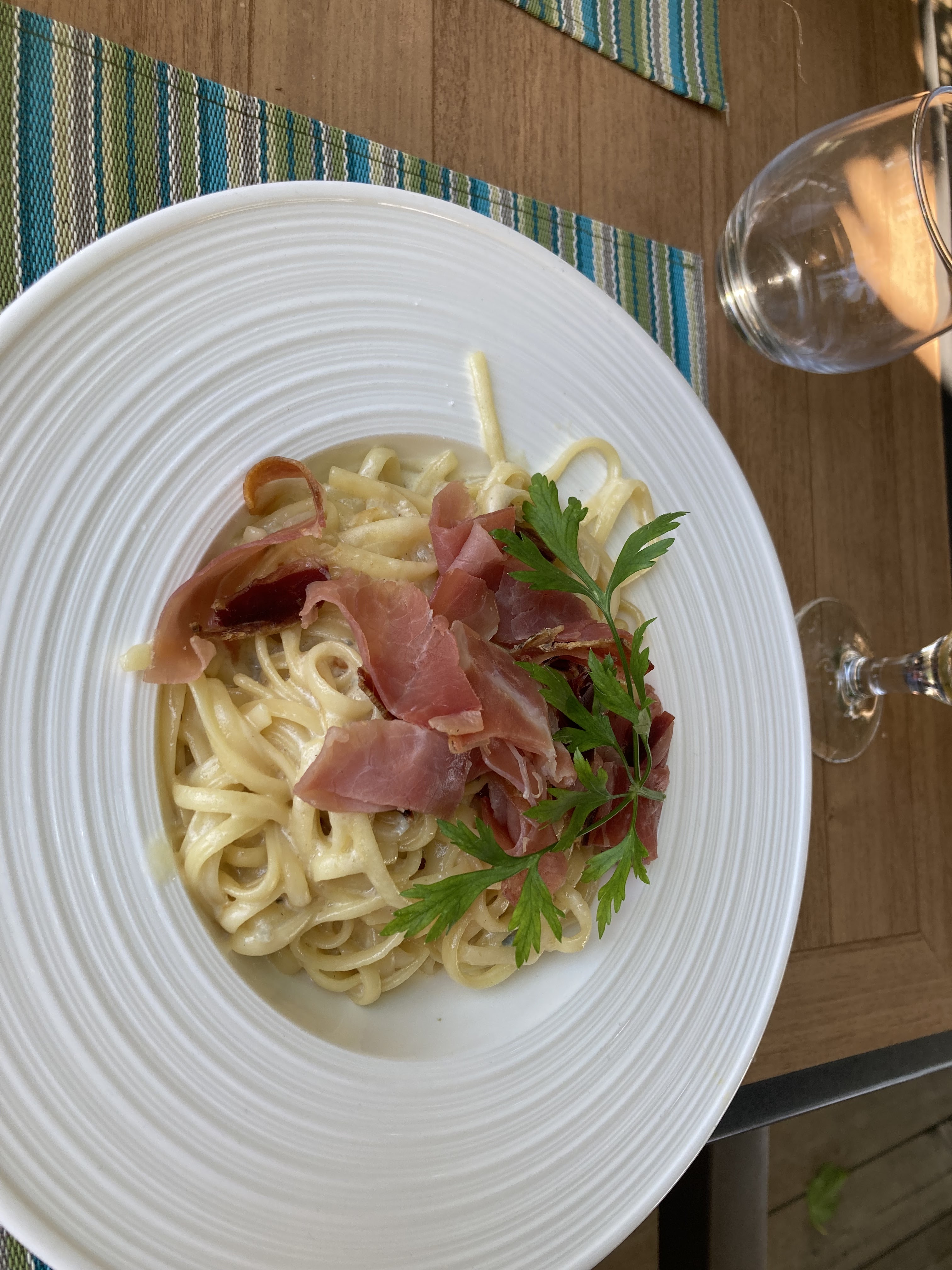 Nous avons déjeuné...pâtes au pesto baignant dans l huile et pas chaude. Serveur sympa et faisant de son mieux mais avec un patron hurlant de la cuisine, imaginez l ambiance...viens la note où nous avons à faire a lui bonjour l amabilité....il faut changer de métier monsieur!!!!!