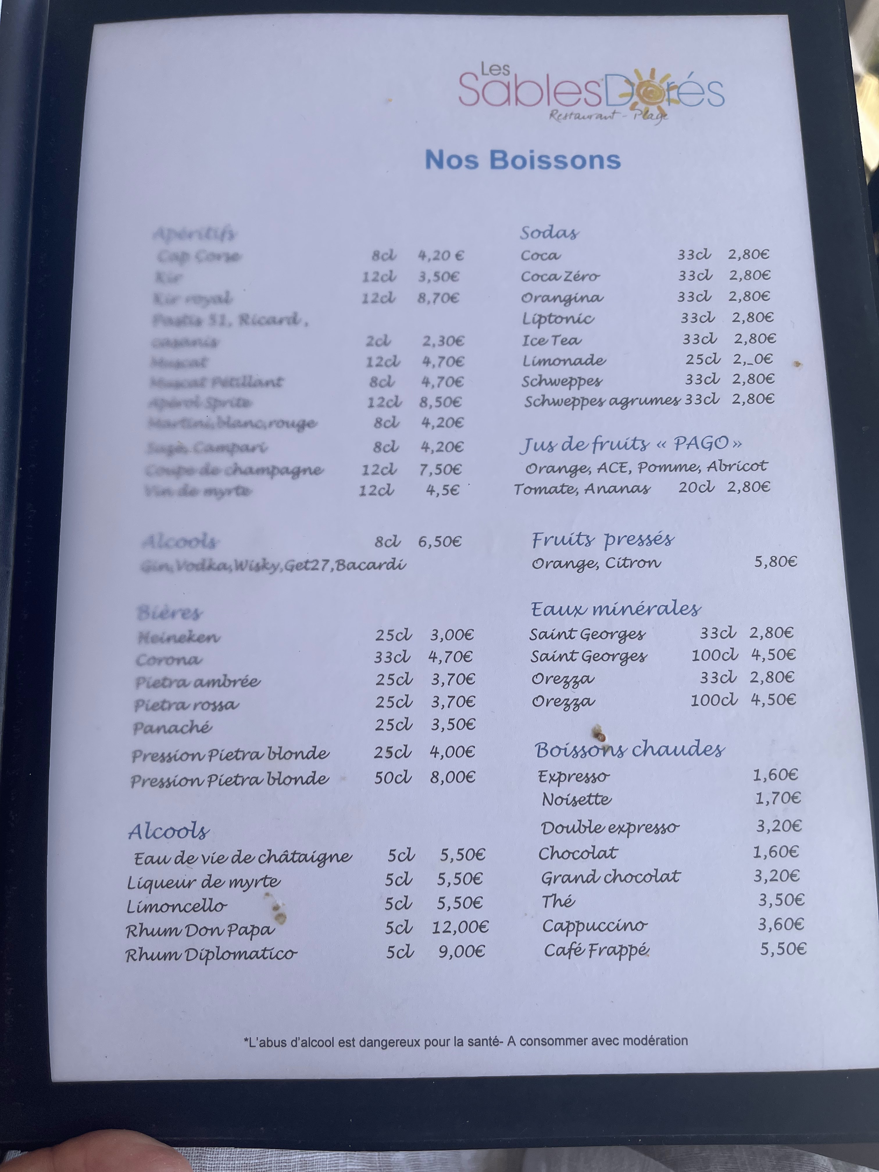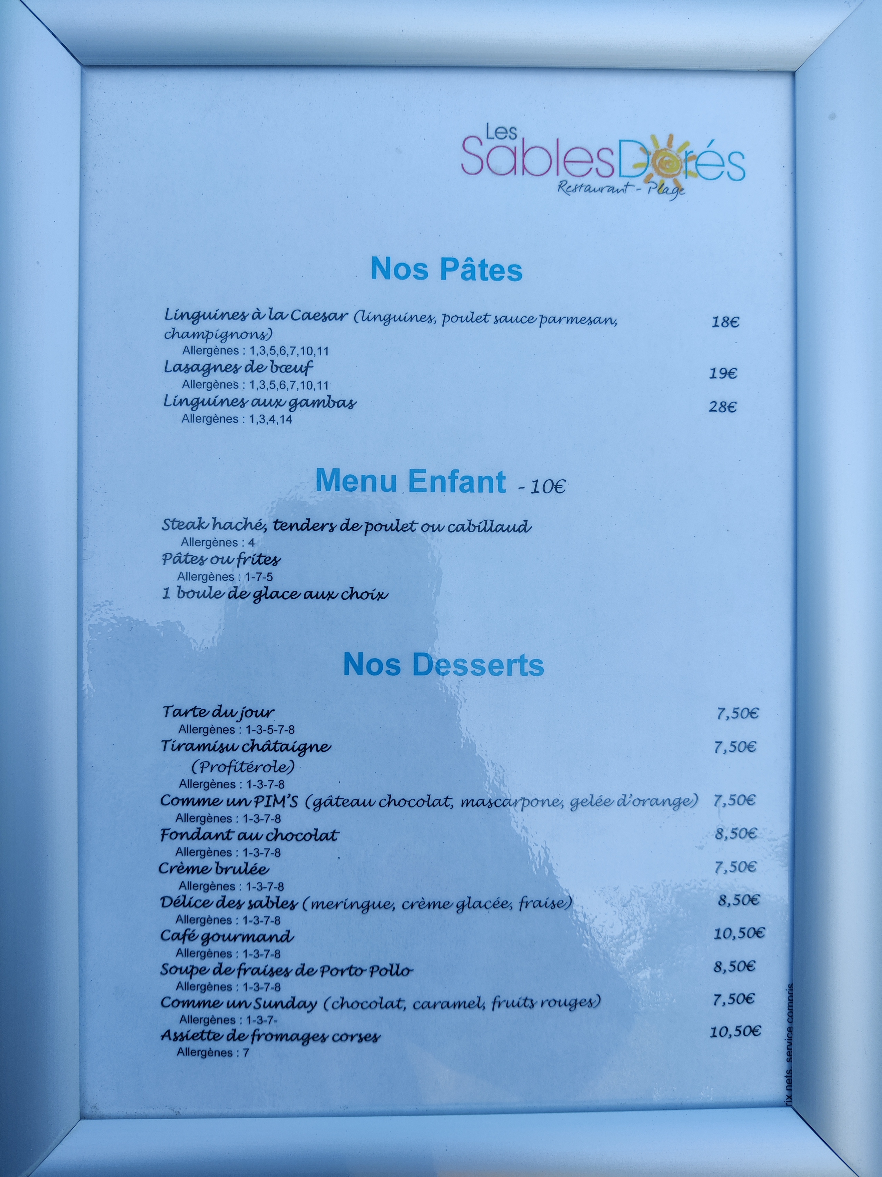 Excellent J’ai dîner deux fois au sables doré et je regrette de ne pas y être allée avant ! Tout était délicieux et copieux, le service est rapide, les prix sont très corrects, le cadre est magnifique digne d’une carte postale, très calme et apaisant, tout le monde est très agréable. C’était vraiment parfait, merci encore.