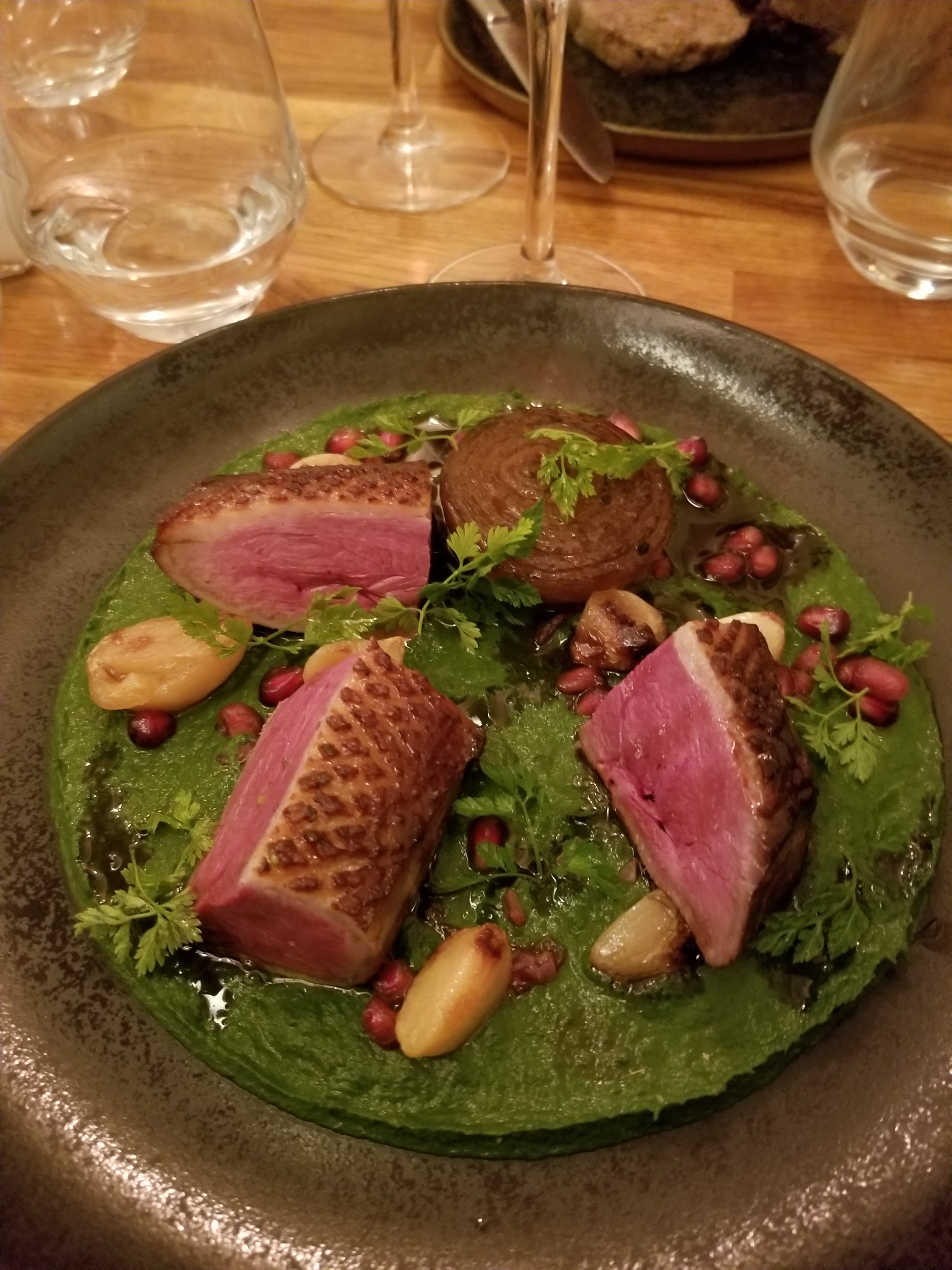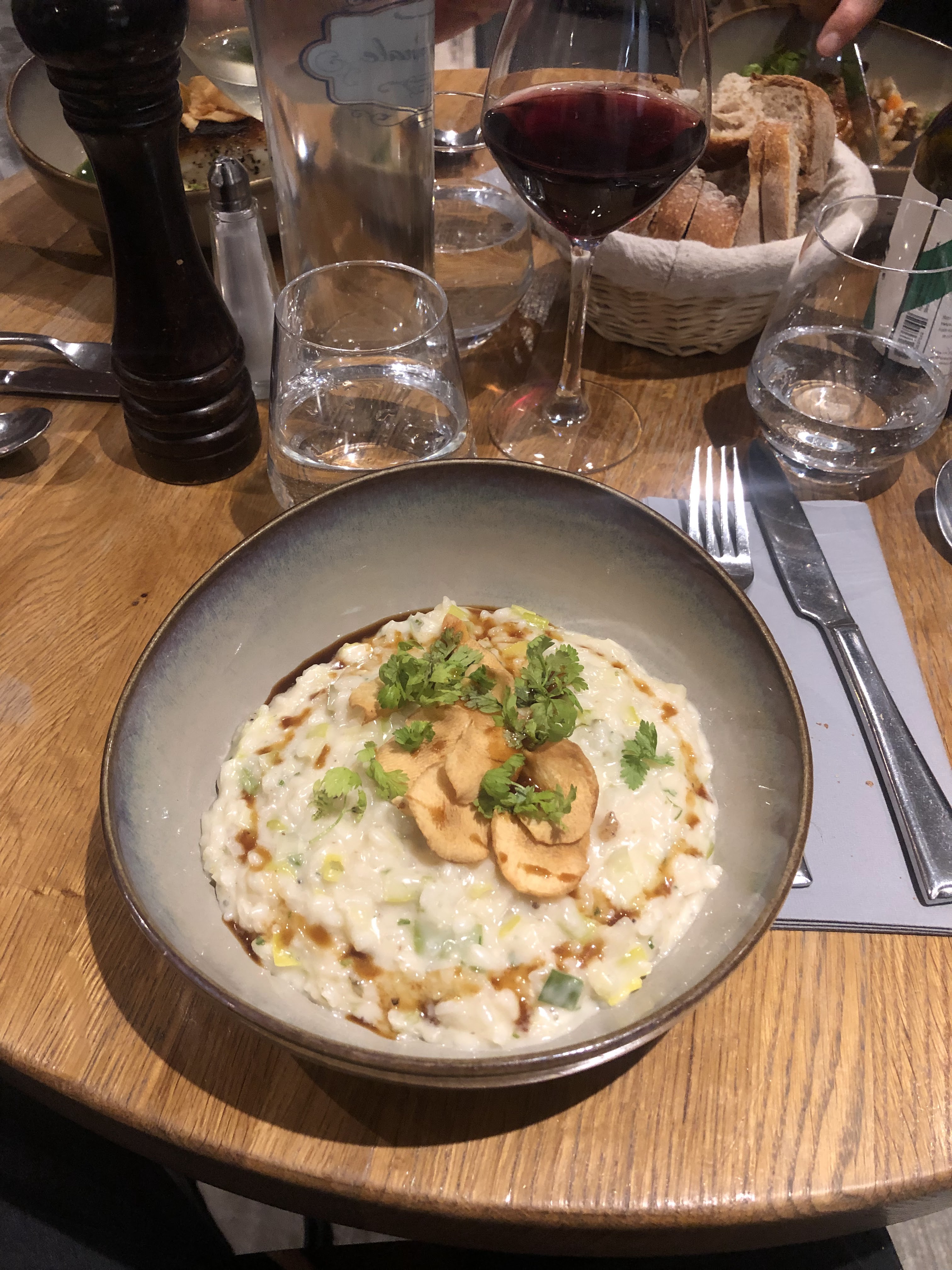 Personnel sympathique, excellentes recommandations de vins. Le risotto aux champignons était merveilleux, pas sec et al dente. La poitrine de porc était également très bonne, tout comme les lentilles. Belles portions. La soupe aurait pu avoir un peu plus de saveur mais ça allait. Nous lui donnerions une note de 4,6 ou 4,7. Les desserts avaient l'air bons mais nous étions rassasiés donc nous ne les avons pas essayés. Nous reviendrions et essayerions d'autres plats que nous avons vus servis.