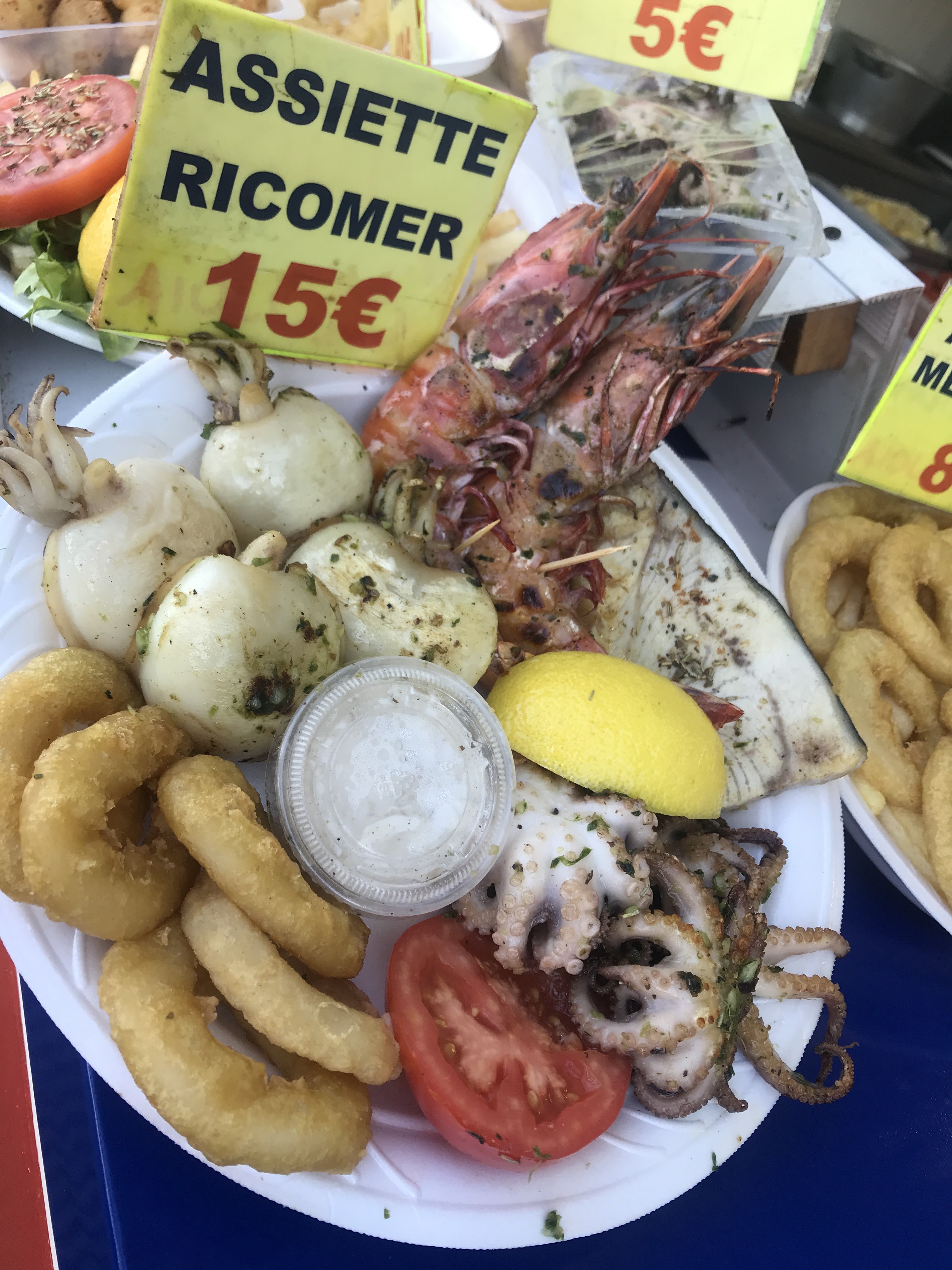 À faire au moins une fois pour vivre une ambiance typique du sud mais aussi pour déguster des poissons et de vrais fruits de mer : gambas, sardines, moules, poulpes, calamars, saumon... Il y aussi de la paella, des pizzas , des assiettes grecques... de quoi régaler tout le monde à des prix défiant toute concurrence! C'est convivial car on peut se retrouver à partager la table avec d'autres personnes. Il faut arriver dès l'ouverture à 18h30 car il y a vite foule... La seule critique que nous avons à émettre est qu'il est dommage qu'il ne soit pas possible de composer son assiette soi-même avec ce que l'on veut... dommage aussi qu'il n'y ait quasiment que des frites en accompagnement et pas de riz ou salade, et la plupart des assiettes contiennent trop de calamars frits...