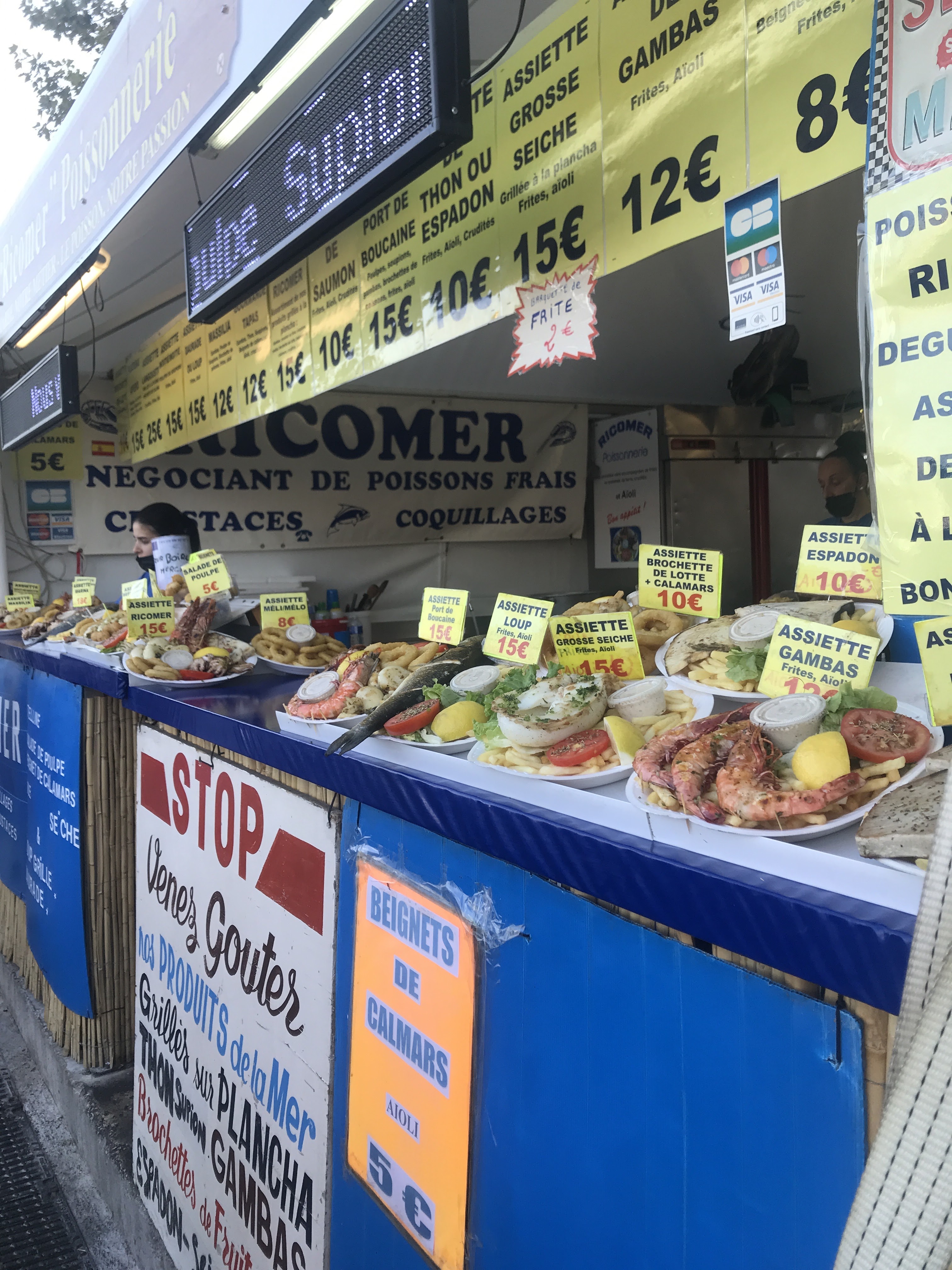 Marseillais je n'y était plus allé depuis près de 25 ans .....je suis déçu !!!!!! on y passe quand même un bon moment en famille ou entre amis mais la qualité n'est plus au rendez-vous . les prix sont abusés pour la nourriture pas pour l'alcool par contre où pour 17 euros vous aurez 1 bouteille de rouge 2 pastis et 1 coca . Pour la bouffe les stands font envie à première vue mais alors vive le surgelé pour tout ce qui est poisson !!!!!! Donc surgelé + première cuisson pour s'avancer le travail + deuxième cuisson pour servir = très moyen ....surtout quand on voit le port les bateaux et la Méditerranée juste derrière . Friture de petits poissons pas top sardines en filet du vol salade de poulpe la pire de ma vie . Alors allez y quand même pour un peu de détente mais éviter les fritures prenez du poisson simplement même surgelé lol gienre espadon thon lotte.....ou prenez gambas crevettes.....comptez 5 euros les barquettes ou en moyenne 15 euros le plat