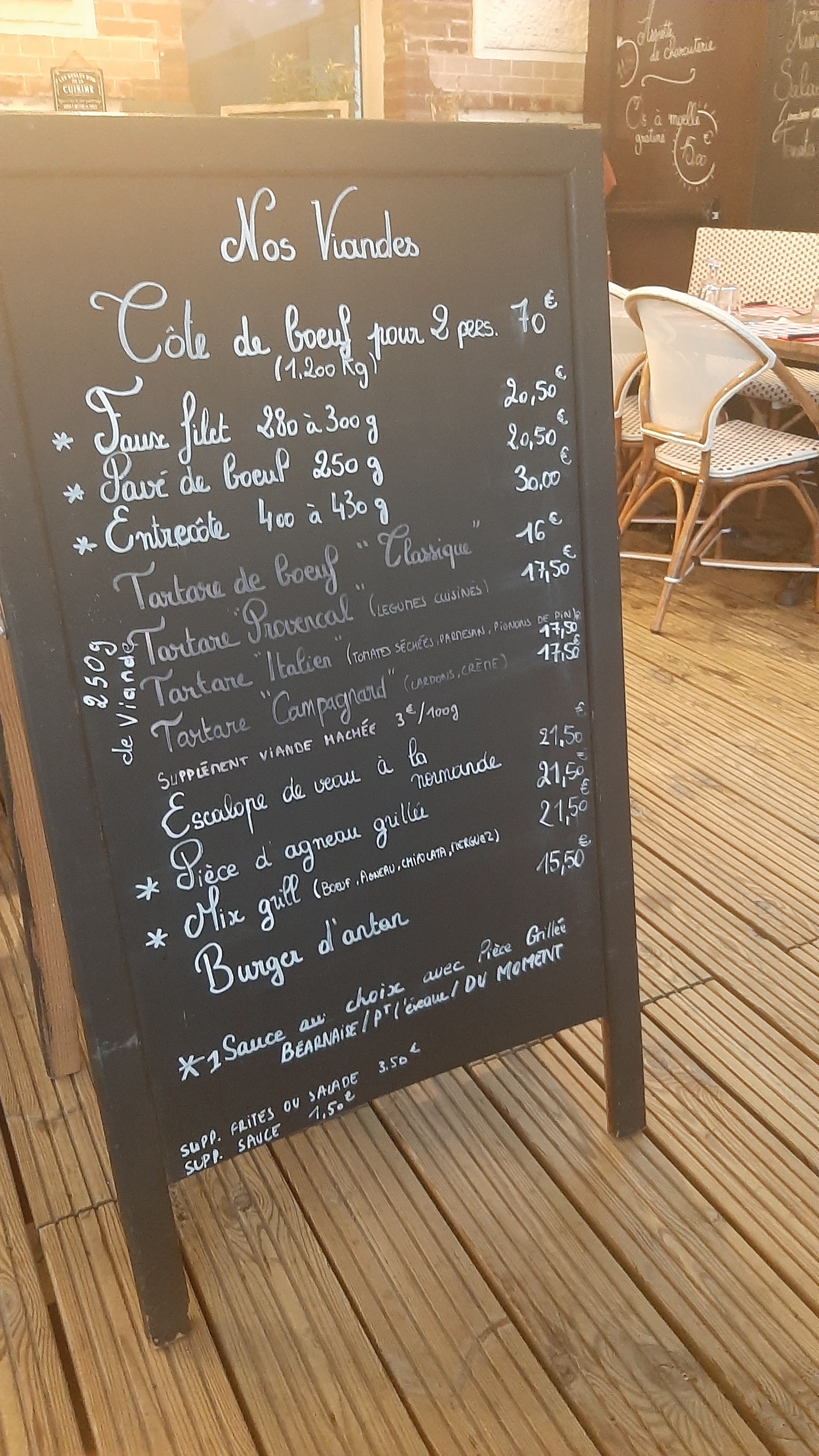 On y a déjeuné à midi avec ma fille et ma petite fille de 2 ans, chaise bébé et crayon de couleur fournit, merci bcp, serveuses excellentes, pro et vraiment serviables, tartares gigantesques avec frites maison humm, je conseille pour les amateurs de barbaques, cadre sécurisé pour les enfants, parking gratuit et accessible, grandes terrasses, verdure et calme loin de la circulation, et en plus une boucherie qui vous vends la super viande , que demander de plus, un vrai régal , merci a toute l’équipe