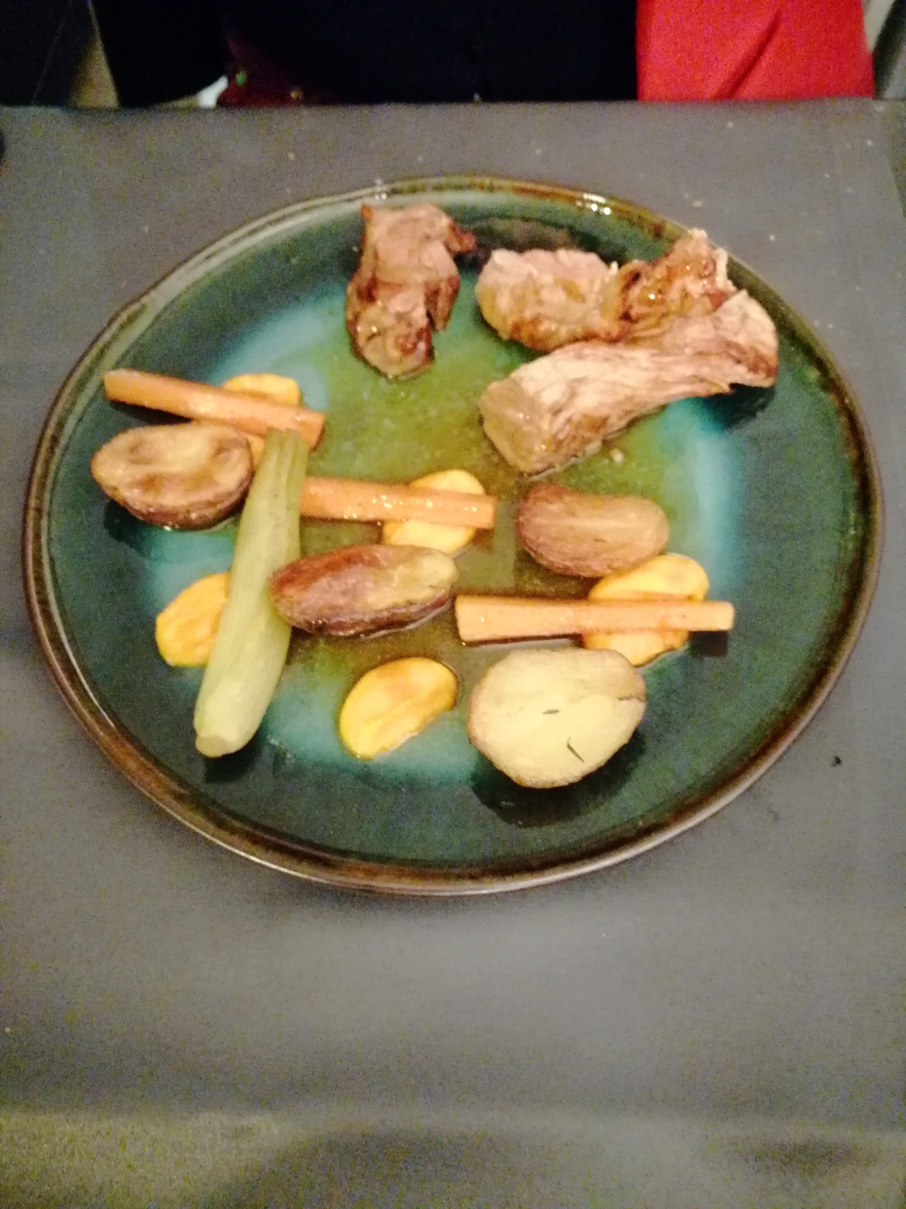 Pas assez de cabillaud dans gratin de cabillaud, riz noir. Succulent magret de canard, patates. Panacotta très bonne.