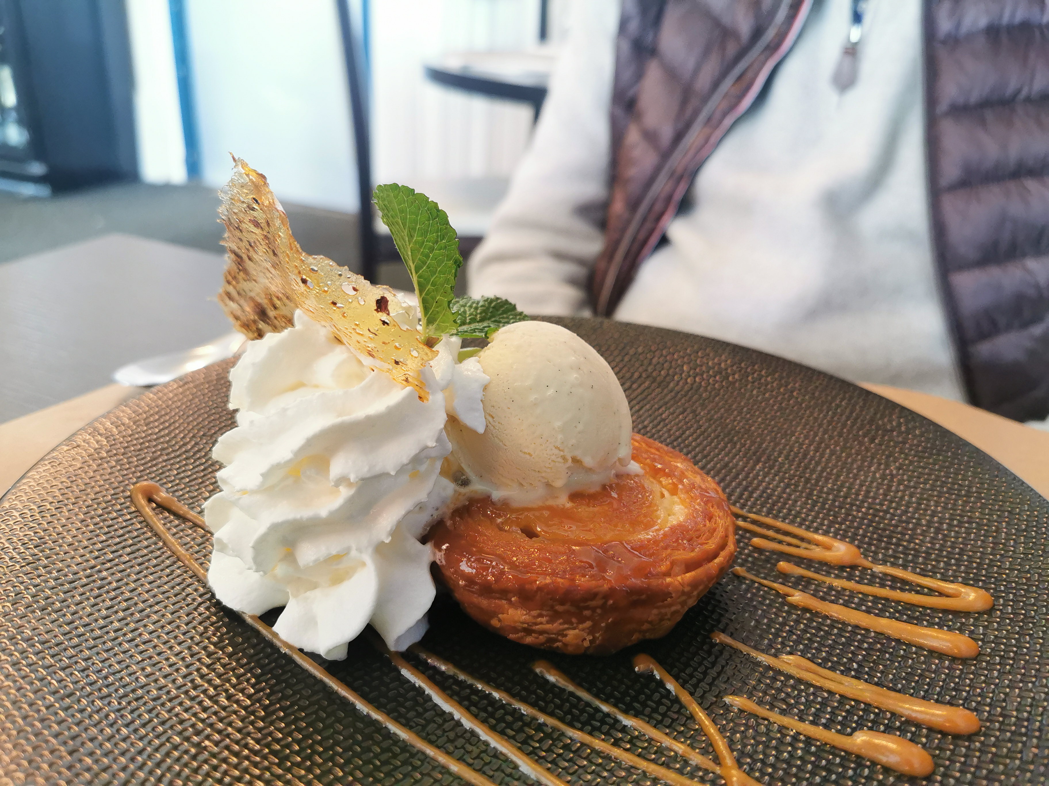 Nous avons tres bien déjeuner ce midi. Une tres bonne terrine de sanglier D'une joue de porc et son écrasé de pommes de terre et une panacota the matcha et fruits rouge