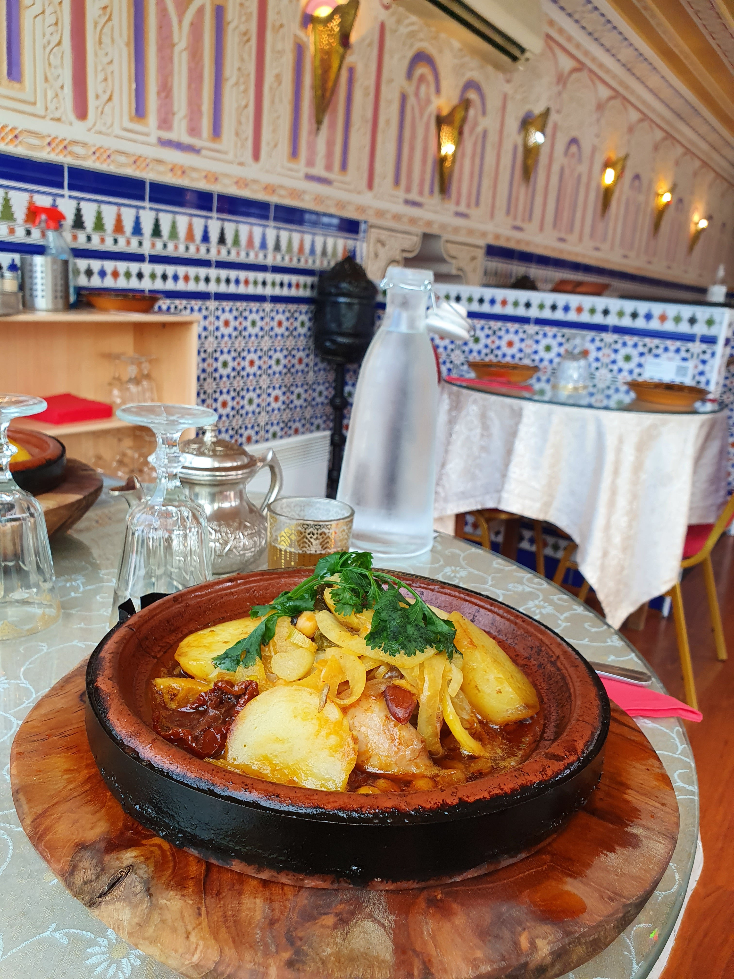 Nous avons testé le couscous à l'agneau et le tajine kefta, c'était bon, c'était frais, c'était copieux… La viande était très tendre et il y a une belle portion de légumes dans le couscous (on a rempli deux assiettes pleines !). Bravo à la cuisinière ! Le service est très bien, surtout que le gérant est seul dans la salle. Il passait régulièrement de table en table voir si les clients ne manquaient de rien, demander si tout se passait bien ou même discuter des plats si les gens le souhaitent. Ne passez pas à côté du thé à la menthe, dont on peut dire qu'il est totalement fait sur place, puisque la menthe est récoltée sur la terrasse ! En termes d'accessibilité du restaurant, il est possible d'entrer par la terrasse et d'accéder à la salle intérieure (1 ou 2 cm de différence de niveau au niveau de la porte). Il y a cinq-six marches entre la salle d'entrée à proprement parler et la salle de restaurant. Les tables étaient bien espacées, un fauteuil pouvait circuler dans les allées.
