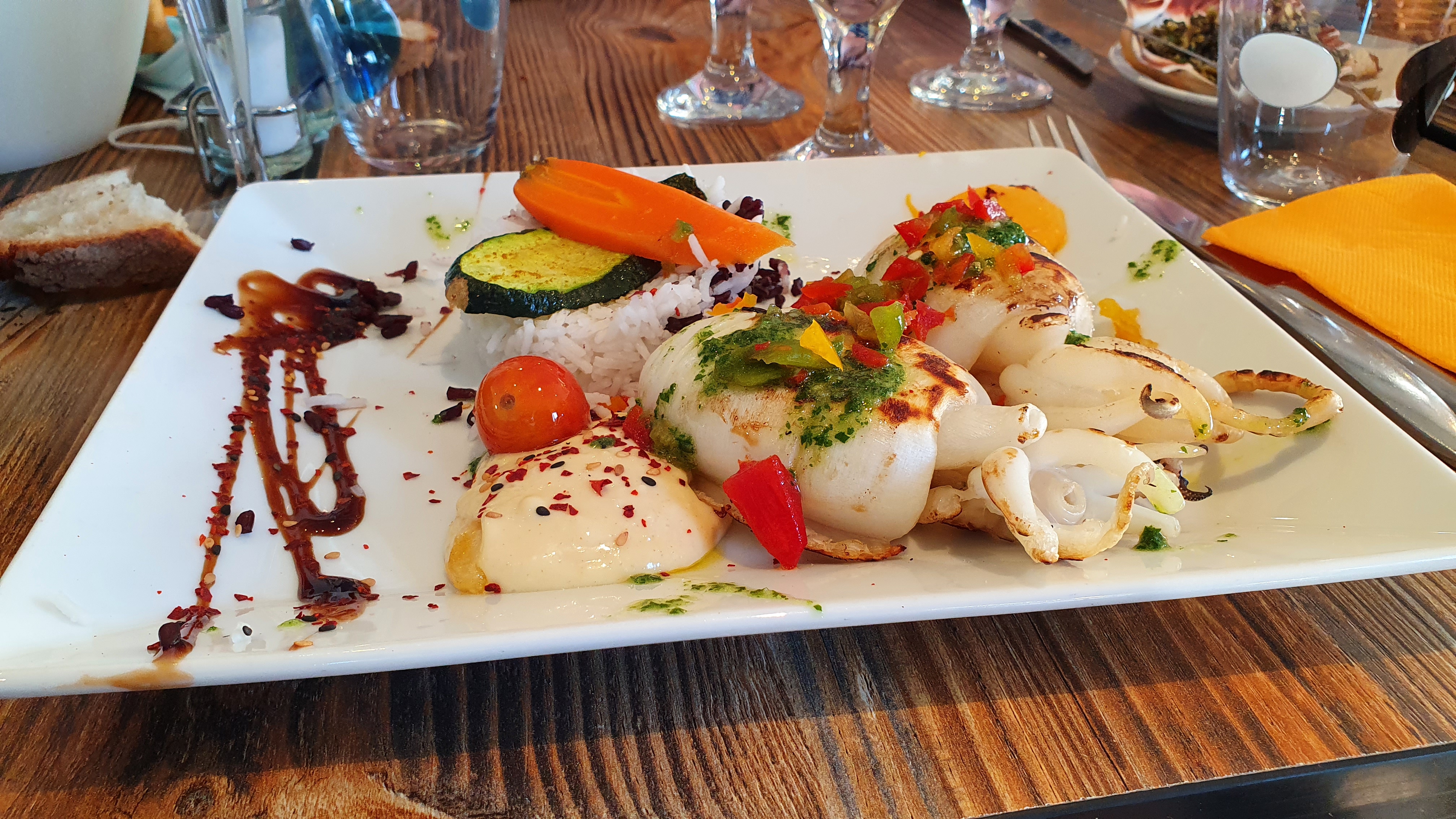 Nourriture de moyenne qualité, services déplorable... nous étions un lundi soir en octobre et ils étaient débordés. Ils se sont trompés dans la bouteille de vin, ont ramené la bouteille d'eau après trois demandes, ont ramené les plats sans les couverts... Le riz qui accompagnait le loup grillé était très fade, la tarte citron en dessert qui vient de la patisserie de la ville (marqué sur la carte) était faite depuis 2 jours minimum.. je ne conseille pas ce restaurant où la recherche du profit a dépassé la satisfaction du client.