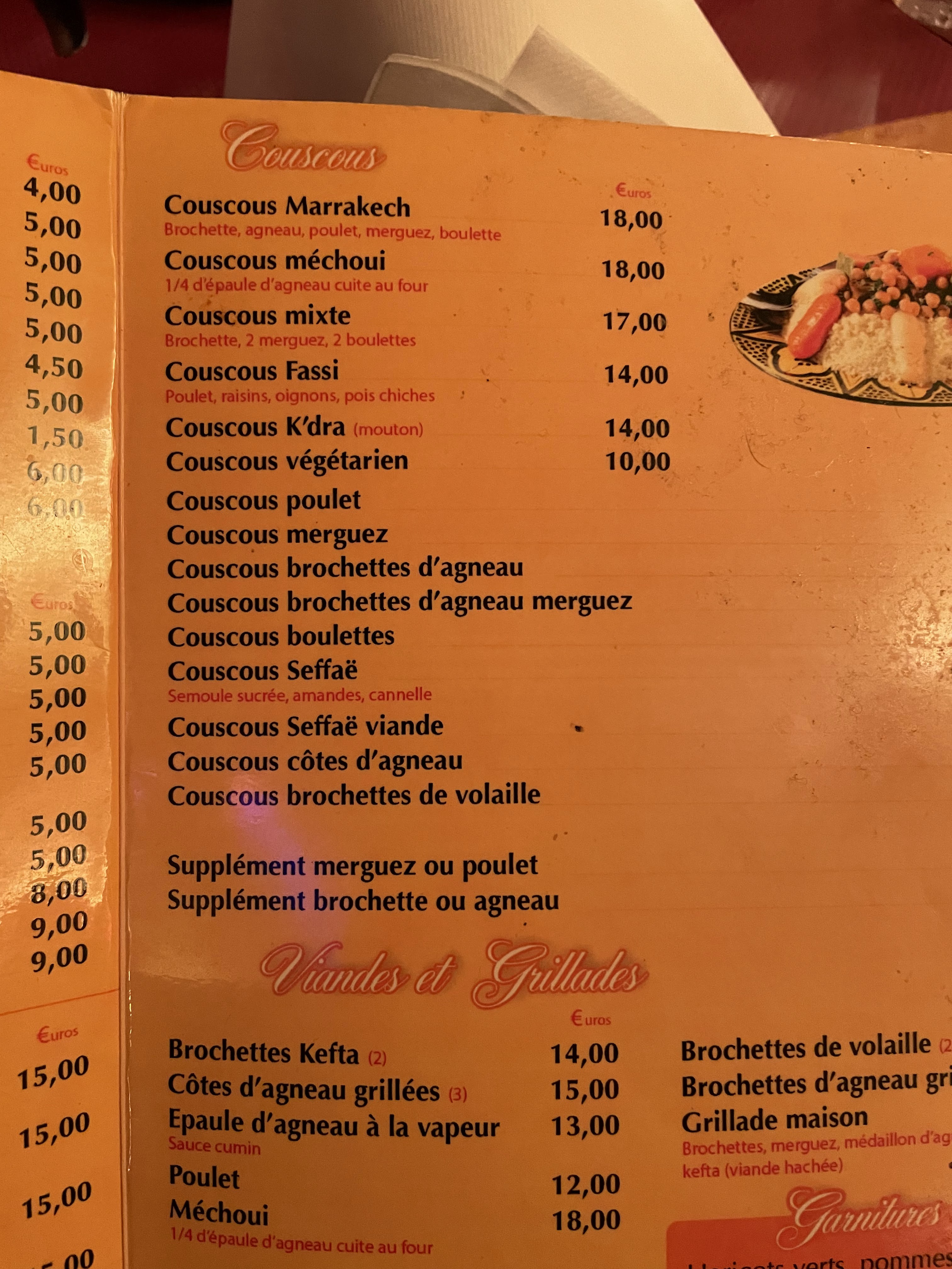 Un repas à 6 dans cet excellent restaurant. Nous avons absolument passer une très bonne soirée. Un cadre vraiment très beau, les couscous sont excellents. Les meilleurs de Paris, et sûrement même de France ! Des pâtisseries à en tomber à la renverse, sans oublier le thé à la menthe vraiment excellent. Le service était très bon, un serveur très gentil et un patron également accueillant. Nous n'hésiterons pas à revenir dans ce restaurant lors de notre retour à Paris. Ce fut une incroyable dégustation venu tout droit du Maroc. Merci pour tout.