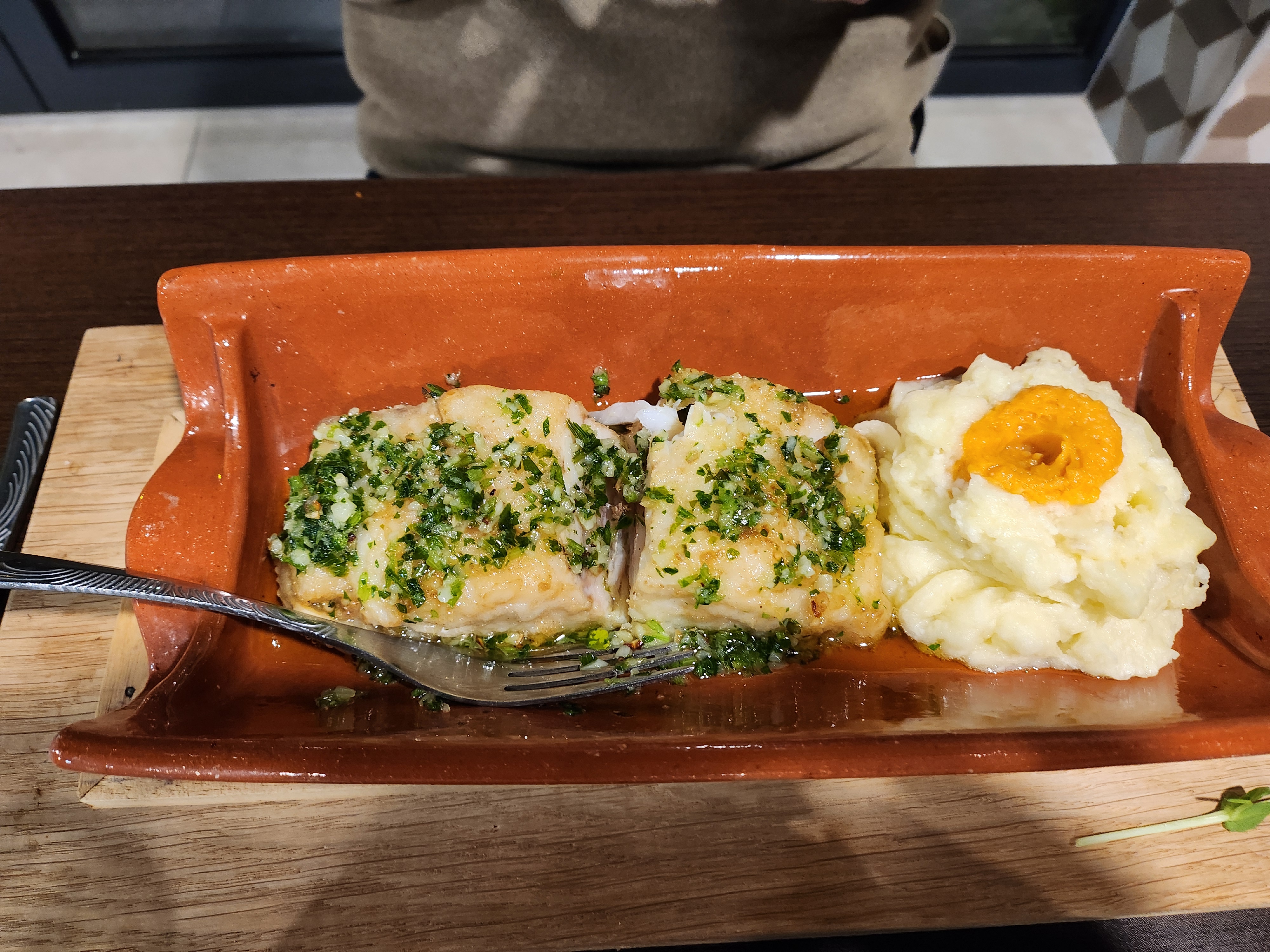 Plats très bons , mais malheureusement ma morue était très très sale , j’ai fait la remarque mais on a pas pensé à me proposer quelque chose d’autre à la place , ou bien au moins un geste commercial à la fin , on a juste eu droit à des excuses , c’est vrai que cela peut arriver mais quand on est commerçant on ensaye de se rattraper avec quelque chose ... car je suis partie avec faim car mon plat est resté dans mon assiette , c’est bien dommage car le goût était bon et très bien présenté . Dommage ! Déçu du coup ! Et d’avoir payé quelque chose que j’ai pas réussie à manger ...