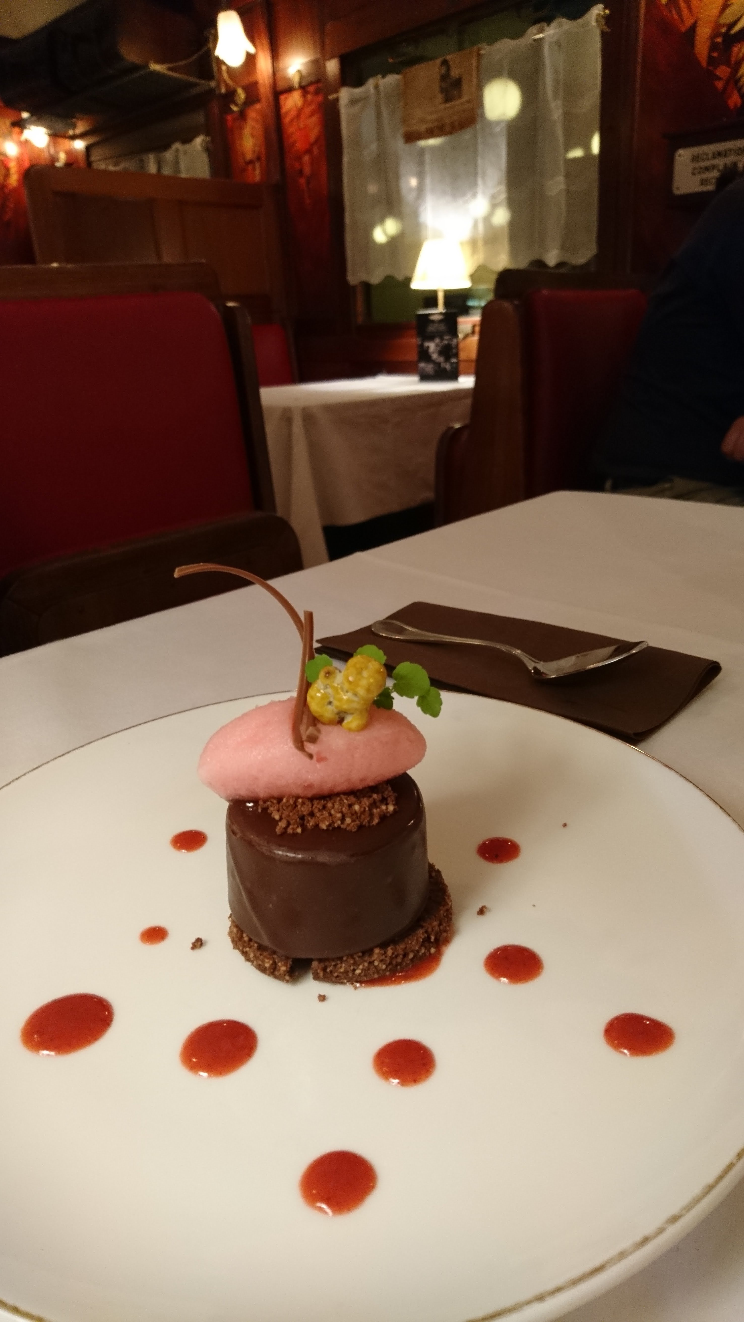 Ayant découvert ce restaurant par hasard, je décide après avoir regardé la carte sur leur site d'aller y faire un tour avec ma femme. L'entrée du restaurant se fait par le musée du chocolat présent à côté, mais reste tout de même très accessible. On se fait accueillir par le chef qui était au comptoir à ce moment là. Symbole Maître Restaurateur sur le tablier, un détail qui met en confiance. On est donc dirigé vers l'entrée du train qui sert donc de restaurant et rencontrons la serveuse qui nous trouve rapidement une table. L'endroit est vraiment accueillant et charmant. L'ambiance de ce train, de par sa décoration et la musique de fond, nous plus véritablement dans un autre monde. Malgré les apparences, les chaises du train sont très confortables et on peut y rester assis plusieurs heures sans problème. La salle ne contient que des tables de 4 personnes, mais les plus grands groupes peuvent être accueilli dans la salle de thé en face du comptoir si besoin. La carte contient peu de plats, mais ces derniers sont régulièrement changés, et une suggestion du soir nous est proposé. Nous commandons donc deux entrées, deux plats et deux desserts, ainsi qu'une boissons chacun. Le service était particulièrement rapide et les plats... Merveilleux. Un véritable plaisir pour le palais ! Tous les éléments ont du goûts et vont bien ensemble, l'assiette est travaillée, gourmande et donne vraiment envie. Nous nous en sortons pour une addition de 111€, peut être un tantinet trop cher, mais avec aucune déception. Un restaurent que je recommande à tout le monde, mais surtout un très joli cadre pour les couples.