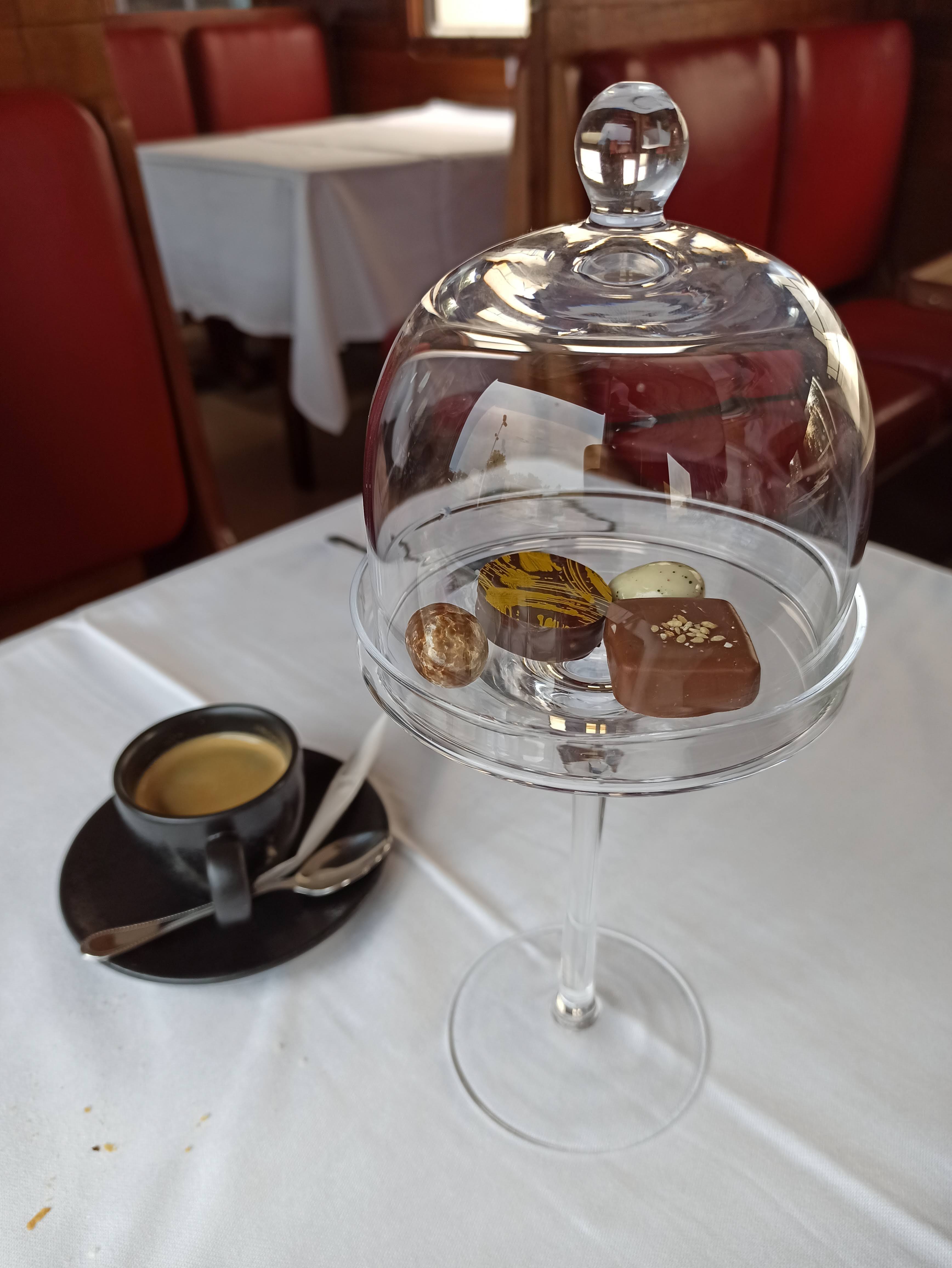 Cadre agréable on dine dans un des wagons de L'orient express. Frais en hivers (simple vitrage) Belles présentations et associations de goûts originales. Choix d'une cuisine à base de chocolat (restaurant du musée du chocolat)