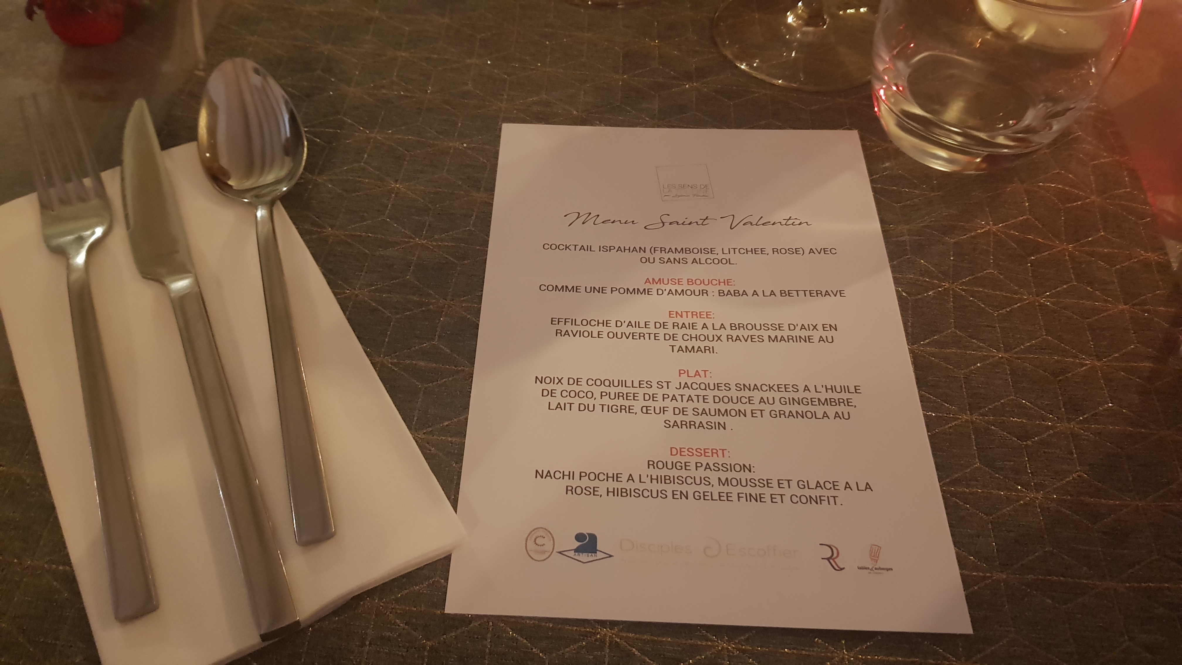 Une fabuleuse découverte pour un avant goût de la St Valentin. Saveurs et couleurs présentes de la mise en bouche au dessert même pour un menu emporté. Je recommande à 100%