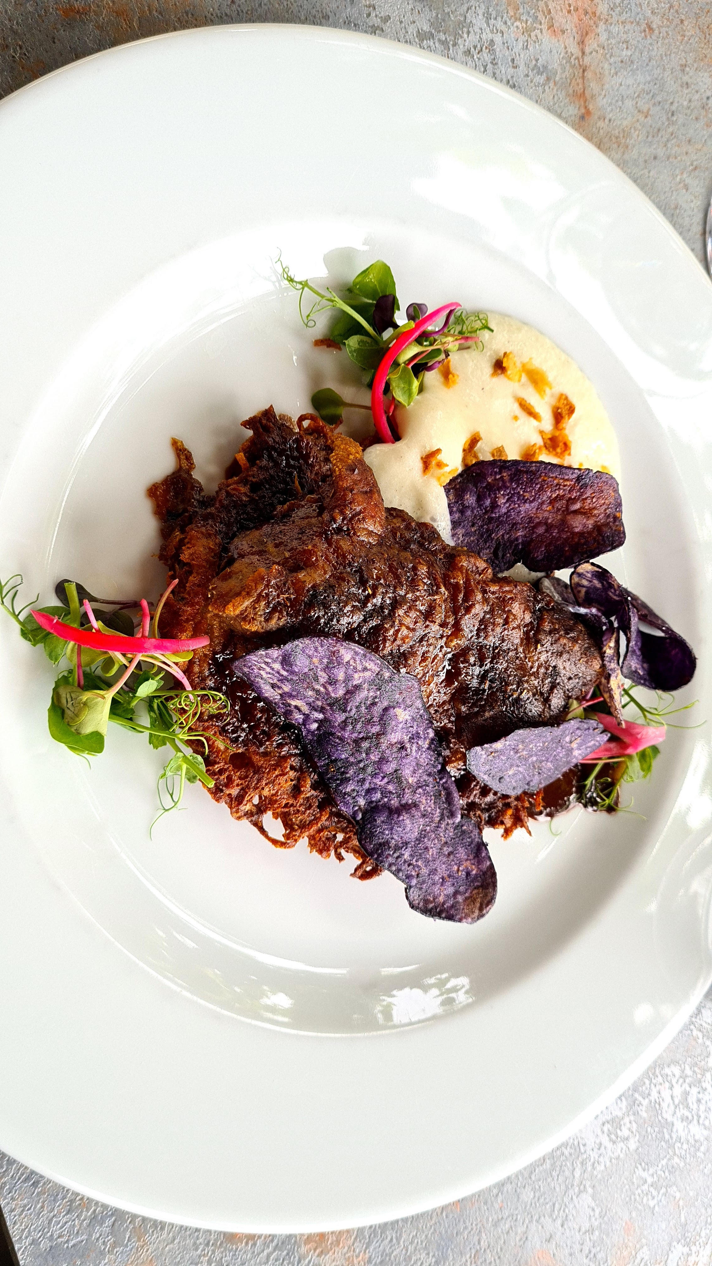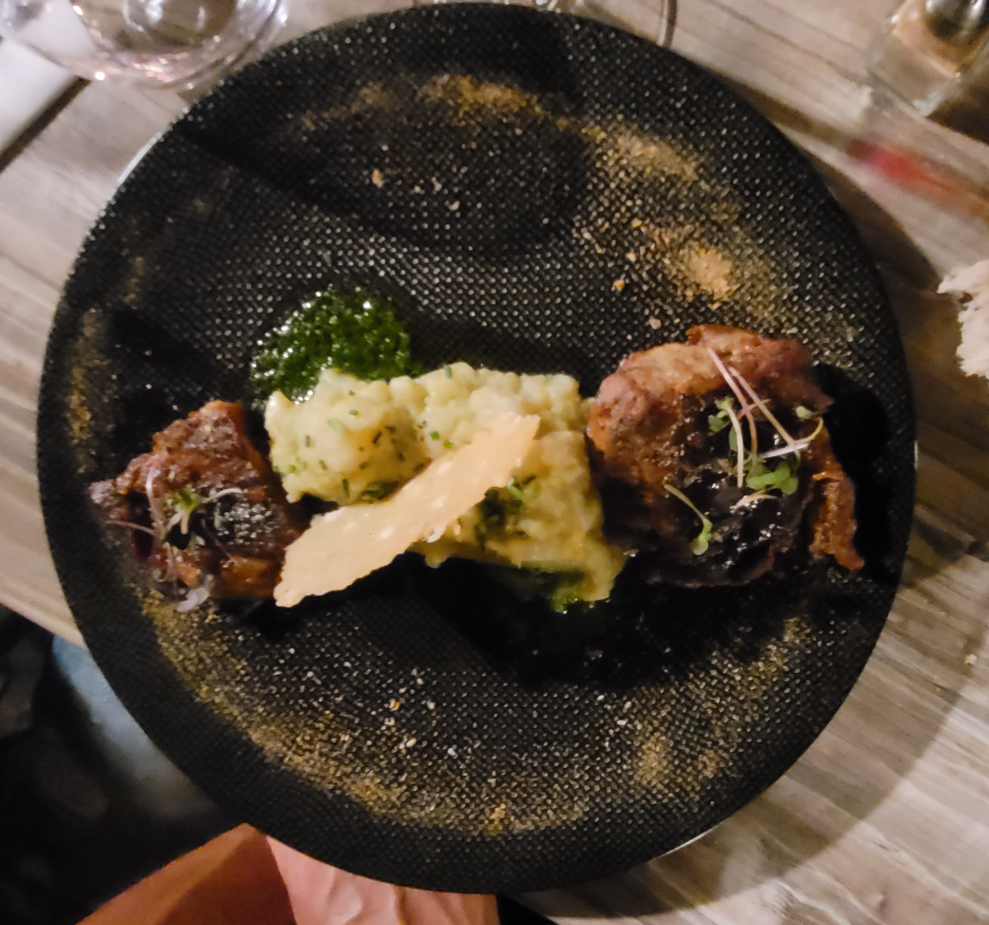 Une horreur, une souris d'agneau bouillie avec une pâtée d'ail noir😵💫😵💫😵💫 des filets de poulet sauce bizarre, accompagnés de pomme de terre, cuite certainement en début de semaine..Une salle vide de clients , c'est logique. Le cuisinier propriétaire des lieux devrait changer de métier, cela éviterait de descriditer la profession.A éviter absolument.........🤬🤬🤬🤬