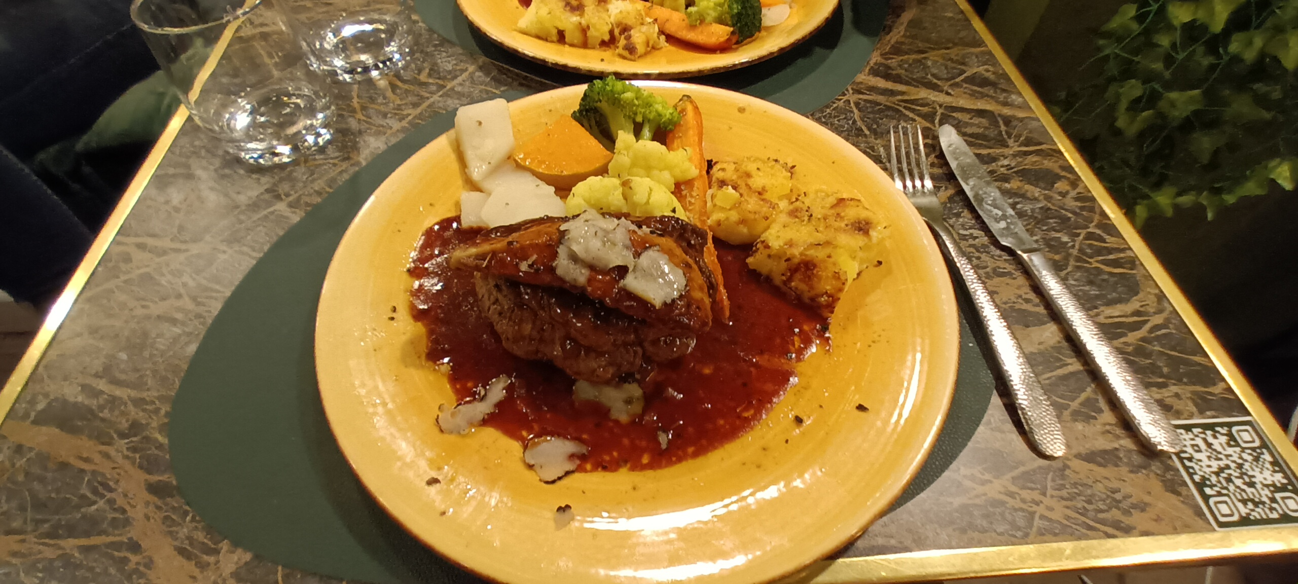 J'ai commandé Filet be bouf. La viande est magique. Vendu avec sauce aux truffes, foie gras, légumes au four. Prenez de la viande cuite au niveau du chef. P.S. Les plats sont servis strictement selon l'étiquette. Si quelqu'un de votre entreprise a commandé un apéritif, les plats principaux ne seront apportés à personne tant qu'il n'a pas terminé.