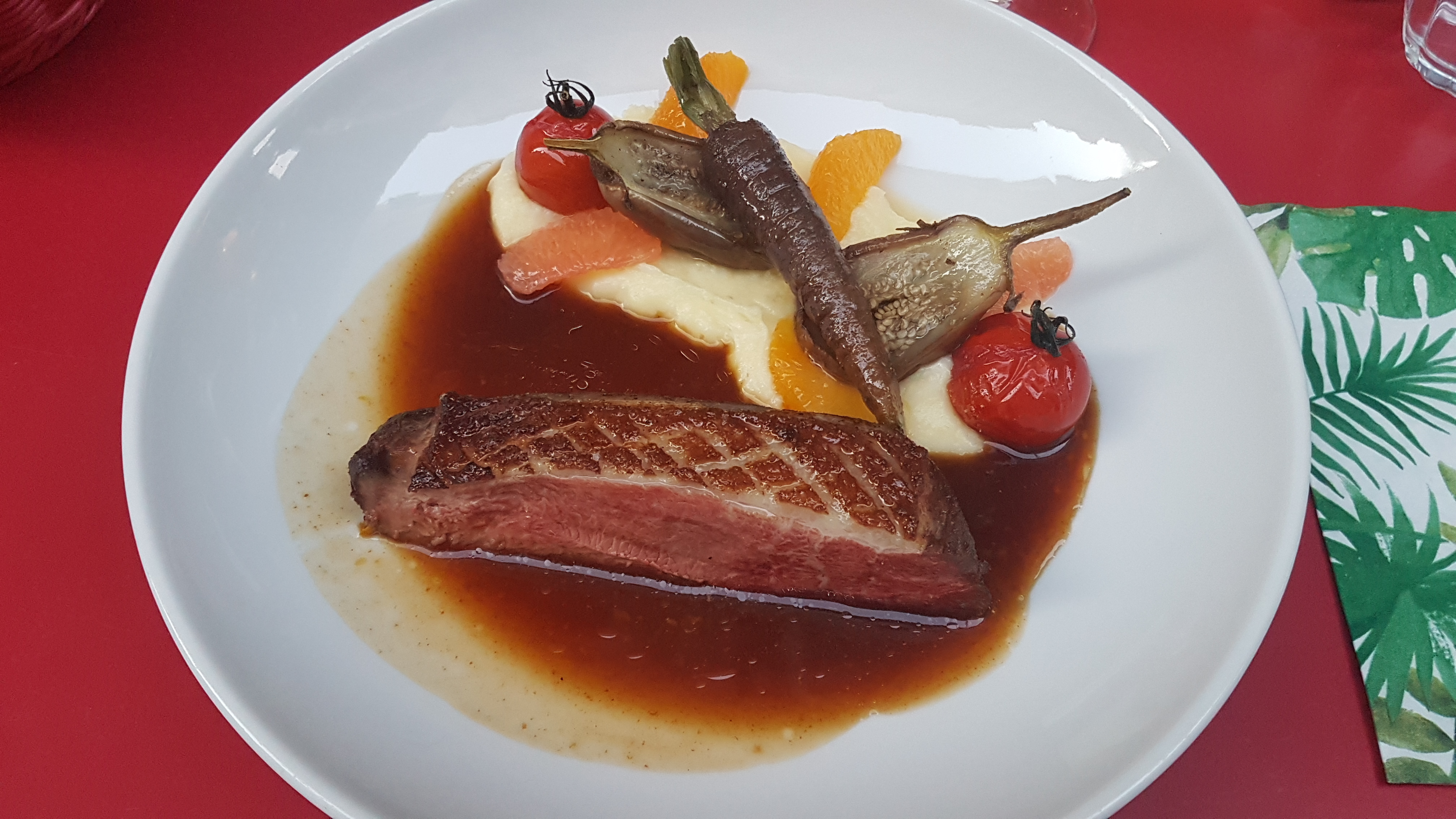 Entrée de calamar , 1/2 magret de canards aux agrumes, fondant au chocolat .tout est bon