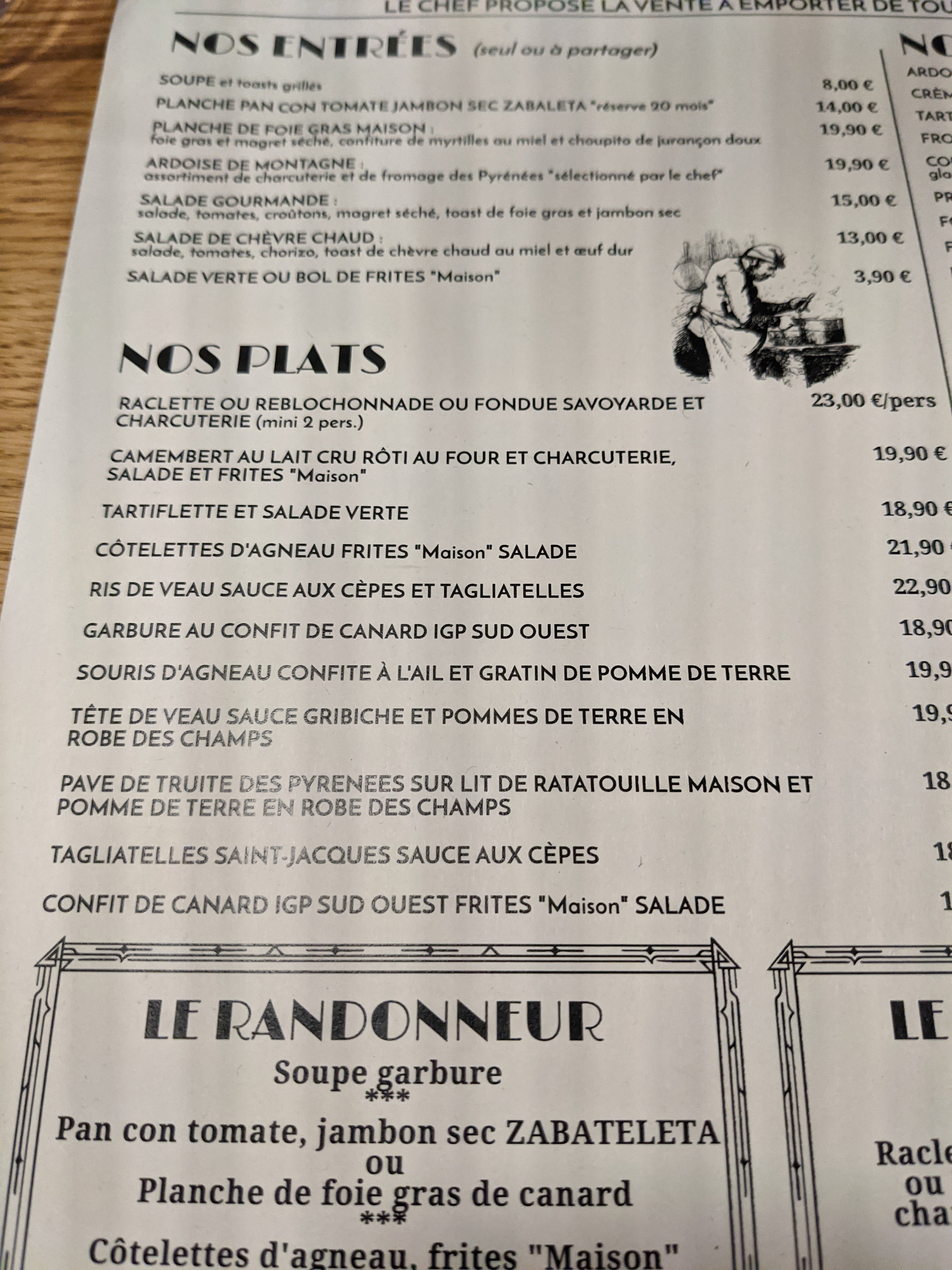 Excellent restaurant, les assiettes sont copieuses et le rapport qualité/prix est très bien. Nous avons pris le menu à 23€ qui comprend une garbure une fondue avec de la charcuterie et une fondue au chocolat. Tout était très bon.