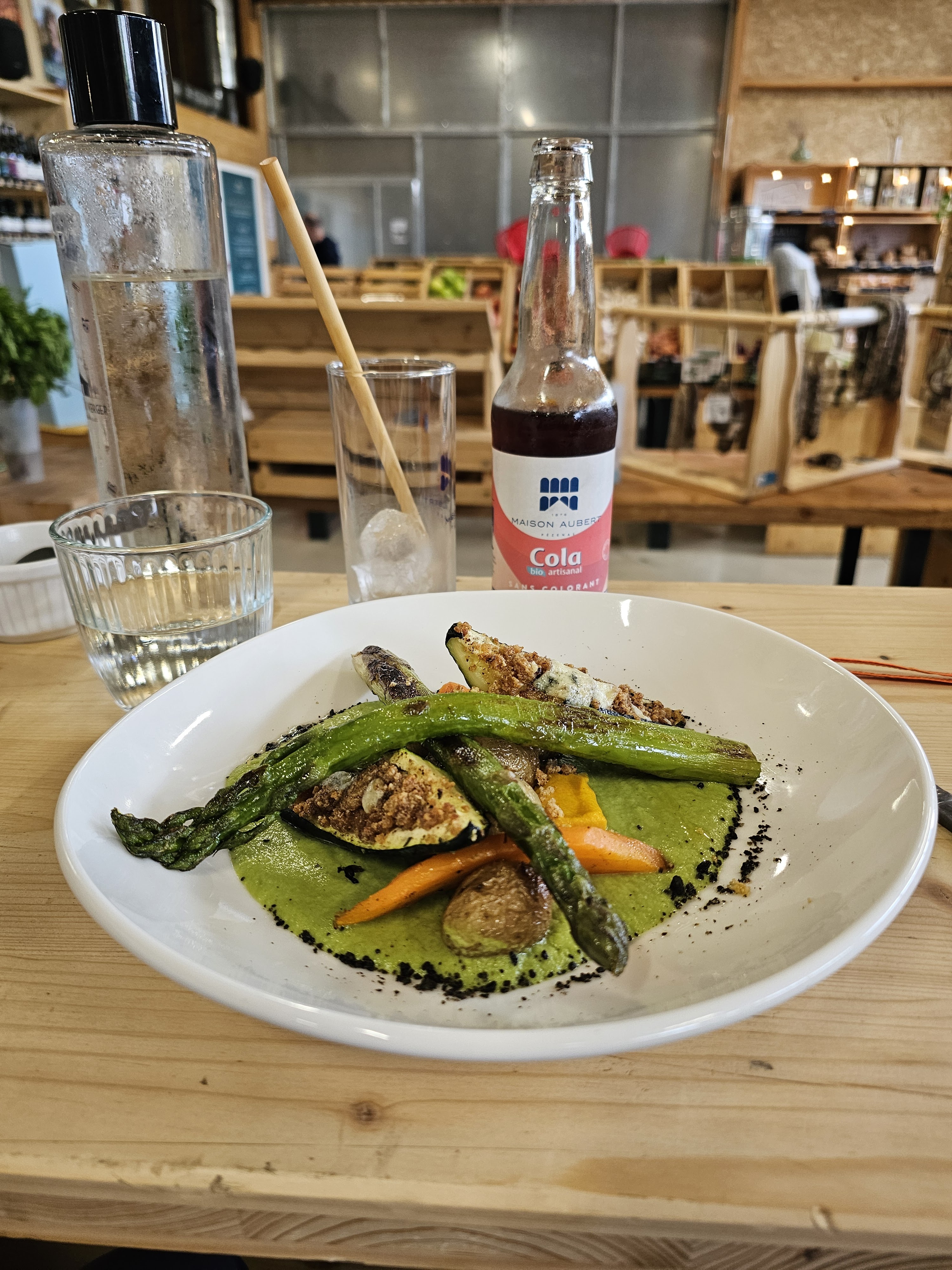 J'ai récemment visité ce nouvel établissement, et j'ai été impressionné par la magnifique bâtisse en bois, ainsi que par le coin épicerie bio et la variété de boissons proposées. Cependant, mon expérience a été ternie par le comportement distant et froid de la serveuse. L'offre de tapas est actuellement limitée à une planche de fromage ou de charcuterie, ce qui pourrait être enrichi pour offrir plus de choix aux clients. Un autre point négatif est que nous avons été envahis par les guêpes, qui se posaient sur nos boissons et notre nourriture, ce qui a rendu notre expérience encore moins agréable. J'espère que lors de ma prochaine visite, l'amabilité du personnel sera au rendez-vous, car cela pourrait améliorer considérablement l'expérience globale dans ce bel établissement.