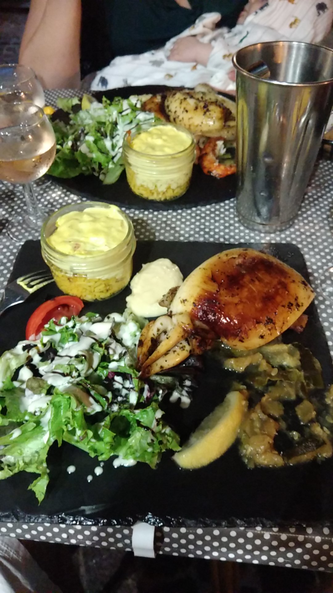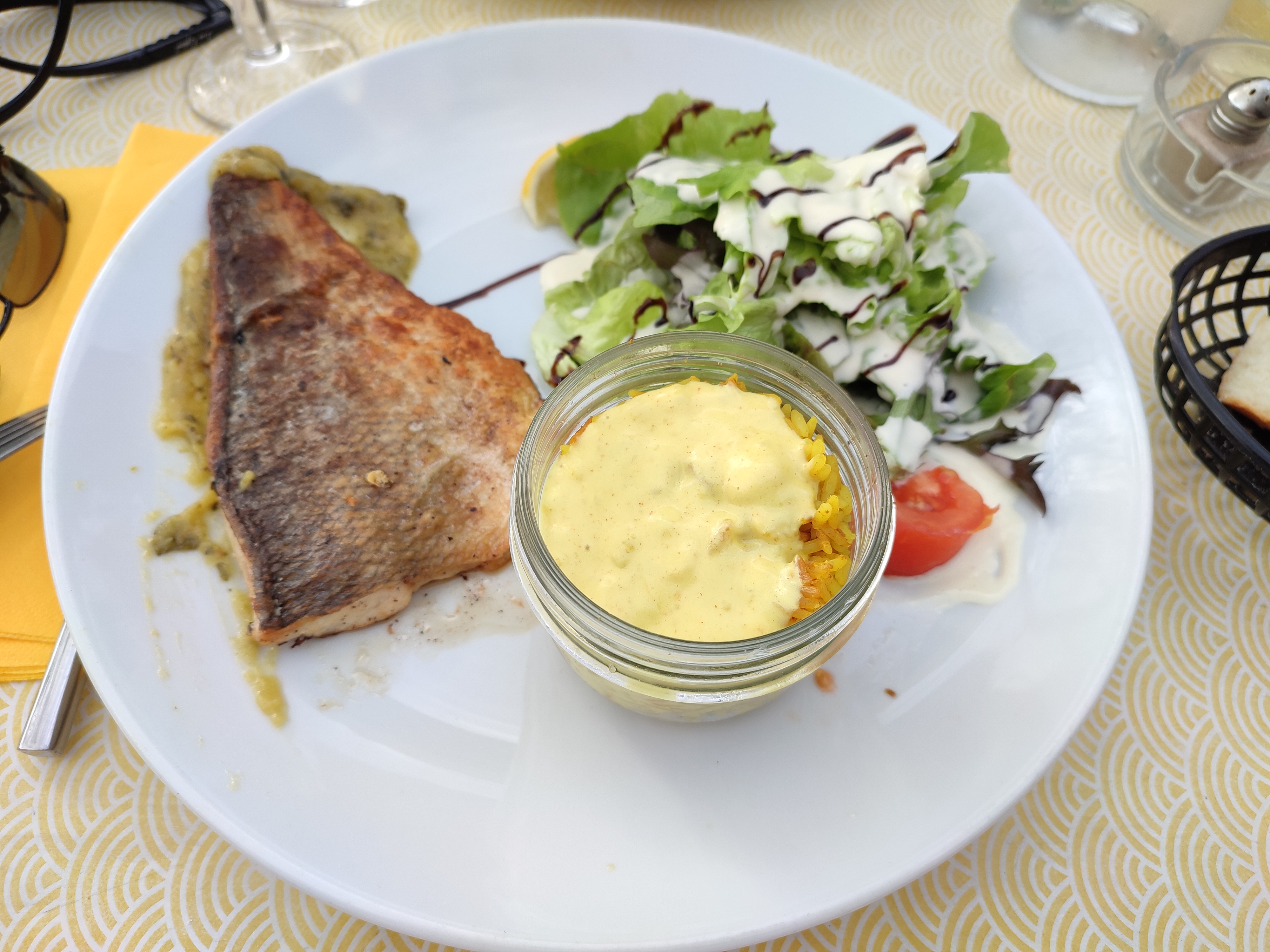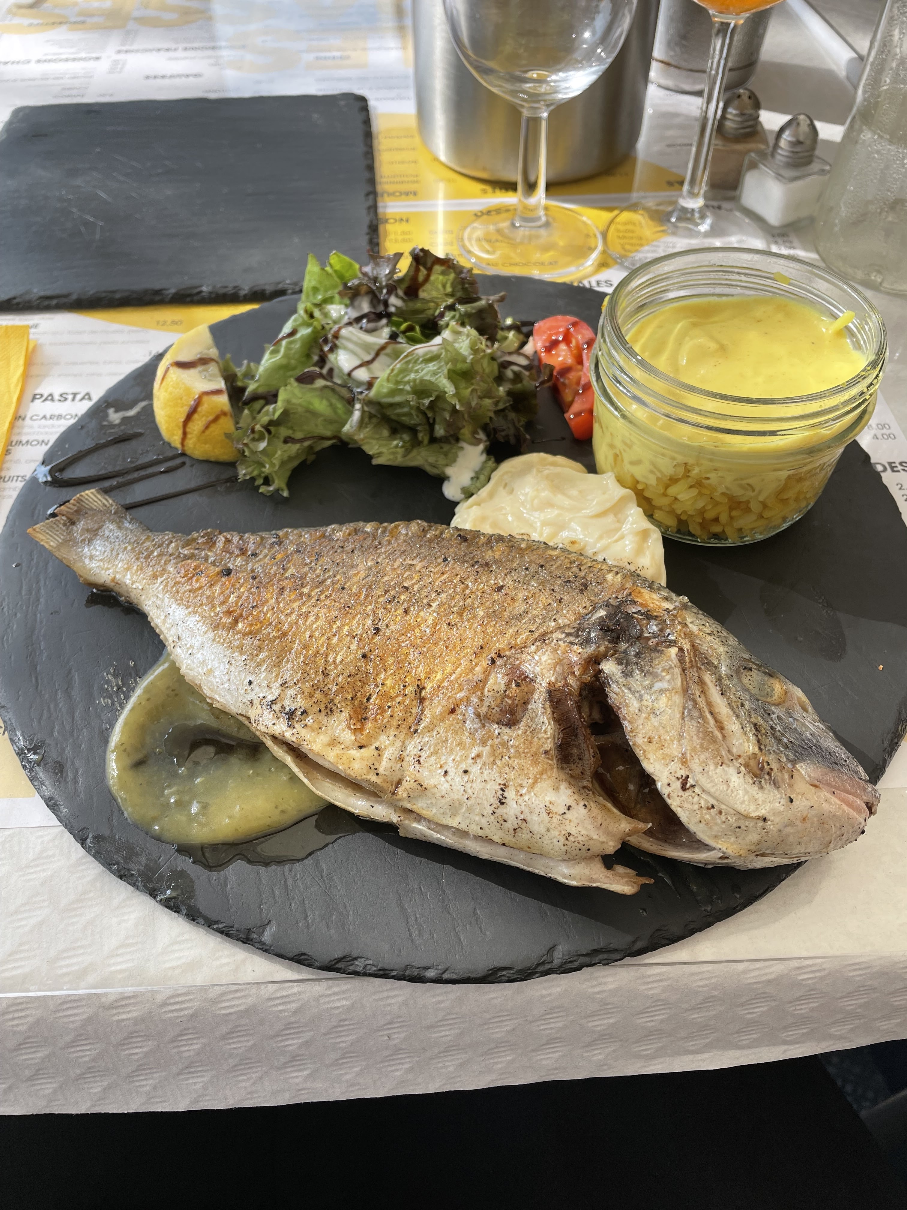 Un régal bonne cuisson, bonne assaisonnements accompagner de son riz safranée et sauce curry les fruits de mer et son aïoli tout simplement bon .