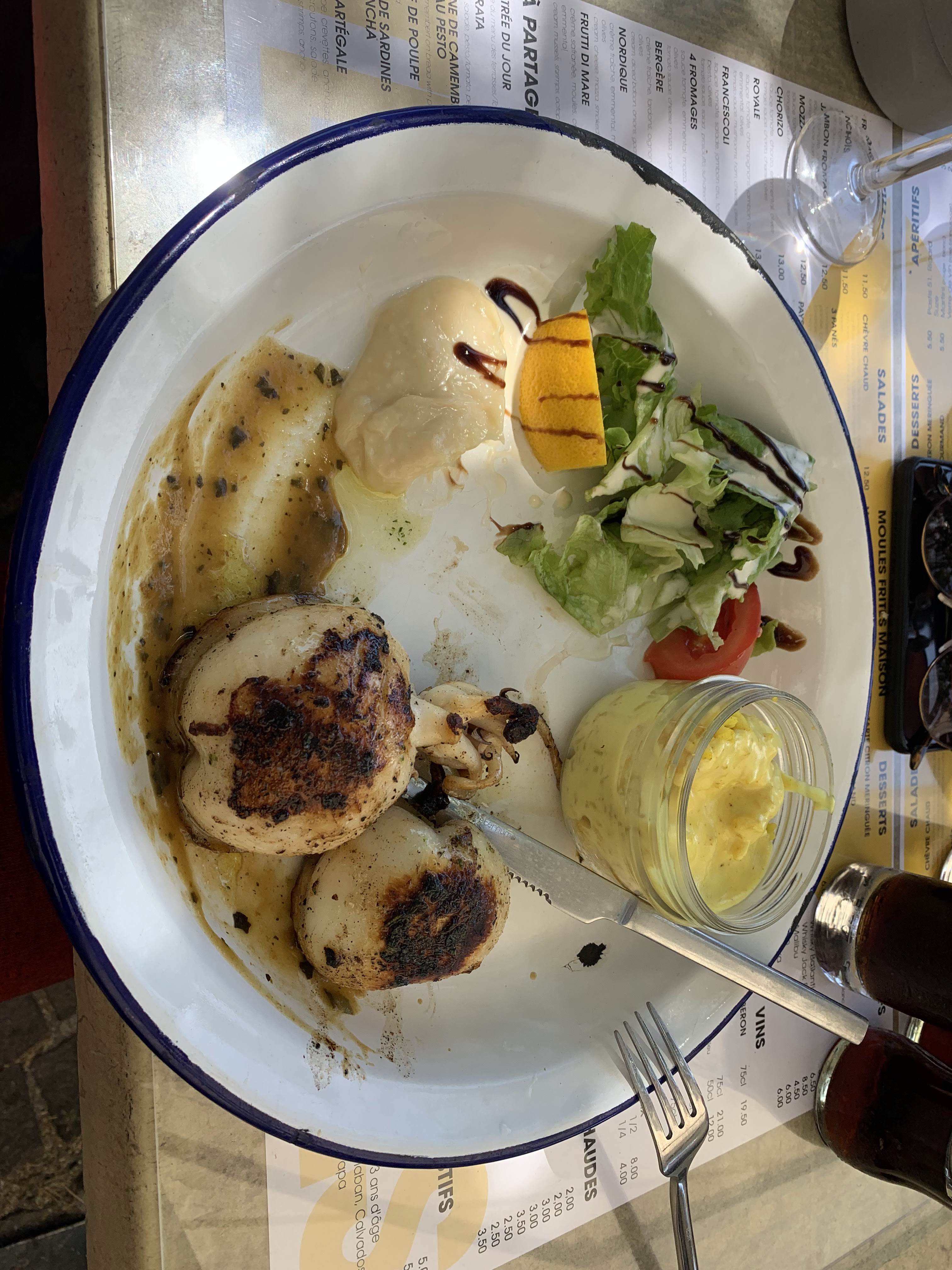 J'ai pris le menu du jour (entrée du jour, plat et café) à 14€90 accompagné d'un bon pastis à 2€50. Entrée: salade de melon et jambon cru -> résultat affreux, melon mal découpé et portion de jambon cru ridicule Plat du jour: filet de loup, riz safrané et caviar de courgette -> ensemble très bon mais je n'ai presque pas eu de purée de courgette, portion assez petite. Au final, je suis restée sur ma faim. Mes amis ont plutôt appréciés le repas (ils ont pris des moules et l'escalope de veau spéciale). Les prix sont très raisonnables notamment pour l'apéritif. Le service est amical. Belle vue ! Mitigé dans l'ensemble