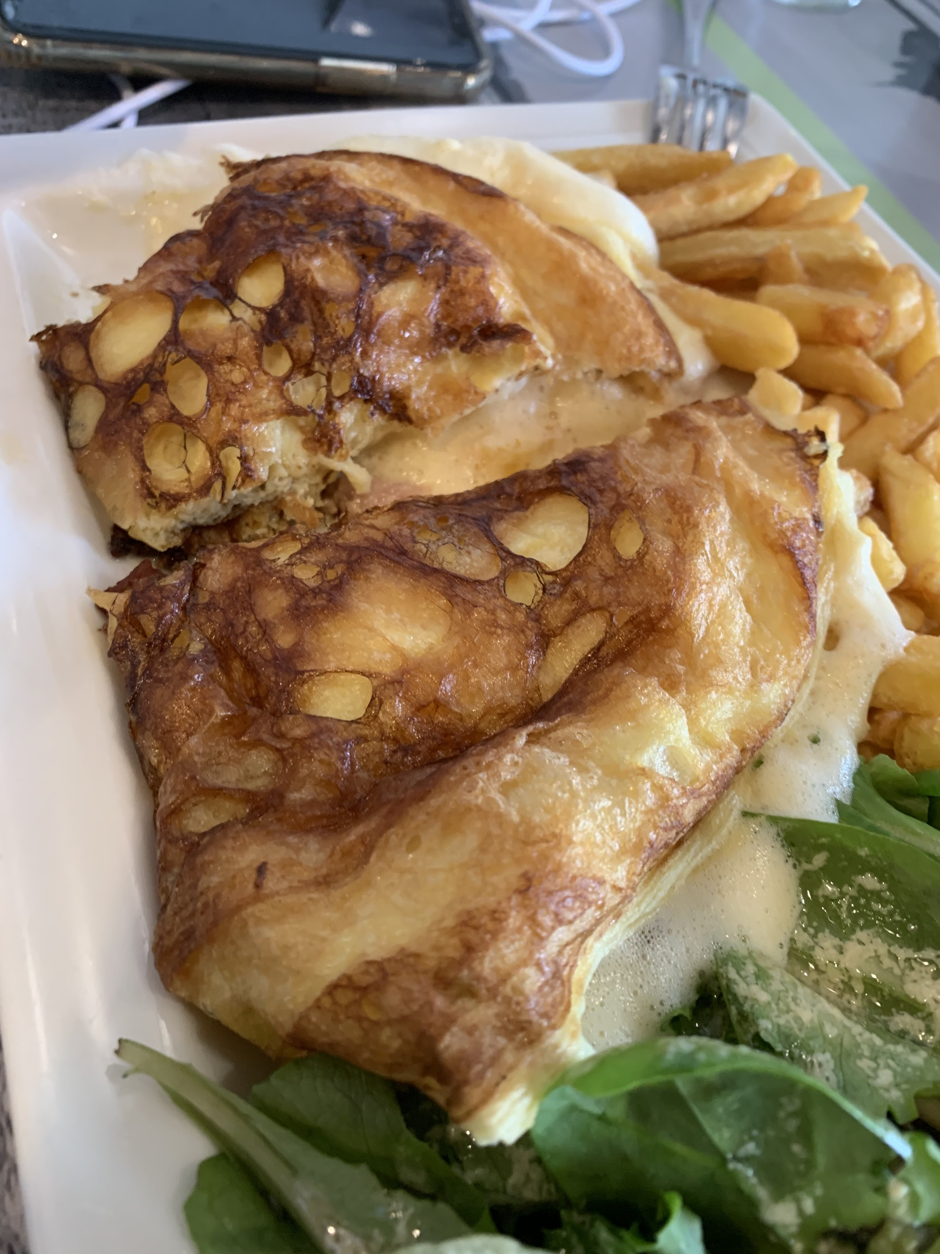 La nourriture était typique. La crêpe était standard, l'omelette était le spécial moelleux de San Michael. La tarte aux pommes était plutôt bonne. La vue sur la baie était incroyable. Notre serveur était dessus. Donc globalement plutôt bien.