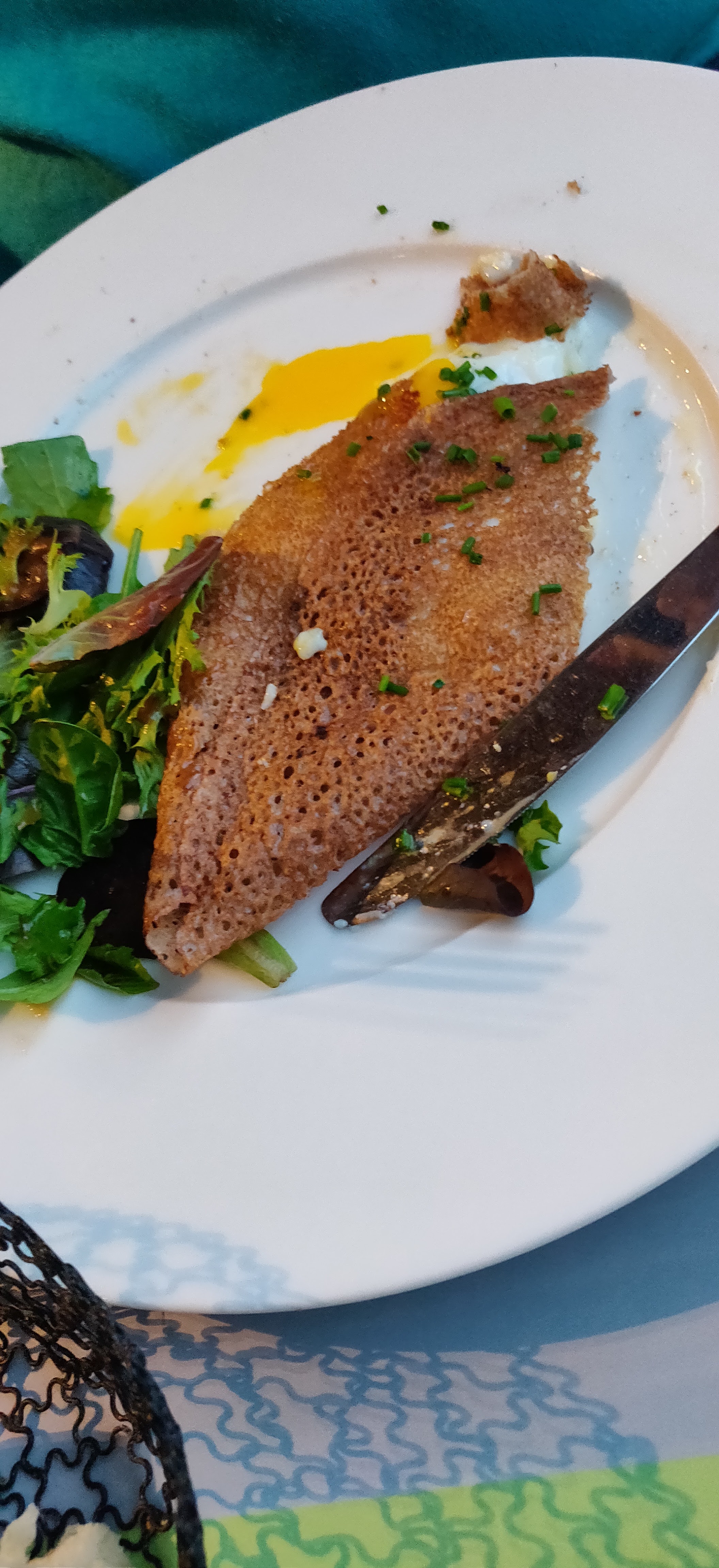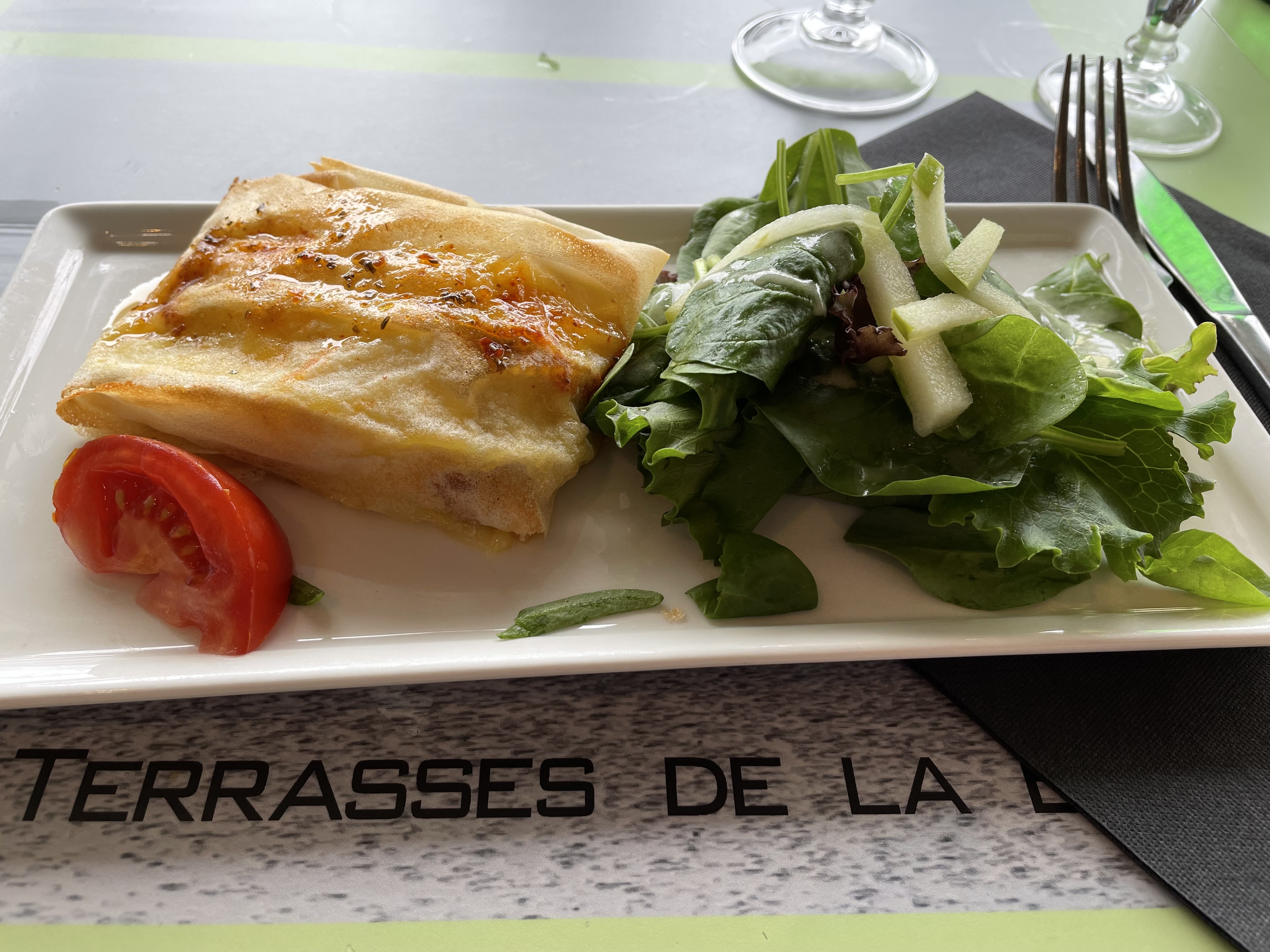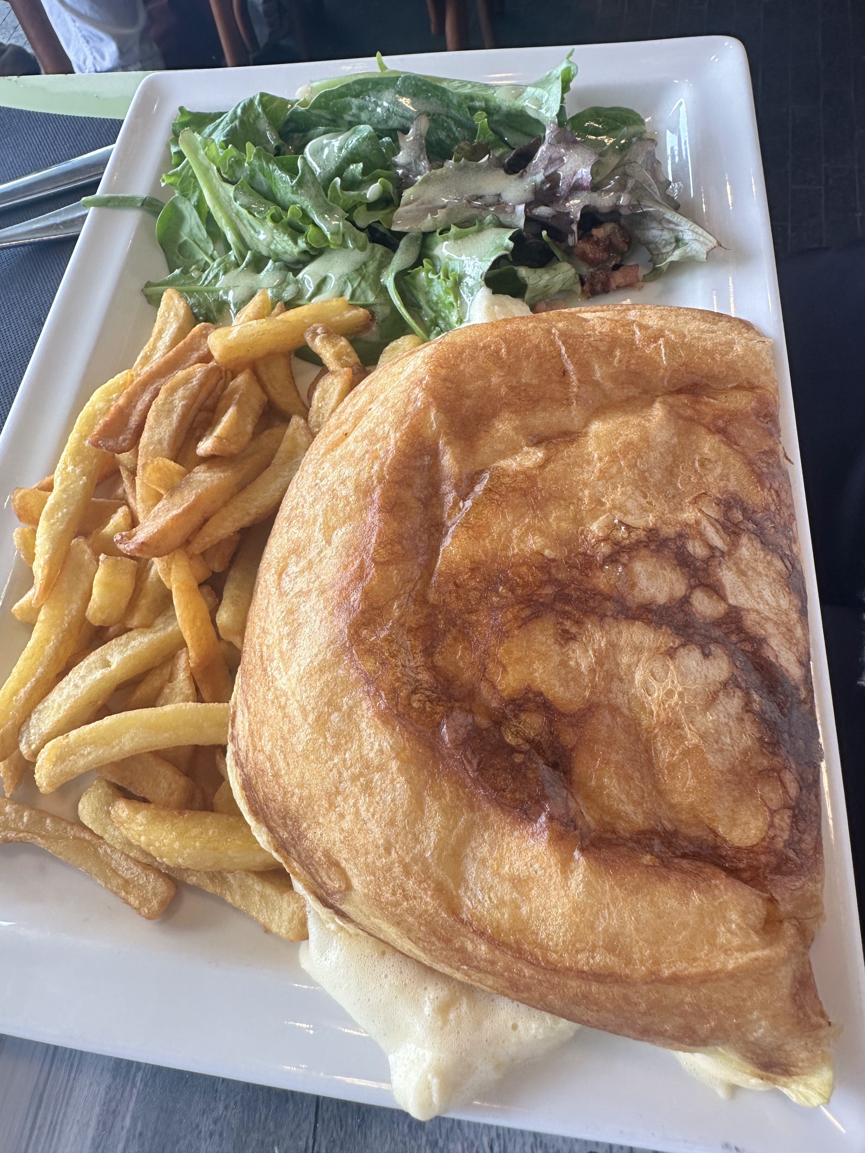 Une galette sans saveurs (dommage pour la région) avec des oignions encore blancs et 2 bouts de tomates. Le chef n’aurait pas pu faire moins. Jolie vue et addition salée, c’est tout !