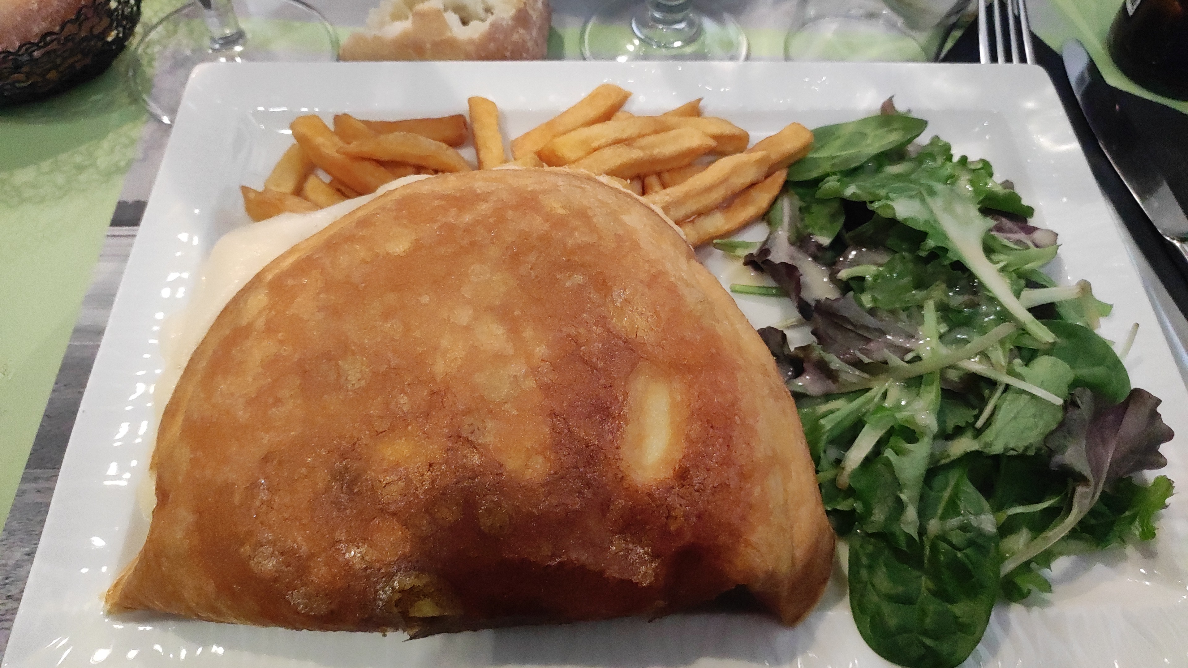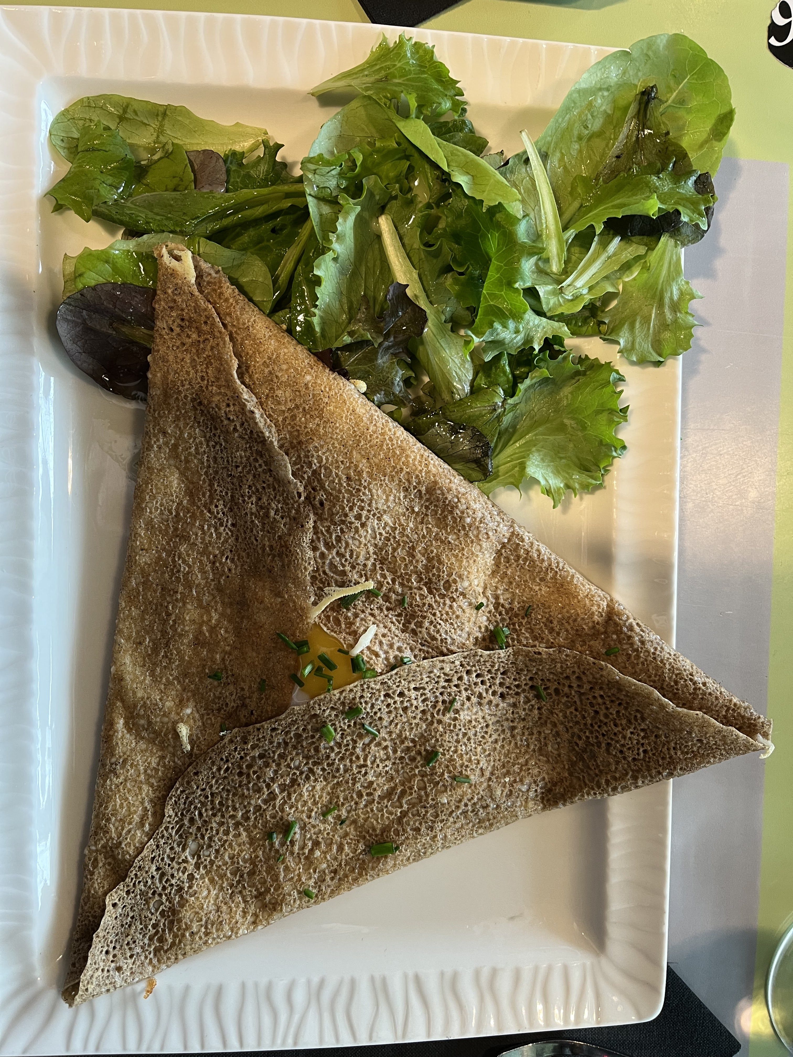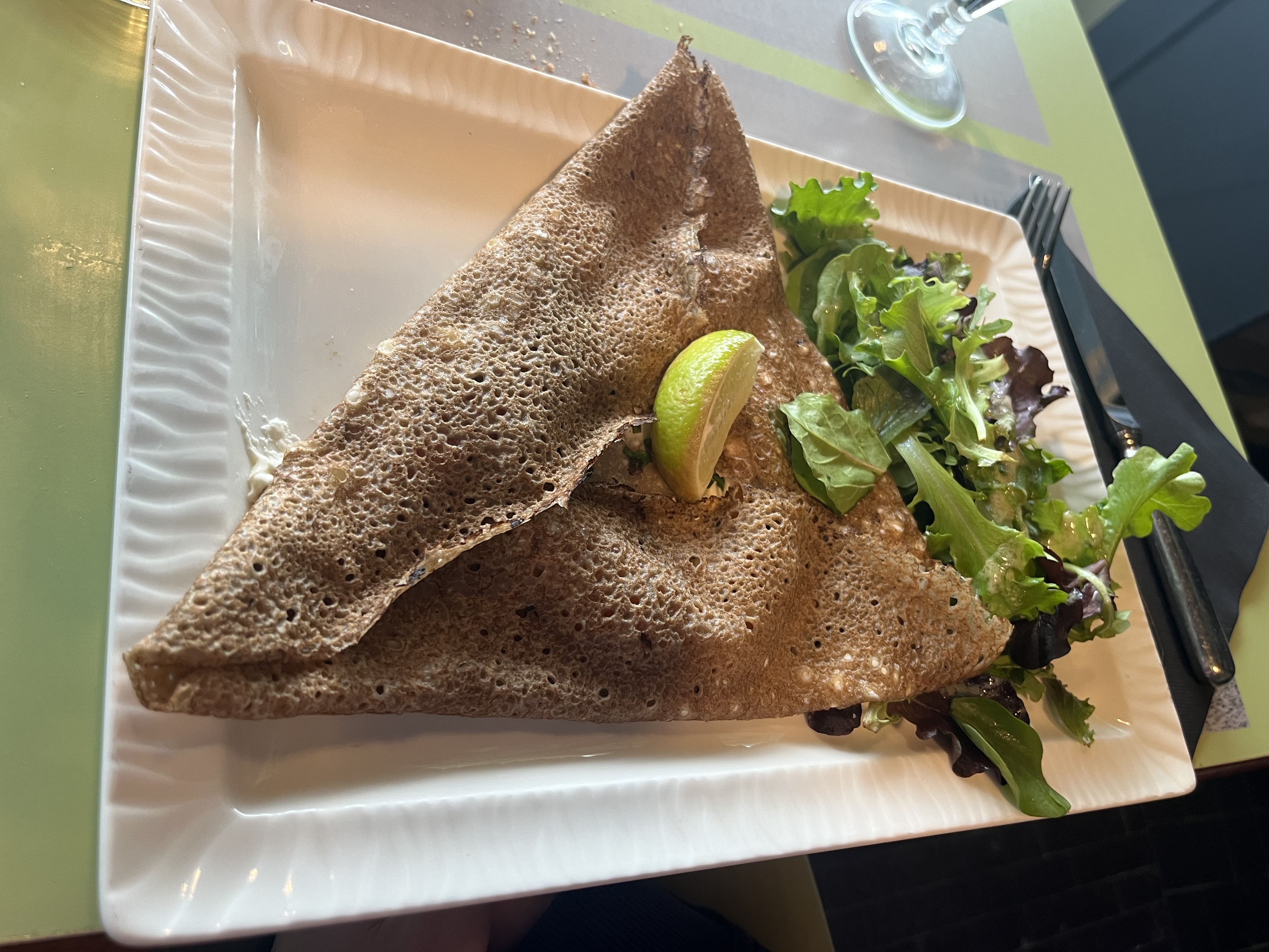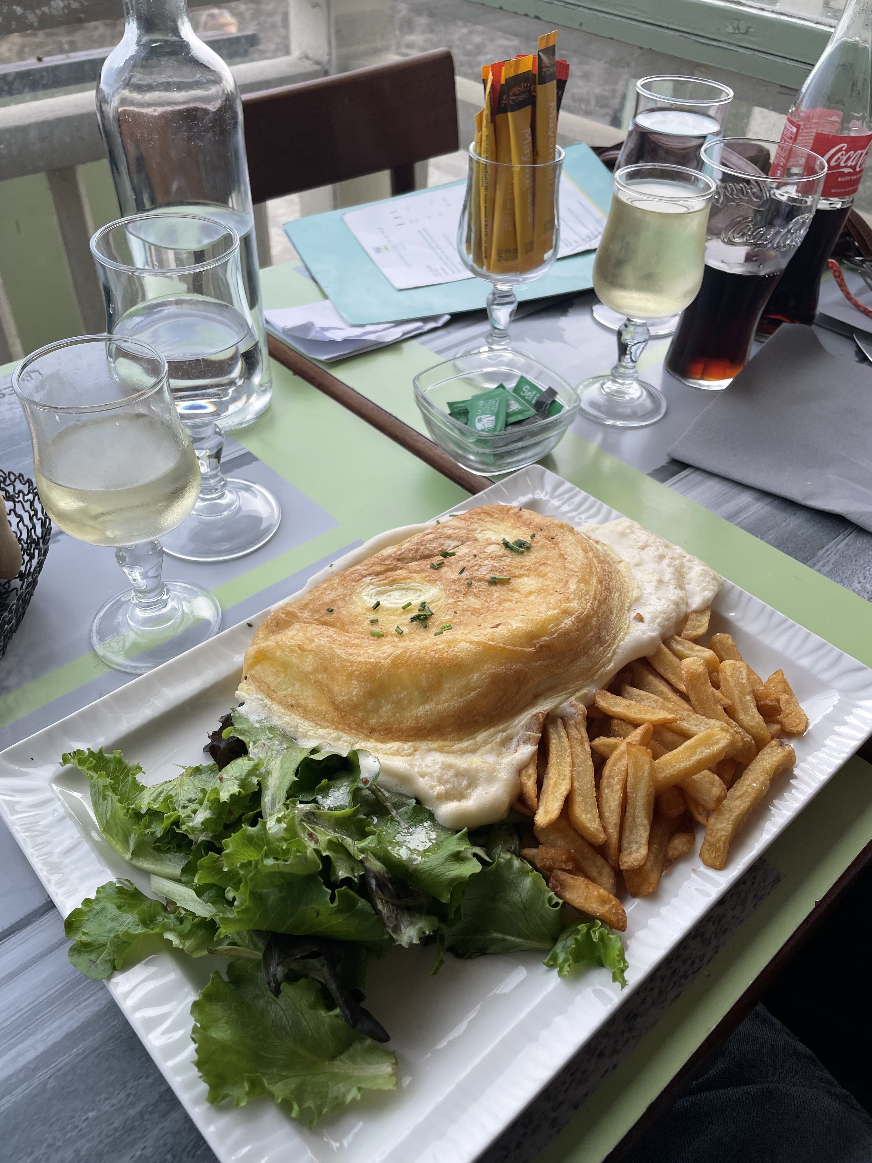 Une galette sans saveurs (dommage pour la région) avec des oignions encore blancs et 2 bouts de tomates. Le chef n’aurait pas pu faire moins. Jolie vue et addition salée, c’est tout !