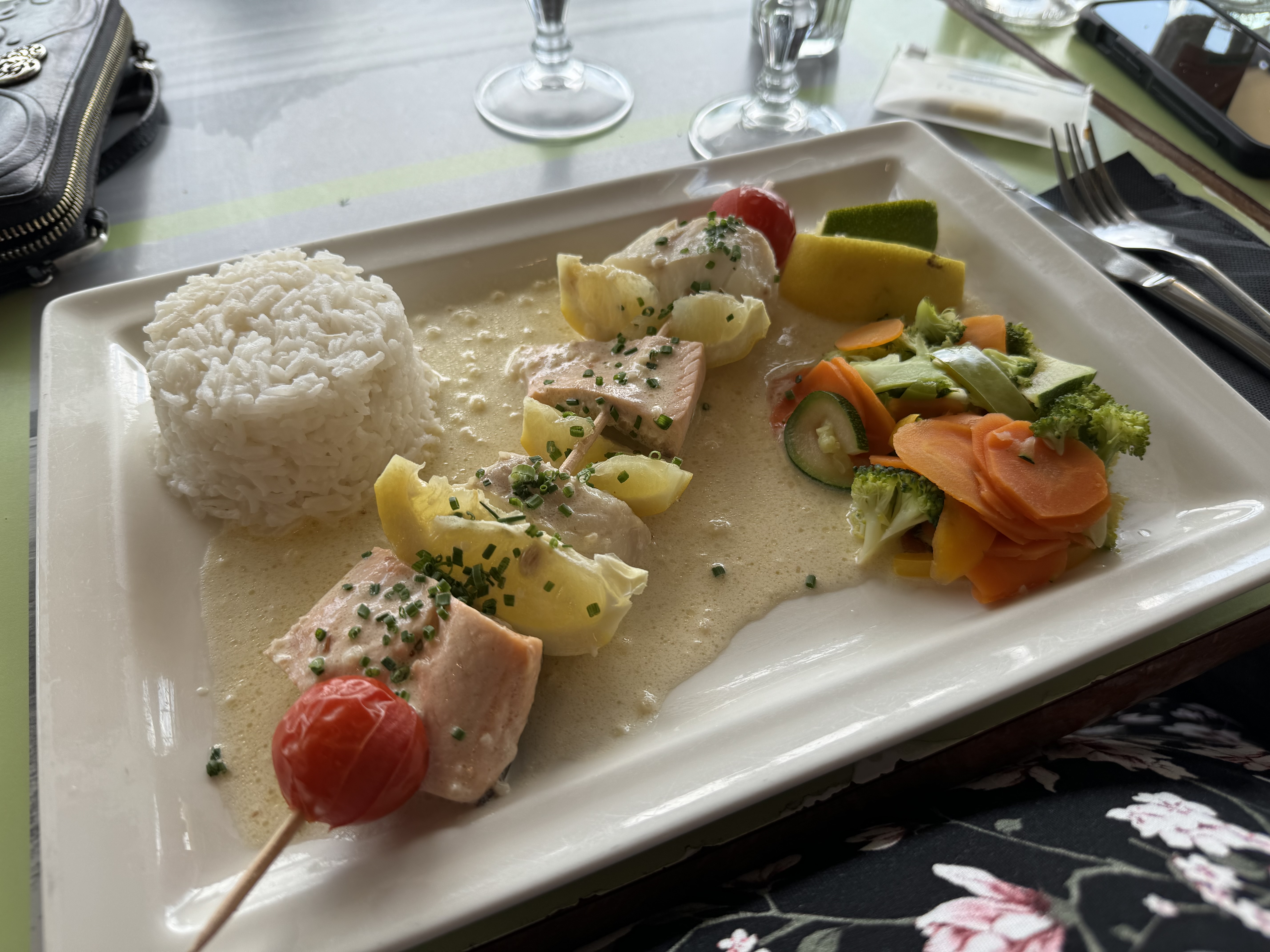 Nous apprécions la nourriture qui nous est servie après notre montée à l'abbaye. Brochette Saumon Cabi & Omellete commandée. Notre serveur Alice est gentille et agréable.