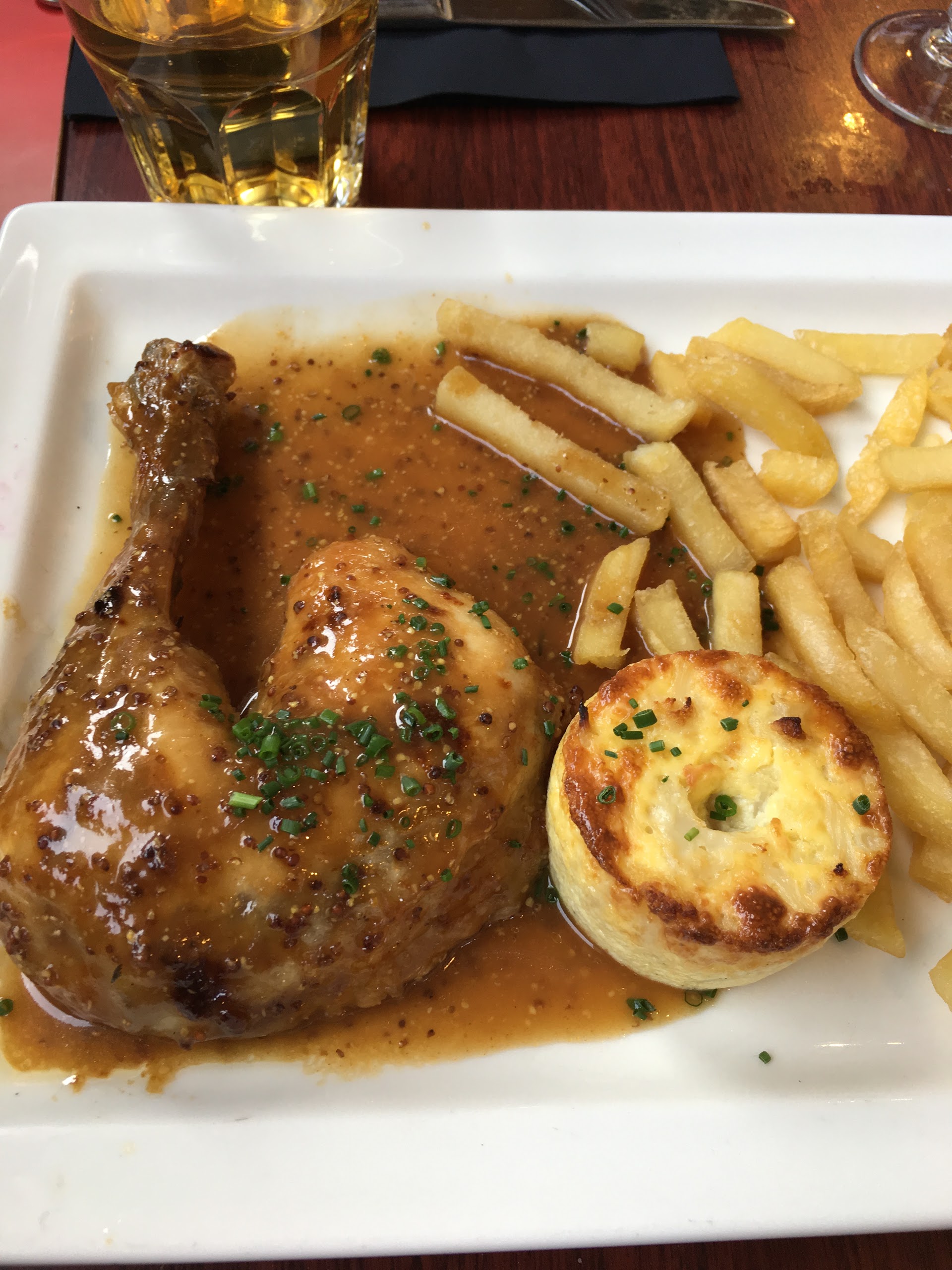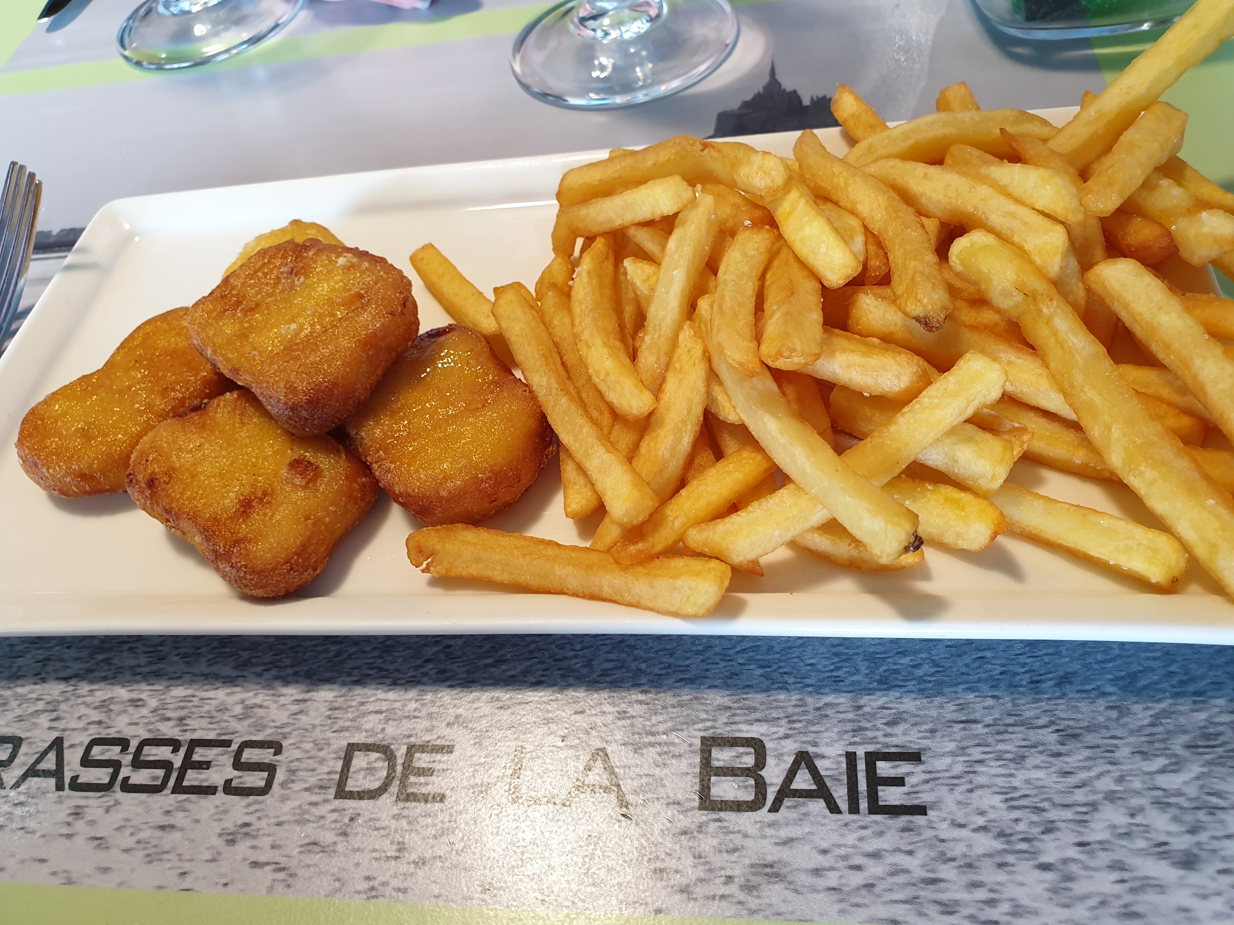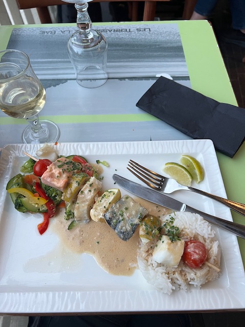 Première fois au Mont-Saint-Michel l’occasion de se régaler dans un restaurant qui propose une vue sur la baie. Malheureusement très déçue du restaurant choisi… Restaurant pas vraiment propre, avec du personnel pas très souriant. J’ai opté pour le menu entrée + plat à 29€ : un camembert chaud emballé dans une feuille de brick aspergé d’huile et de l’agneau au curry baignant également dans l’huile, servie avec une quantité de riz juste ridicule… les photos parlent d’elles même… je déconseille !